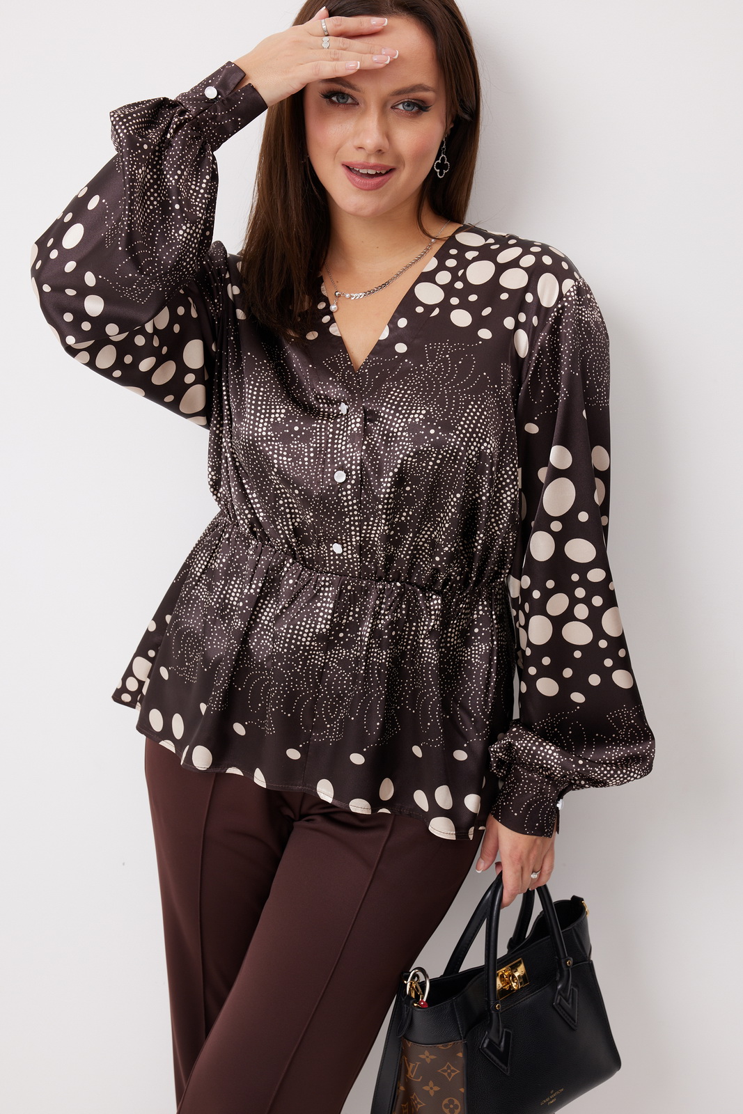 Блуза свободного кроя. Передняя часть на притачной планке, имеющей застёжку на петли-пуговицы. V-образный вырез формирует красивое декольте.