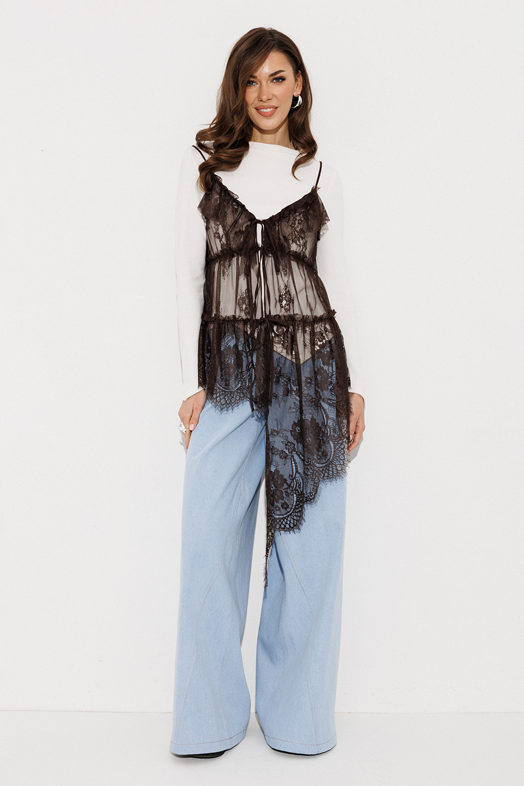 Описание: Блузка из кружева без подкладки на регулируемых бретелях и асимметричным низом. Полочка с V-образным вырезом и центральной застежкой на завязки. По горловине, пройме и спинке вверху вставлен волан со сборкой. По полочке и спинке настрочены рюши горизонтально.