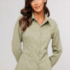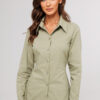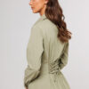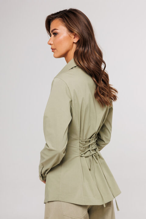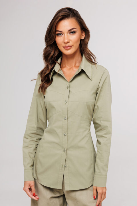 Описание: Блузка полуприлегающего силуэта, с втачным одно шовным рукавом, со складкой и манжетой, с застежкой на петлю-пуговицу. Полочка с центральной застежкой на петли-пуговицы и с фигурными подрезами, имитирующими лиф. Спинка с рельефами и шнуровкой от рельефов. Воротник рубашечный отложной на стойке. Спинка и полочка с фигурным низом.