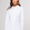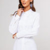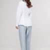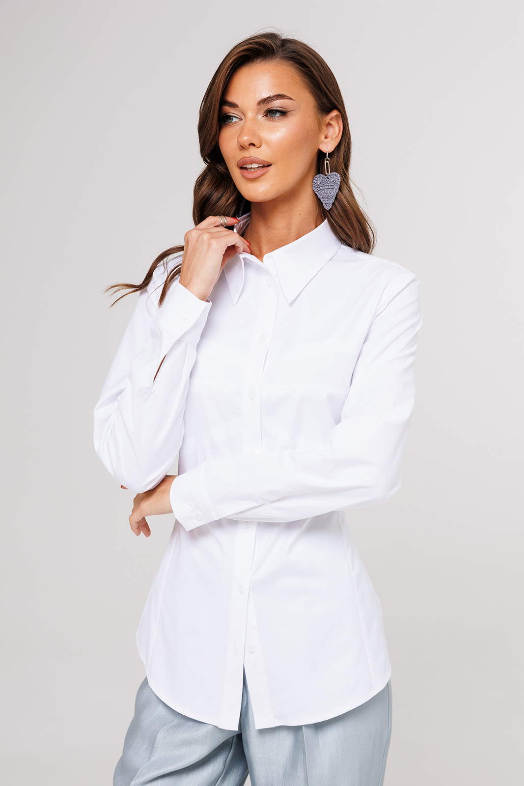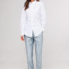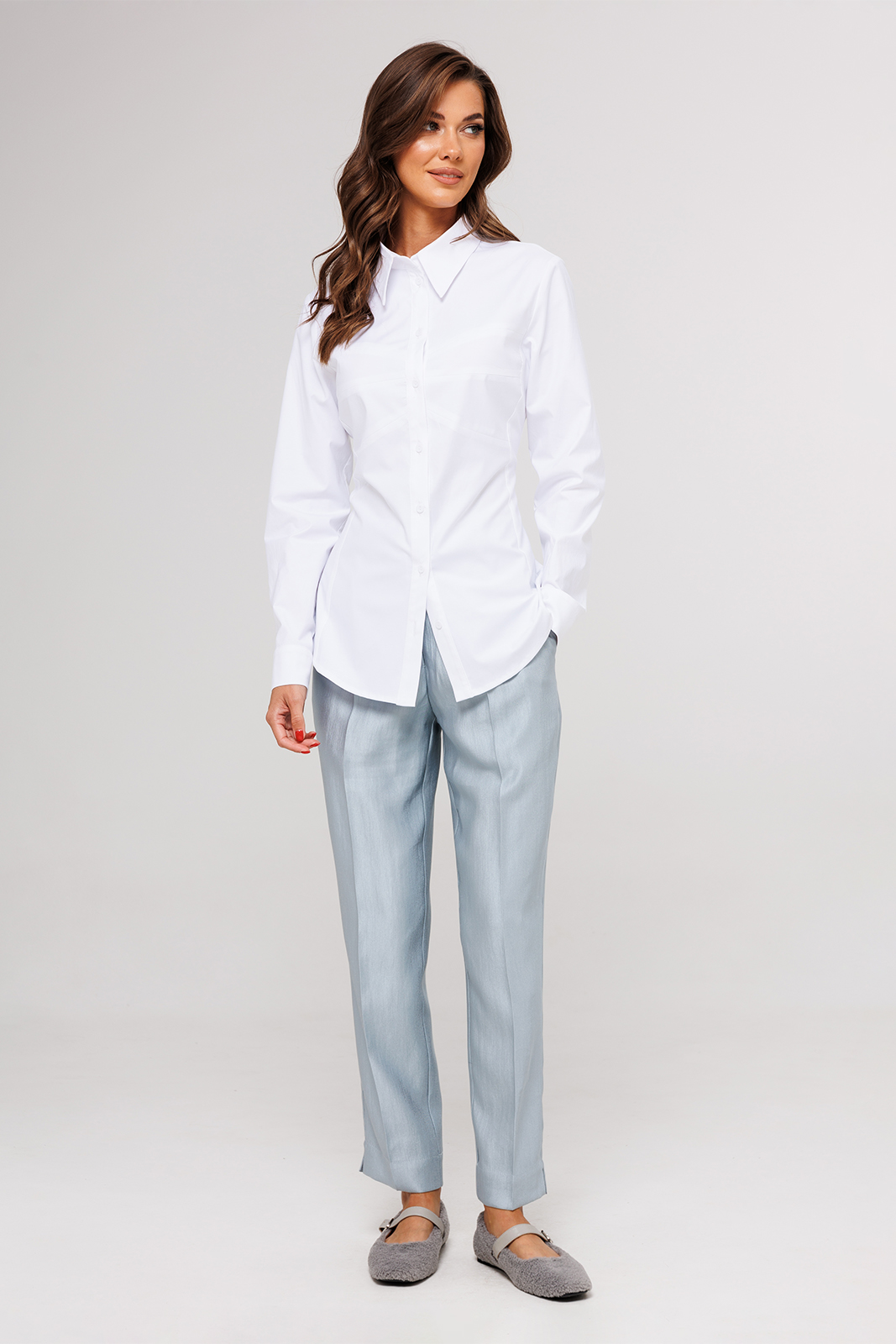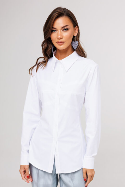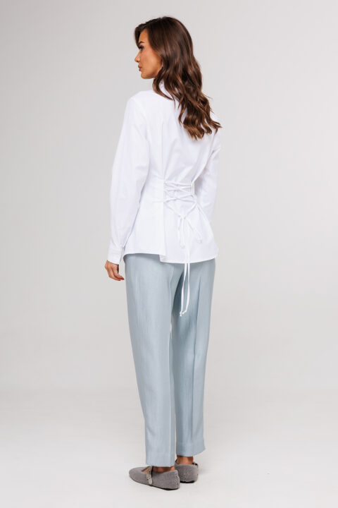 Описание: Блузка полуприлегающего силуэта, с втачным одно шовным рукавом, со складкой и манжетой, с застежкой на петлю-пуговицу. Полочка с центральной застежкой на петли-пуговицы и с фигурными подрезами, имитирующими лиф. Спинка с рельефами и шнуровкой от рельефов. Воротник рубашечный отложной на стойке. Спинка и полочка с фигурным низом.