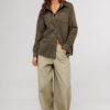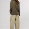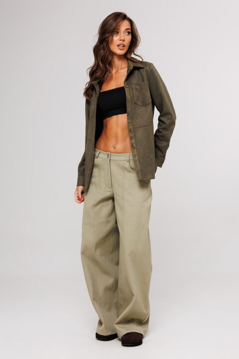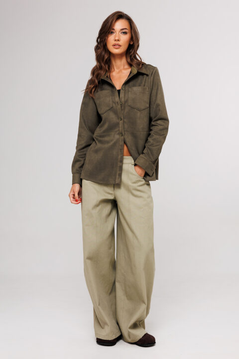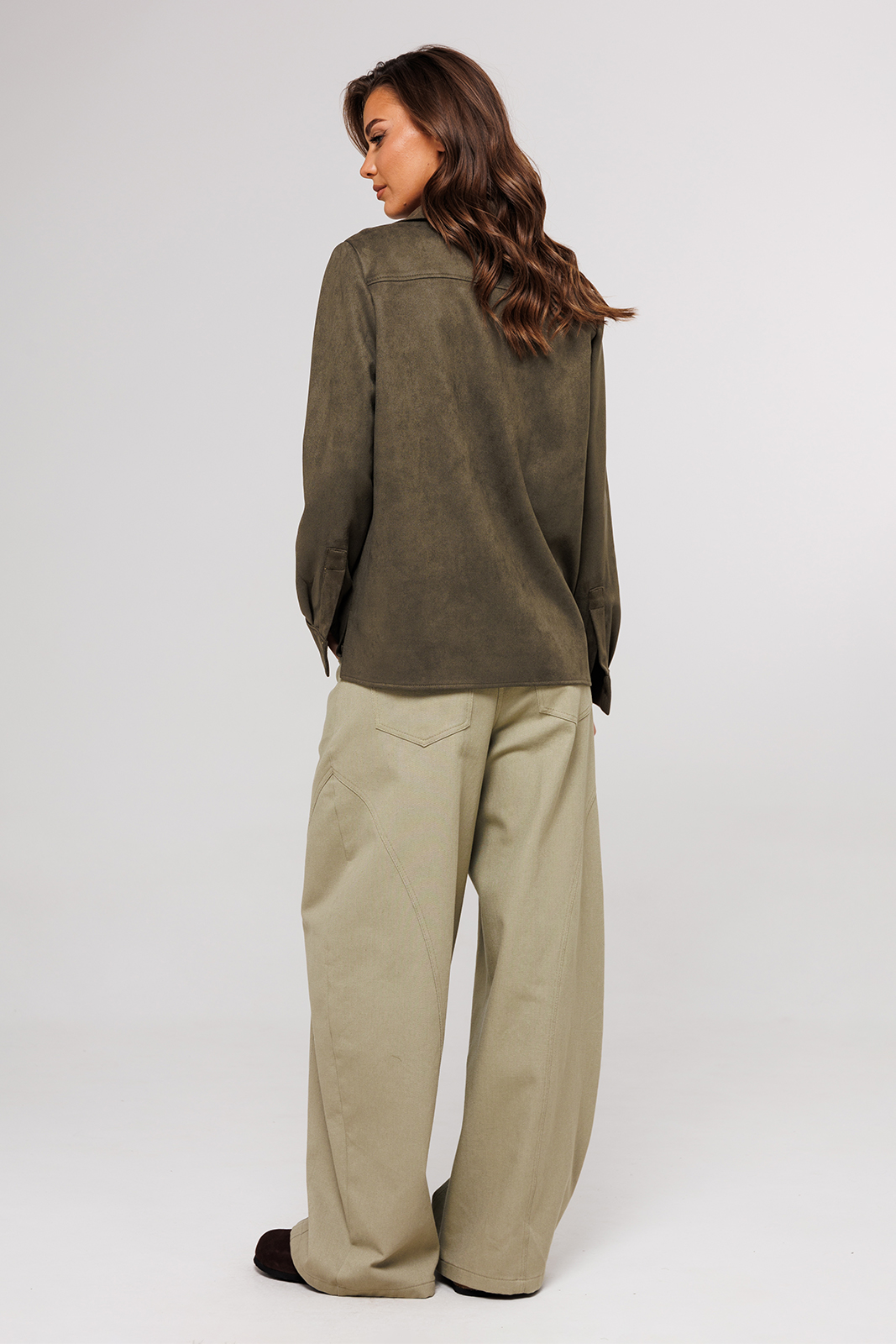 Описание: Блузка замшевая прямого силуэта, с втачным одношовным рукавом внизу со складкой и манжетой, с застежкой на петлю-пуговицу. Полочка с центральной застежкой на петли-пуговицы и накладным карманом и горизонтальным подрезом. Синка с кокеткой. Воротник рубашечный отложной на стойке. Внизу по боковым швам обработаны разрезы.
