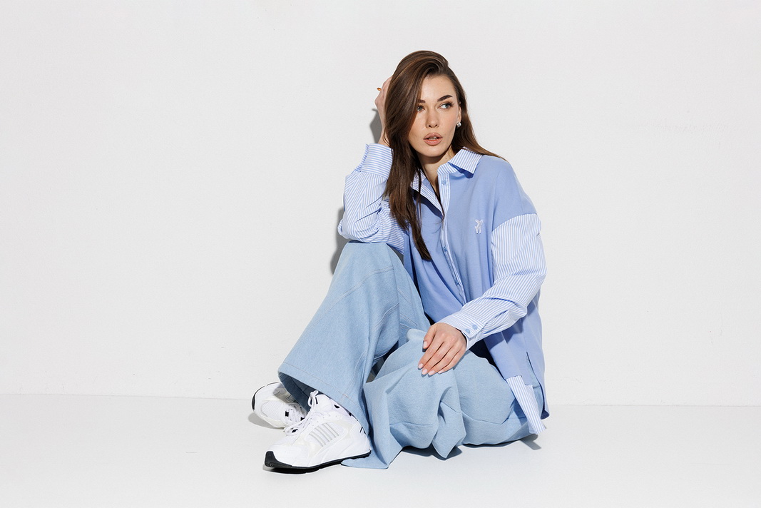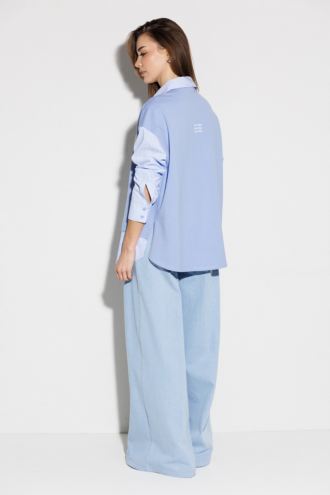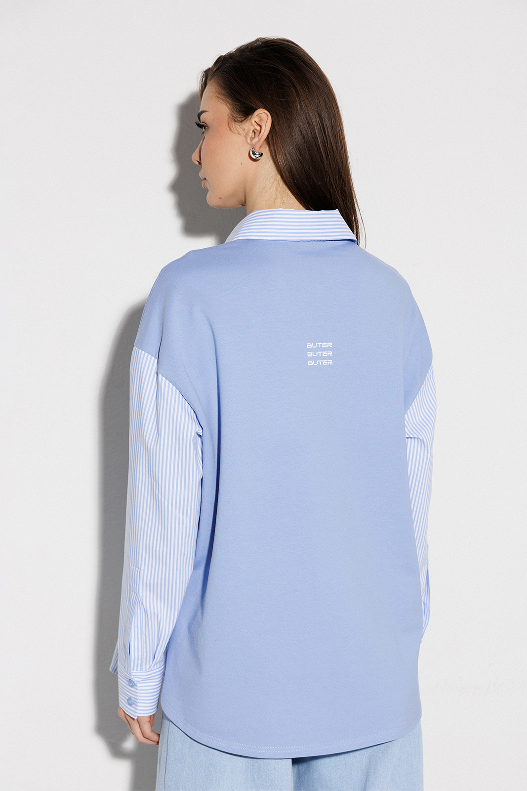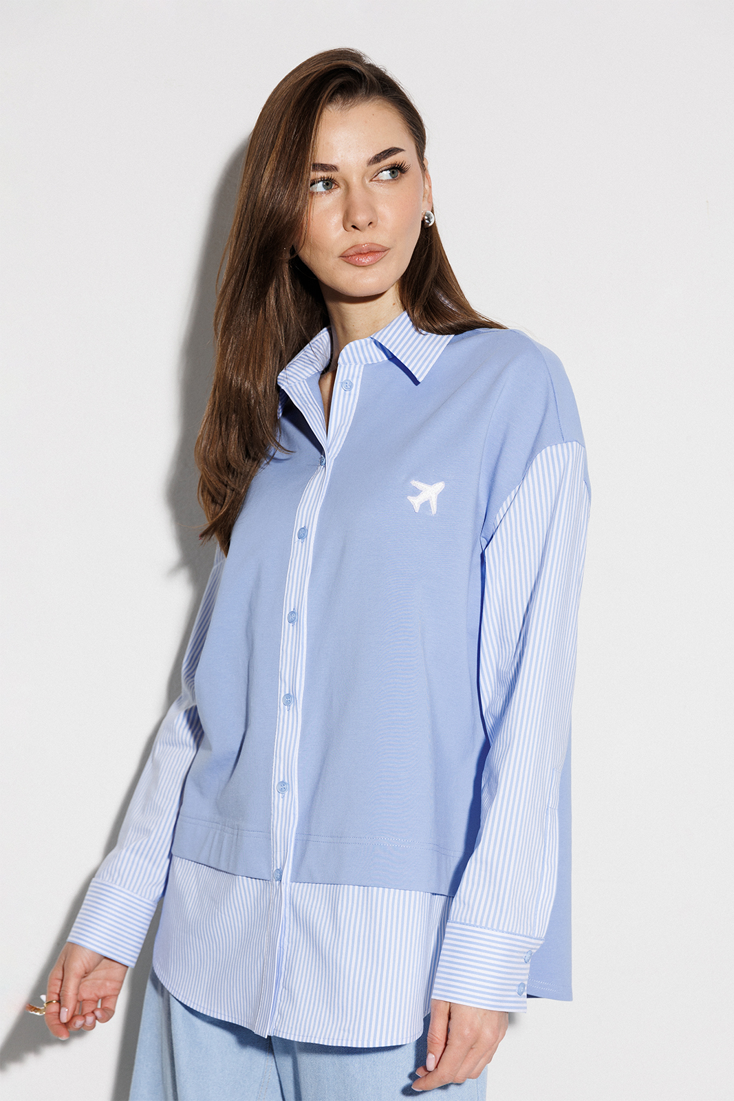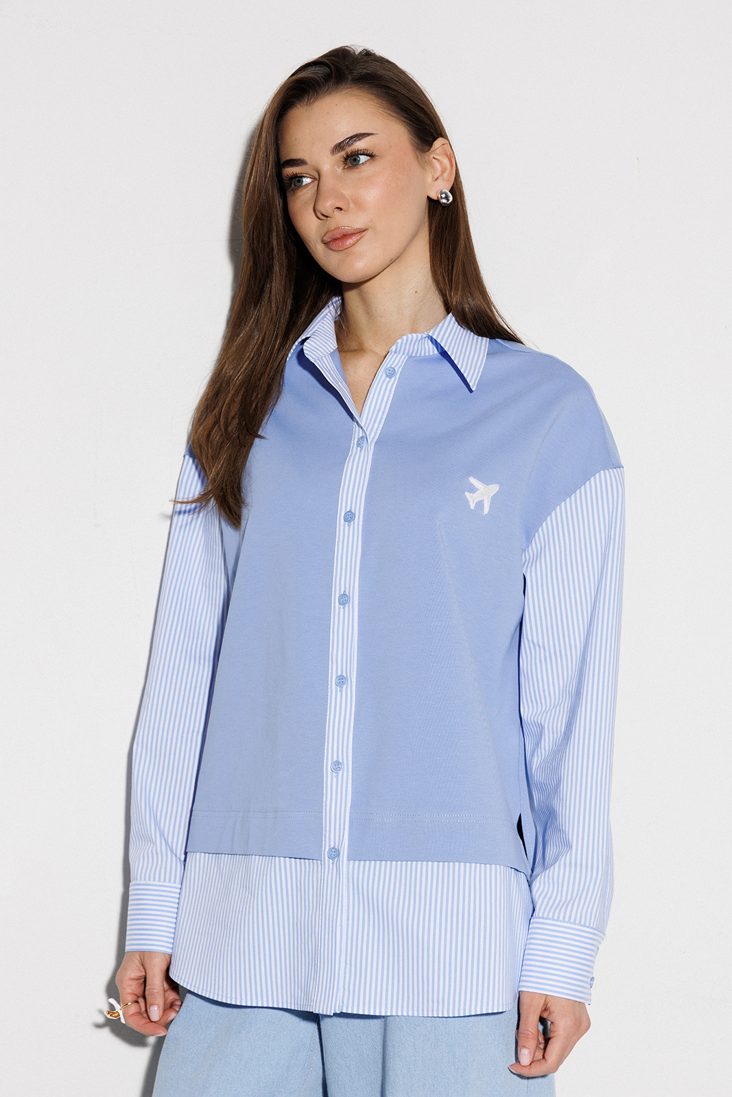 Описание: Блузка, комбинированная прямого силуэта, с втачным одношовным рукавом, со складкой и манжетой, с застежкой на петли-пуговицы и спущенной линией плеча. Полочка из трикотажа и рубашечной ткани с центральной застежкой на петли-пуговицы и вышивкой “Самолет”. Спинка из трикотажа с печатью “BUTER”. Воротник рубашечный отложной на стойке. Спинка и полочка с фигурным низом. Внизу по боковым швам обработаны разрезы.