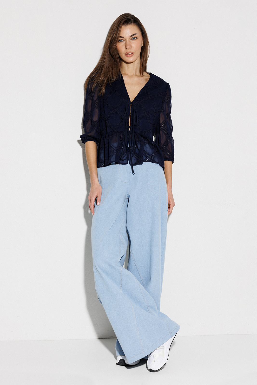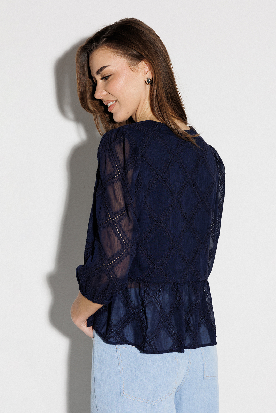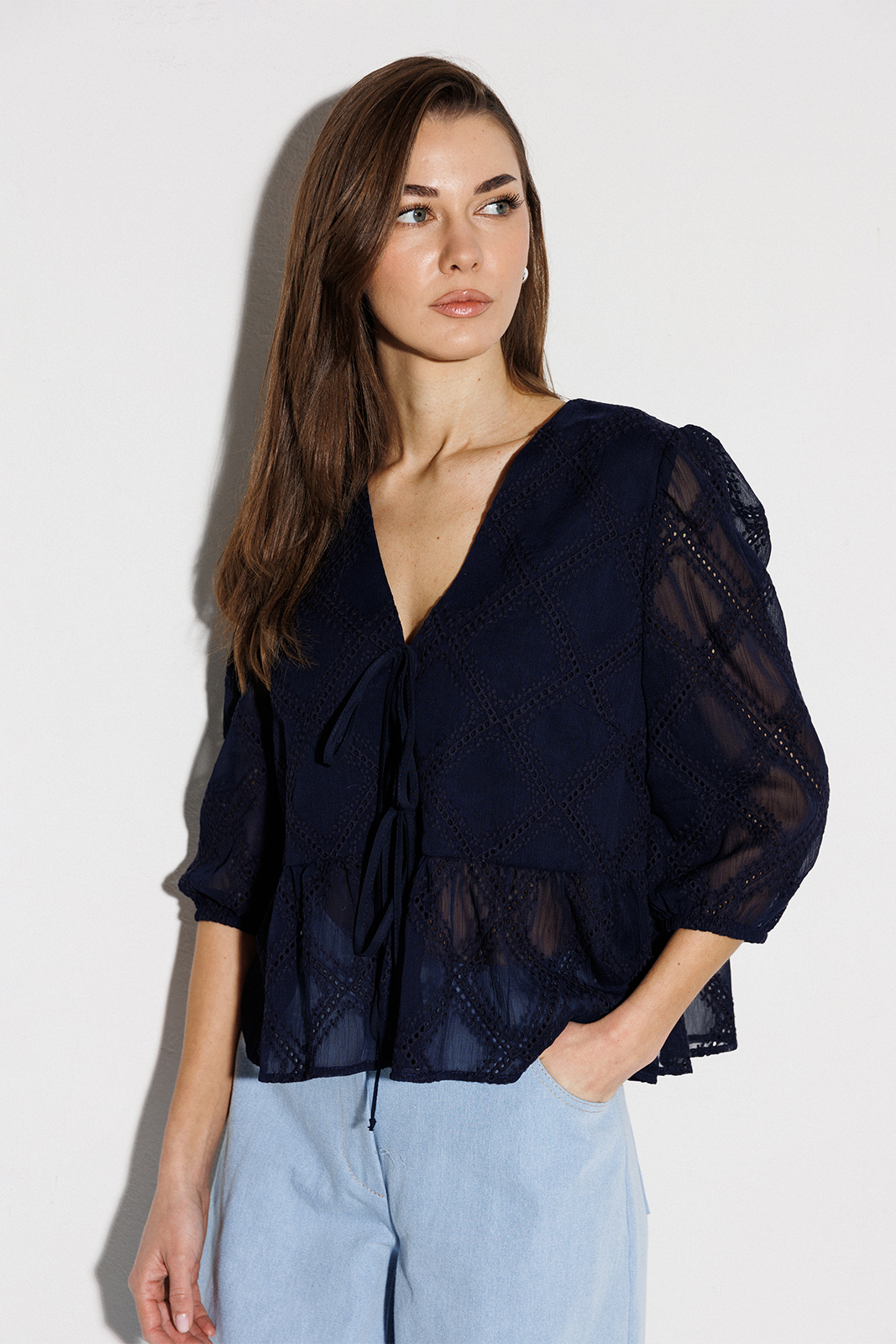 Описание: Блузка с V-образным вырезом и втачным рукавом 3/4 со сборкой по окату и внизу на резинке. Полочка с центральной застежкой на завязки. По полочке и спинке по линии талии вставлен волан со сборкой и фигурным низом. Блузка на подкладке из хлопка.