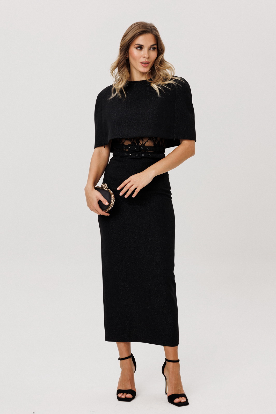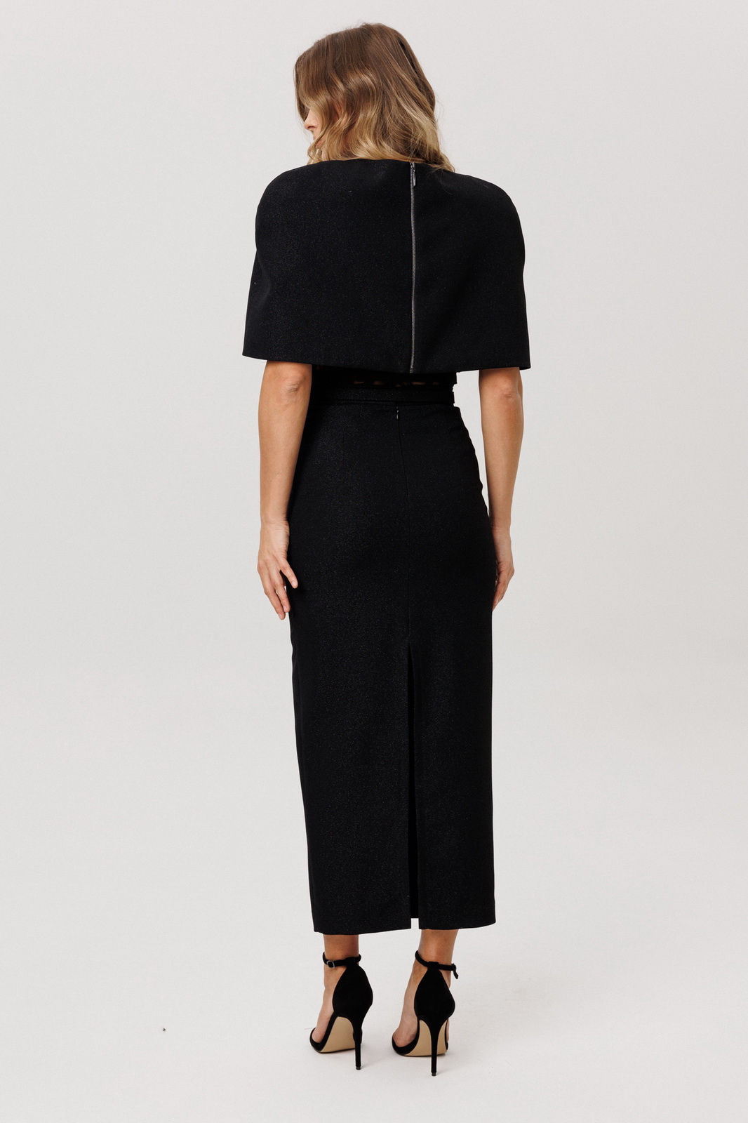 Описание: Кейп (накидка) выполнен из костюмно-плательной ткани с блеском. Кейп прямого силуэта длиной выше линии талии. Спереди потайные молнии на уровне рук для удобства движения. Застежка на молнию с металлическими звеньями сзади в среднем шве спинки. Горловина округлой формы. Плечевой пояс округлой формы. Кейп на притачной по низу подкладке, с плечевыми накладками.