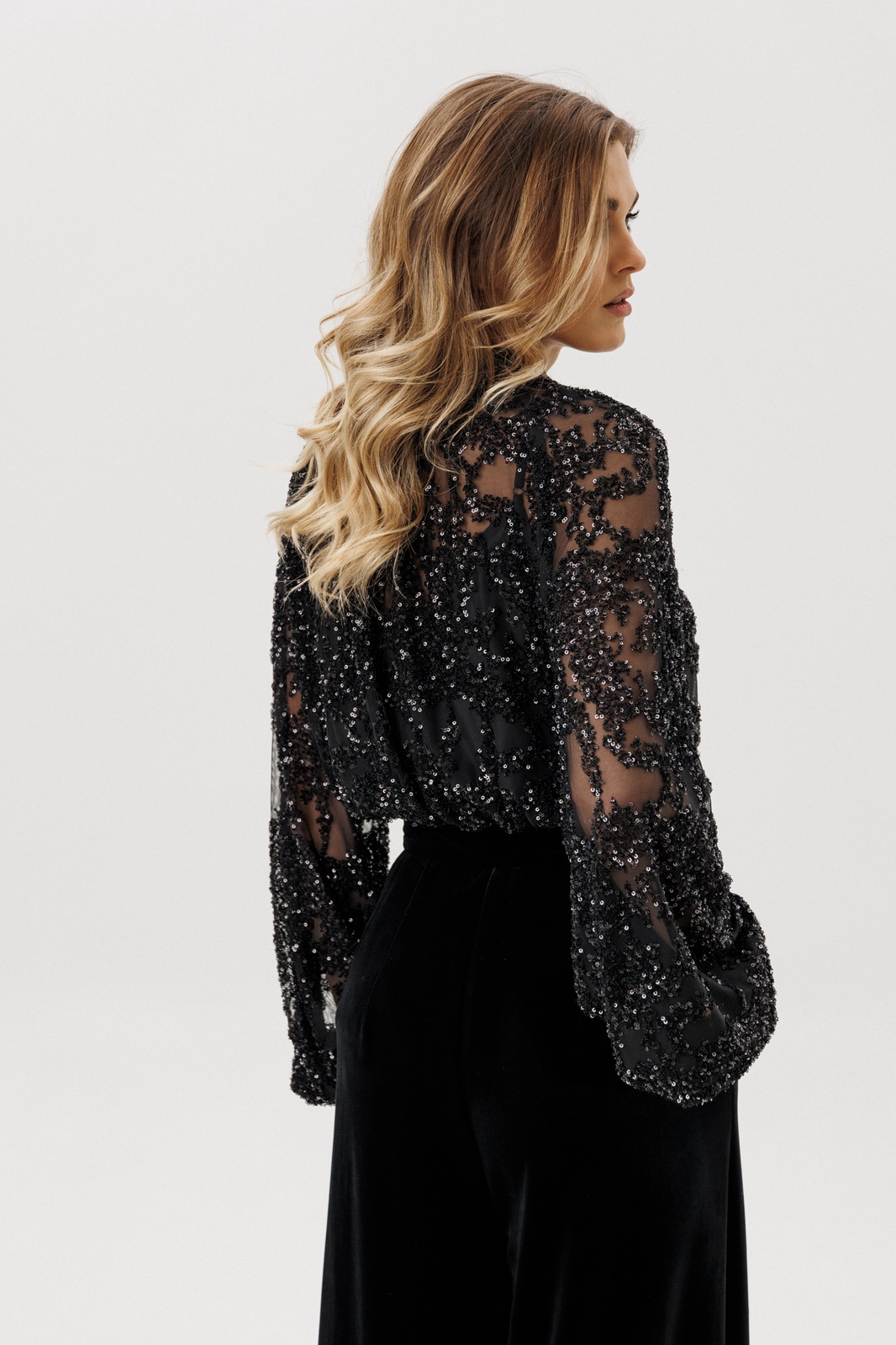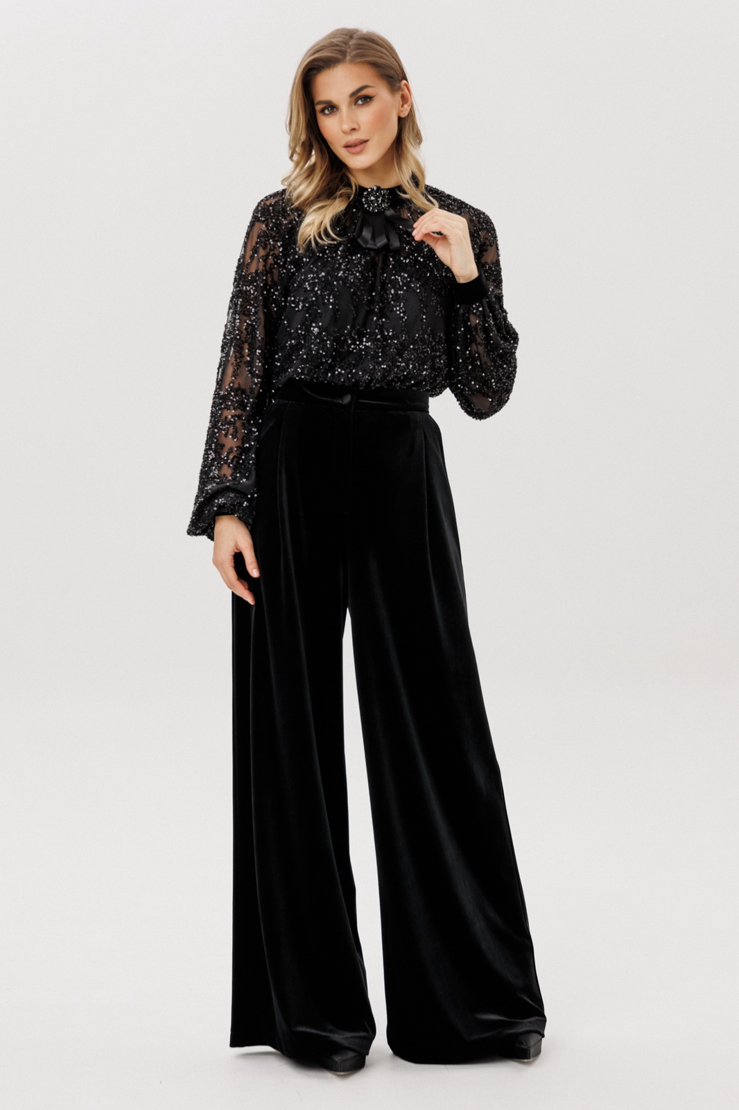 Описание: Блузка + топ. Блузка выполнена из сетки с вышивкой пайетками. Блузка прямого силуэта, длиной до линии бедер. Перед и спинка цельные, со сборкой по горловине. Воротник-стойка. Застежка сзади на две петли и пуговицы. Рукав покроя “реглан”, одношовный, со сборкой по горловине и низу. Низ рукава на притачной манжете из велюра, застегивающейся на пуговицу. В комплект входит топ из трикотажной подкладки. Топ прямого силуэта, длиной до линии бедер, бретели регулируются по длине. В комплект входит декоративная брошь.