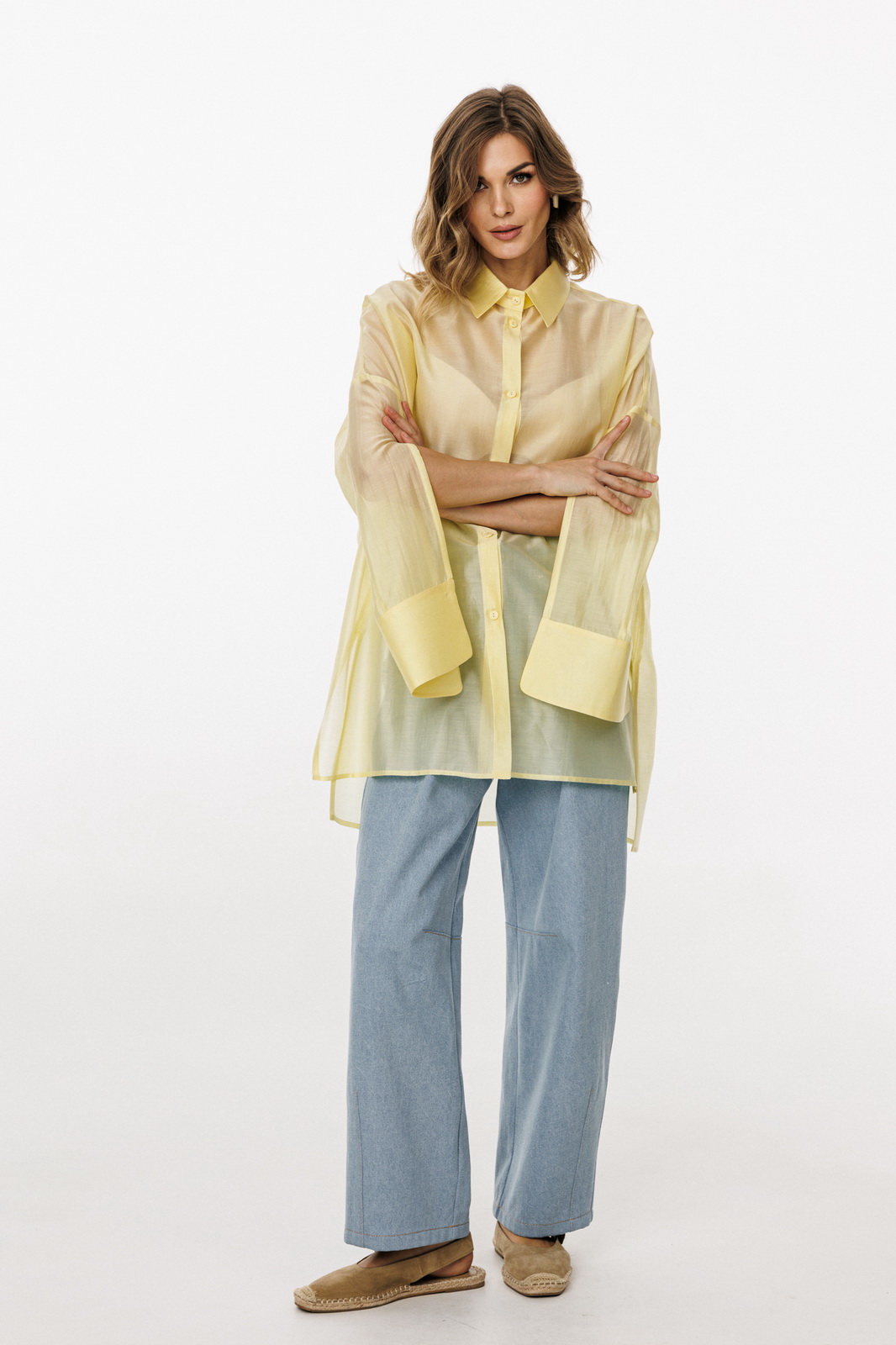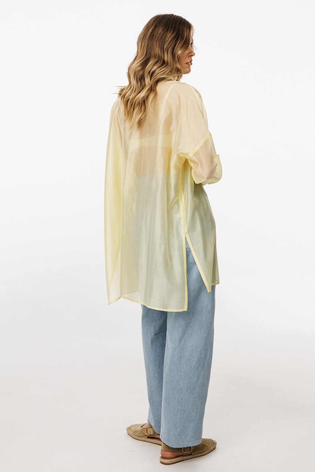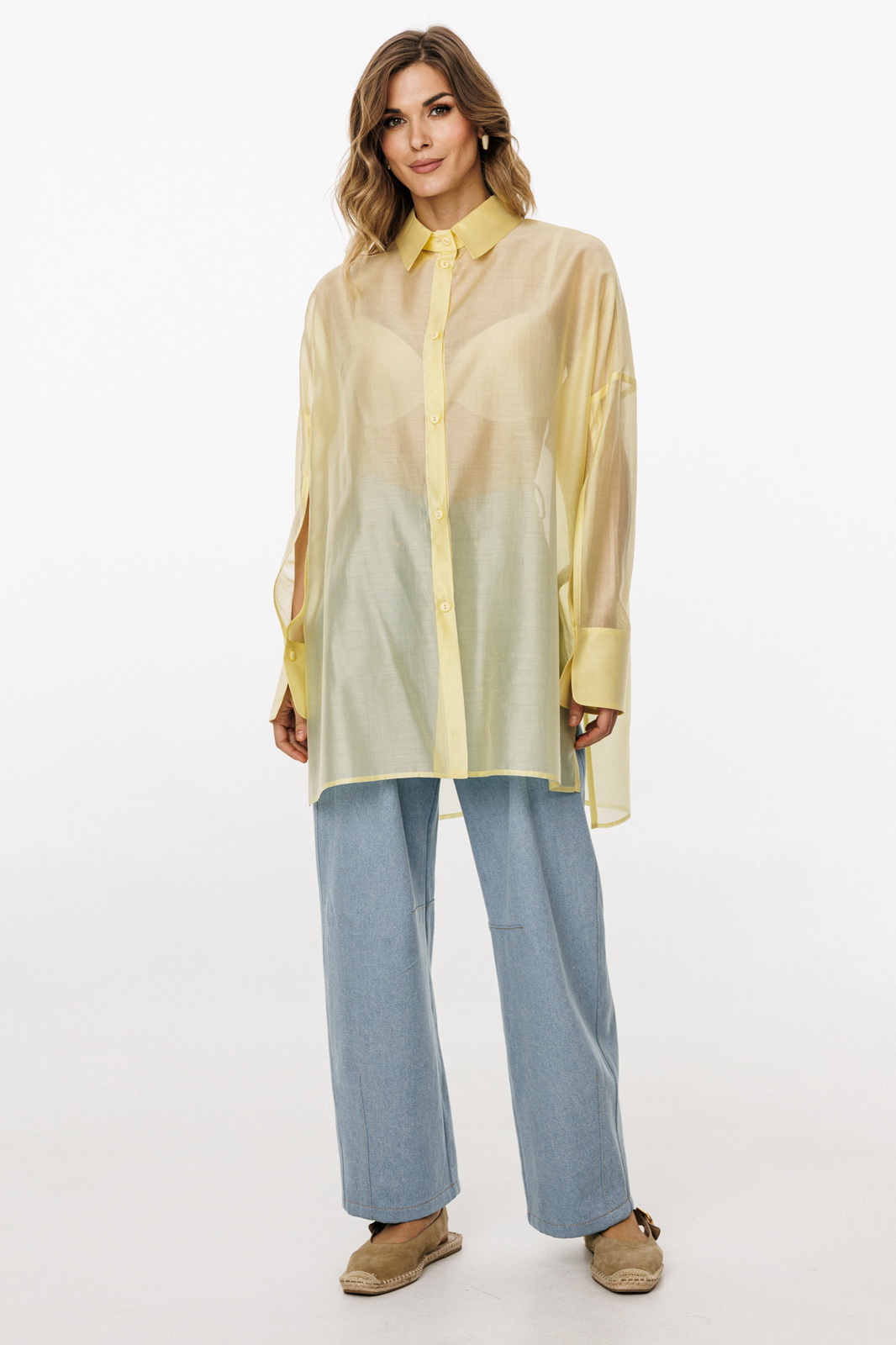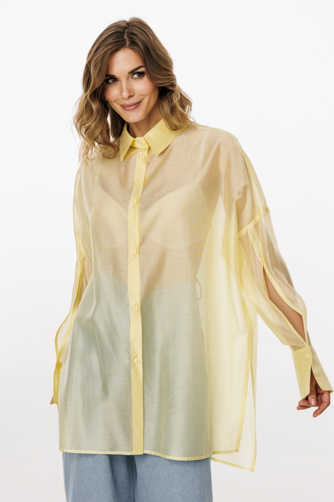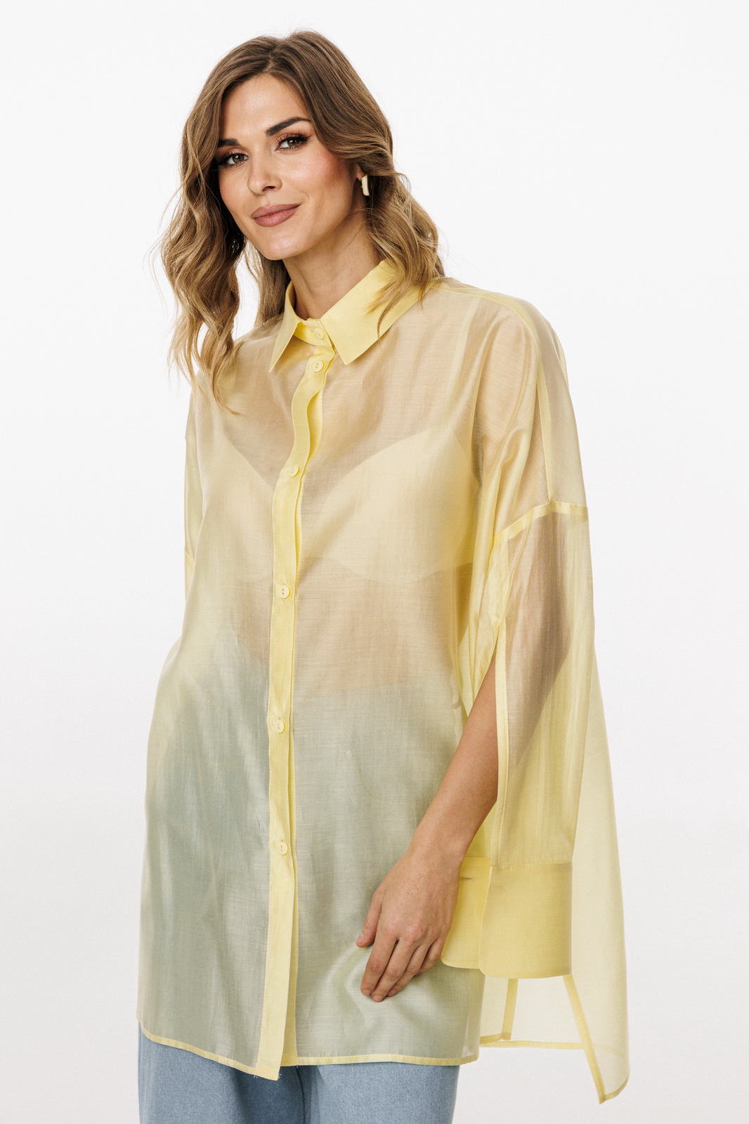 Описание: Блузка выполнена из плательно-блузочной ткани. Блузка прямого силуэта, покроя оверсайз, длиной ниже линии бедер. Спереди центральная застежка на пуговицы. Спинка цельная, длиннее переда. Воротник стояче-отложной. Плечевой шов спущен. Рукав рубашечного покроя, двухшовный, с прорезью по переду. Низ рукава на притачной манжете, застегивающейся на пуговицу. В боковых швах разрезы.