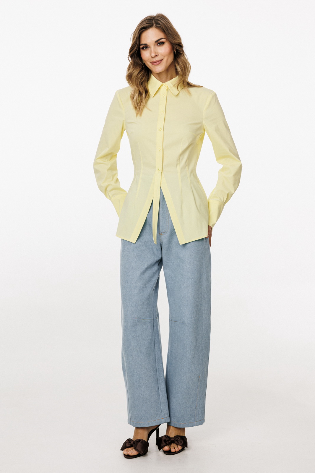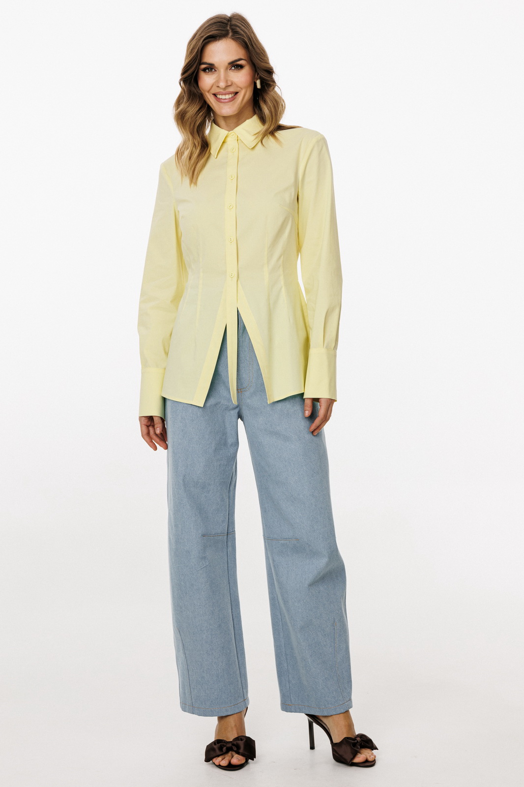 Описание: Блузка выполнена из плательно-блузочной ткани. Блузка приталенного силуэта. Длиной до линии бедер. Блузка с плечевыми накладками. По переду обработаны две пары талиевых вытачек, нагрудные вытачки и центральная застежка до верха с планками фигурной формы. Горловина округлой формы, обработана воротником рубашечного типа с отрезной стойкой. Плечевой шов удлинен. Рукав втачного покроя, одношовный. По низу рукава обработаны складки и обтачка прорези с петлей и пуговицей. Низ рукава обработан притачной манжетой, застегивающейся на две петли и пуговицы.