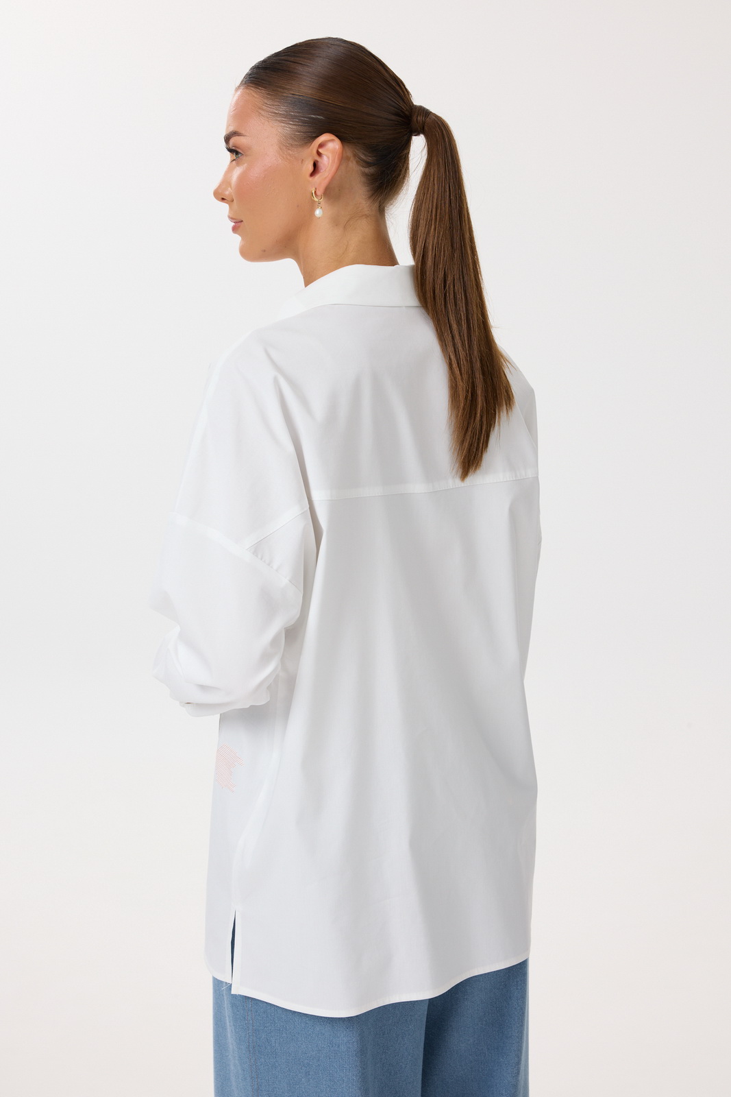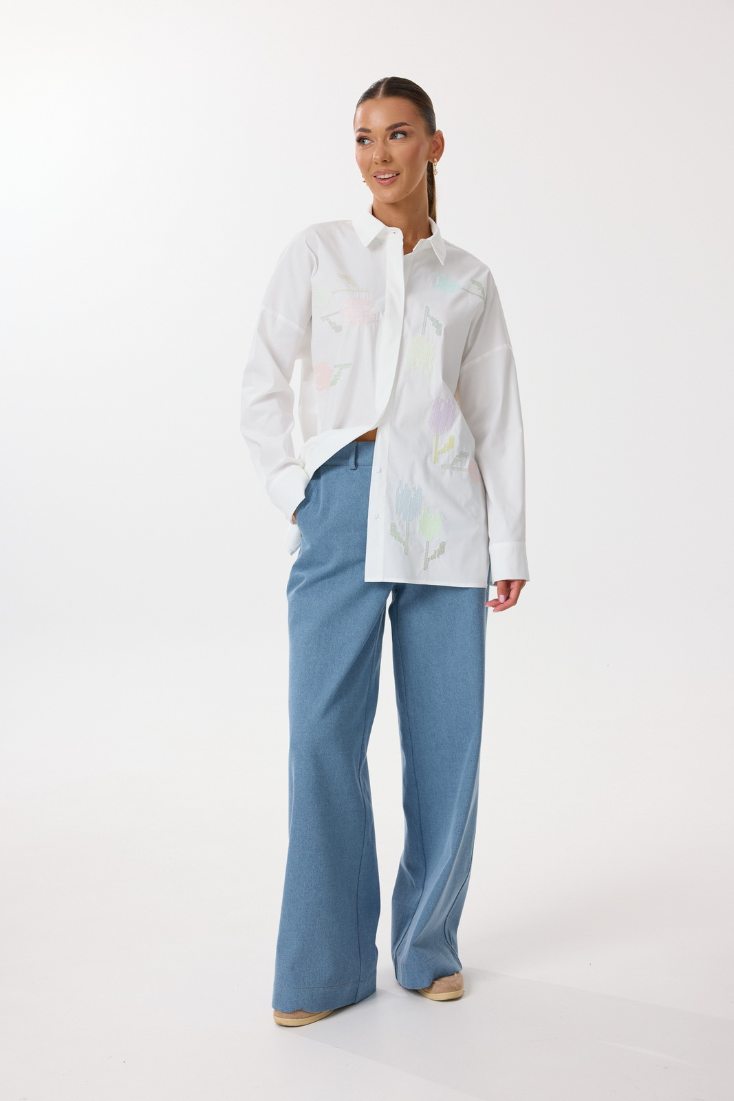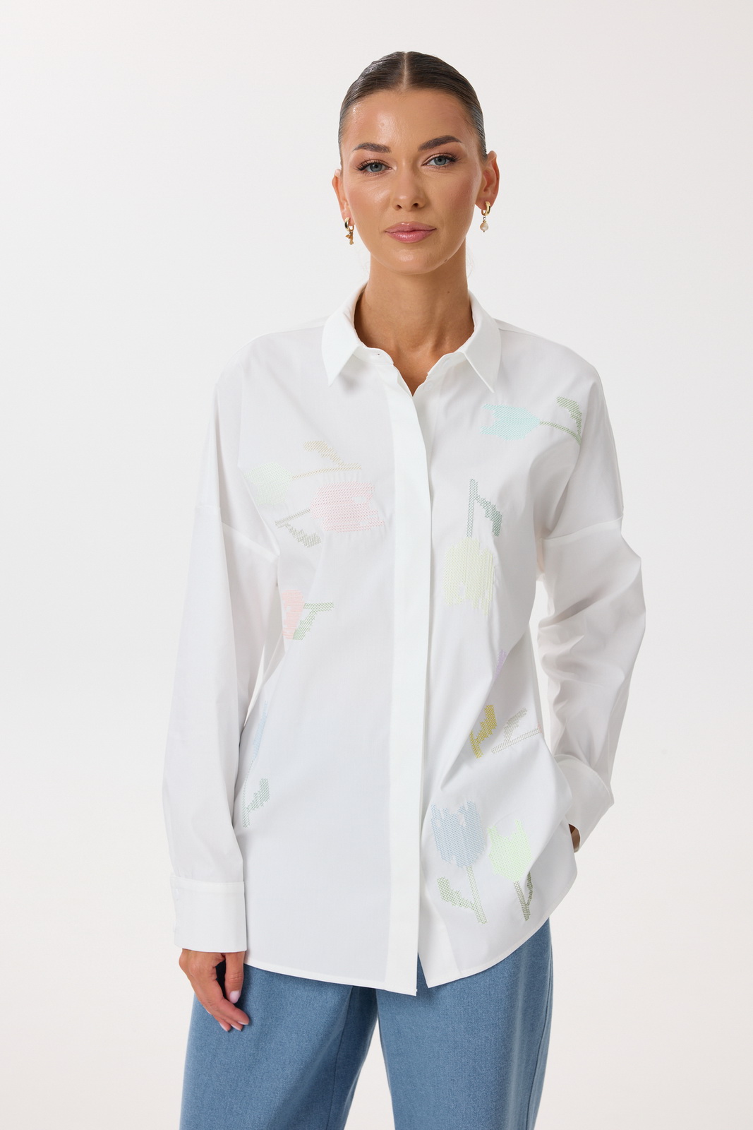 Описание: Блузка женская прямого силуэта. Перед с центральной застежкой на петли и пуговицы, декорирован авторской вышивкой. Спинка с кокеткой. Плечо спущено. Рукав длинный одношовный, по низу со складками. Низ рукава обработан притачной манжетой, застегивающейся на петли и пуговицы. В боковых швах обработаны разрезы. Горловина обработана воротником рубашечного типа с отрезной стойкой. Декоративные элементы и фурнитура могут отличаться от заявленных на фото. Цвет материала может отличаться по тону в зависимости от настроек вашего монитора!