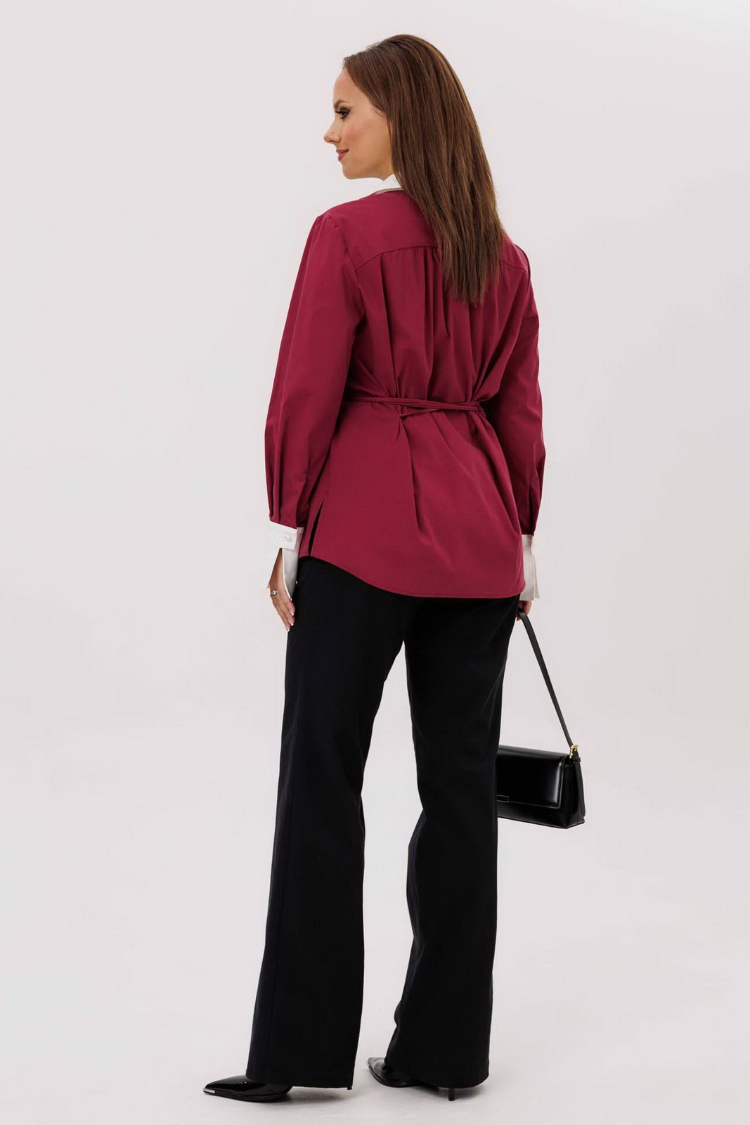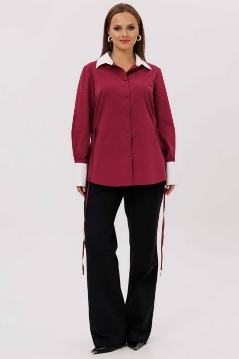 Описание: Блуза прямого силуэта, приталивается за счет завязок, вставленных в боковые швы. Застежка центральная на петли-пуговицы, перед с нагрудными вытачками, спинка с отрезной кокеткой, рукава втачные, одношовные с манжетой. Воротник и манжет рубашечного типа с отрезной стойкой. Воротник и манжет из отделочной ткани. Низ фигурный.