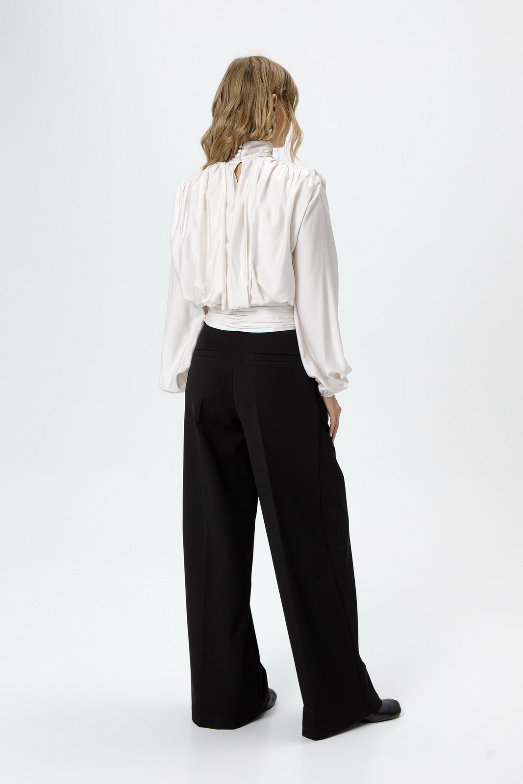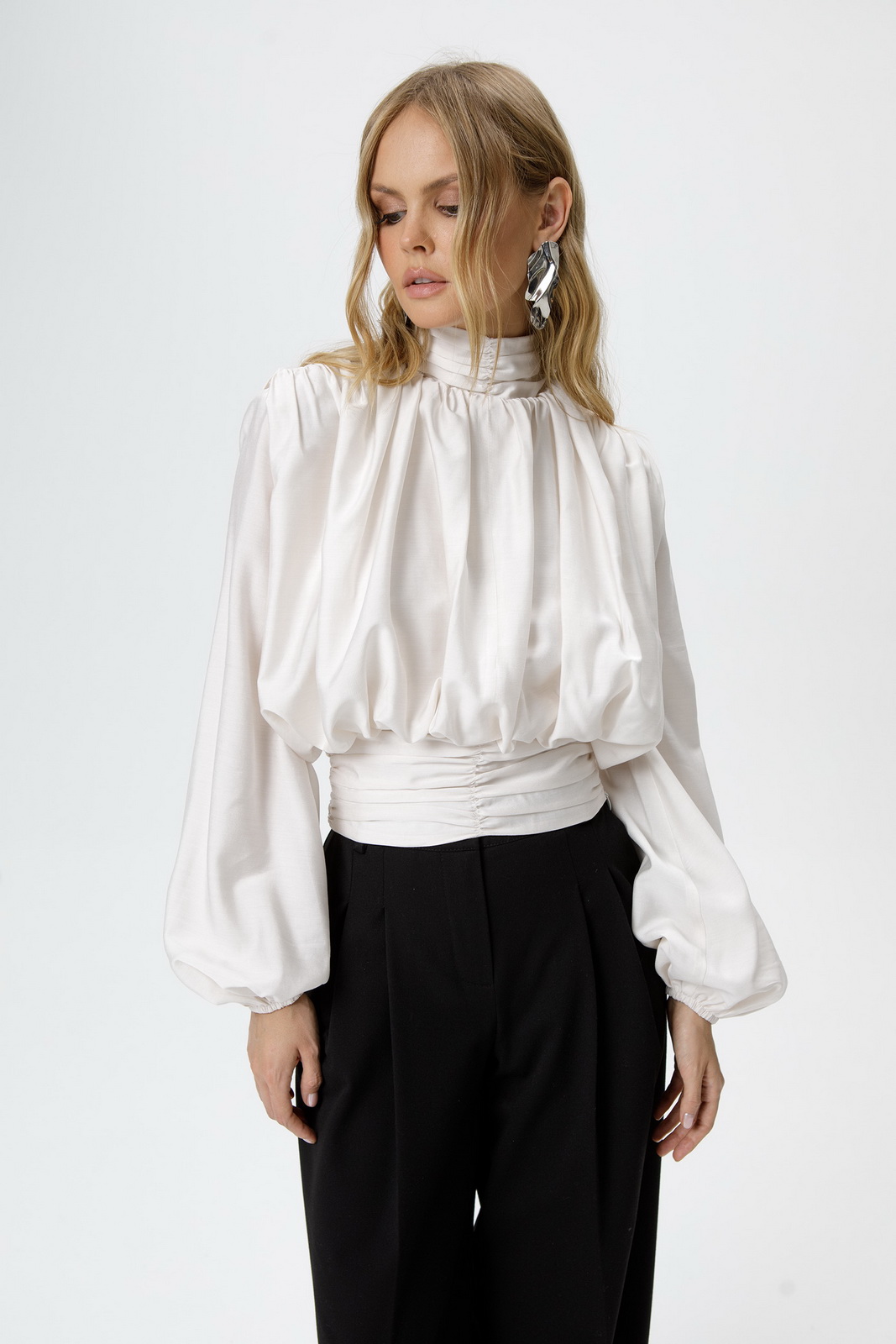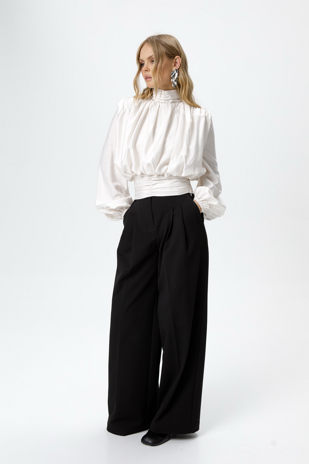 Детали: блуза приталенного силуэта, перед и спинка свободного покроя, пояс блузы со сборкой, расширенные плечи, сборки по плечам и горловине,застёжка на потайную молнию в боковом шве, воротник стойка со сборкой и застёжкой на навесные петли и пуговицы, втачныерасширенные к низурукава с резинкой по низу.
