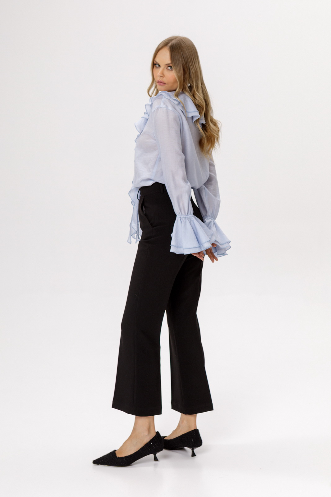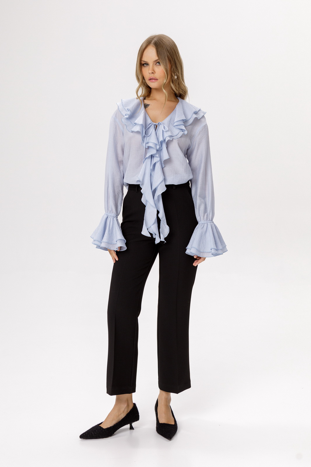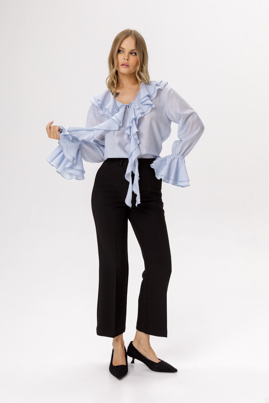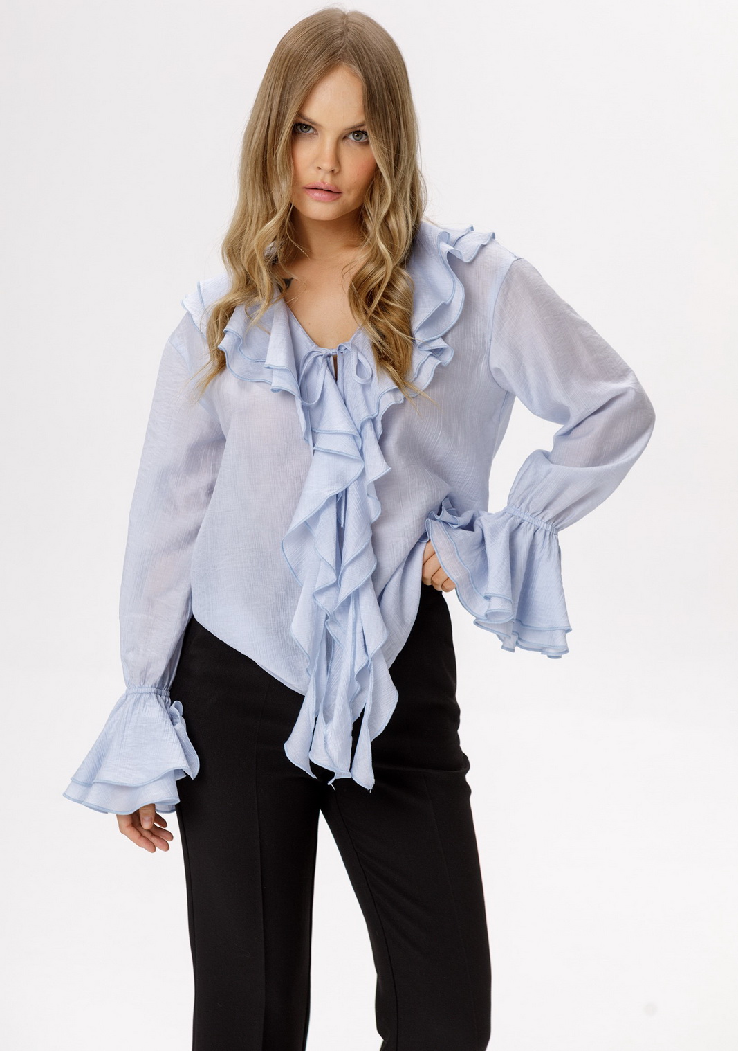 Детали: блуза прямого силуэта, V-образный вырез горловины, воротник-волан, низ рукавов на эластичной тесьме с воланами, завязки по переду.