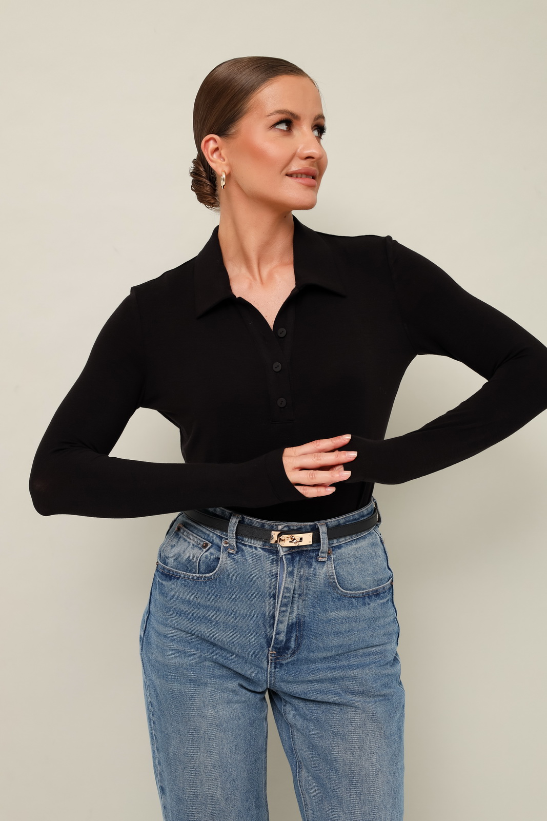 Описание: Трикотажное поло с отложным воротником с цельнокроеной стойкой. Вырез горловины обработан притачными планками с застежкой на петли и пуговицы. Втачные длинные рукава.