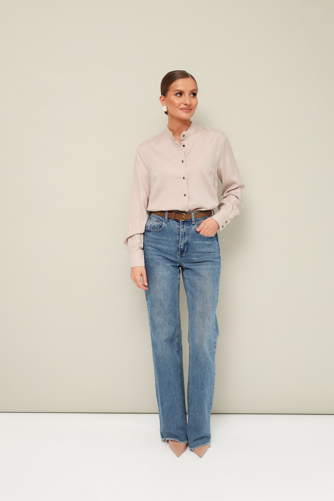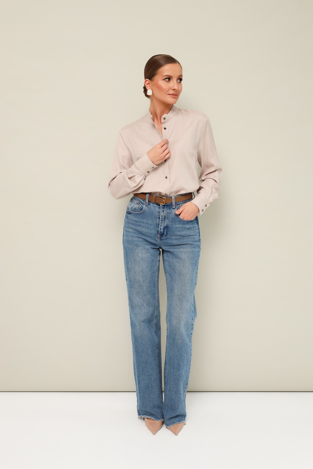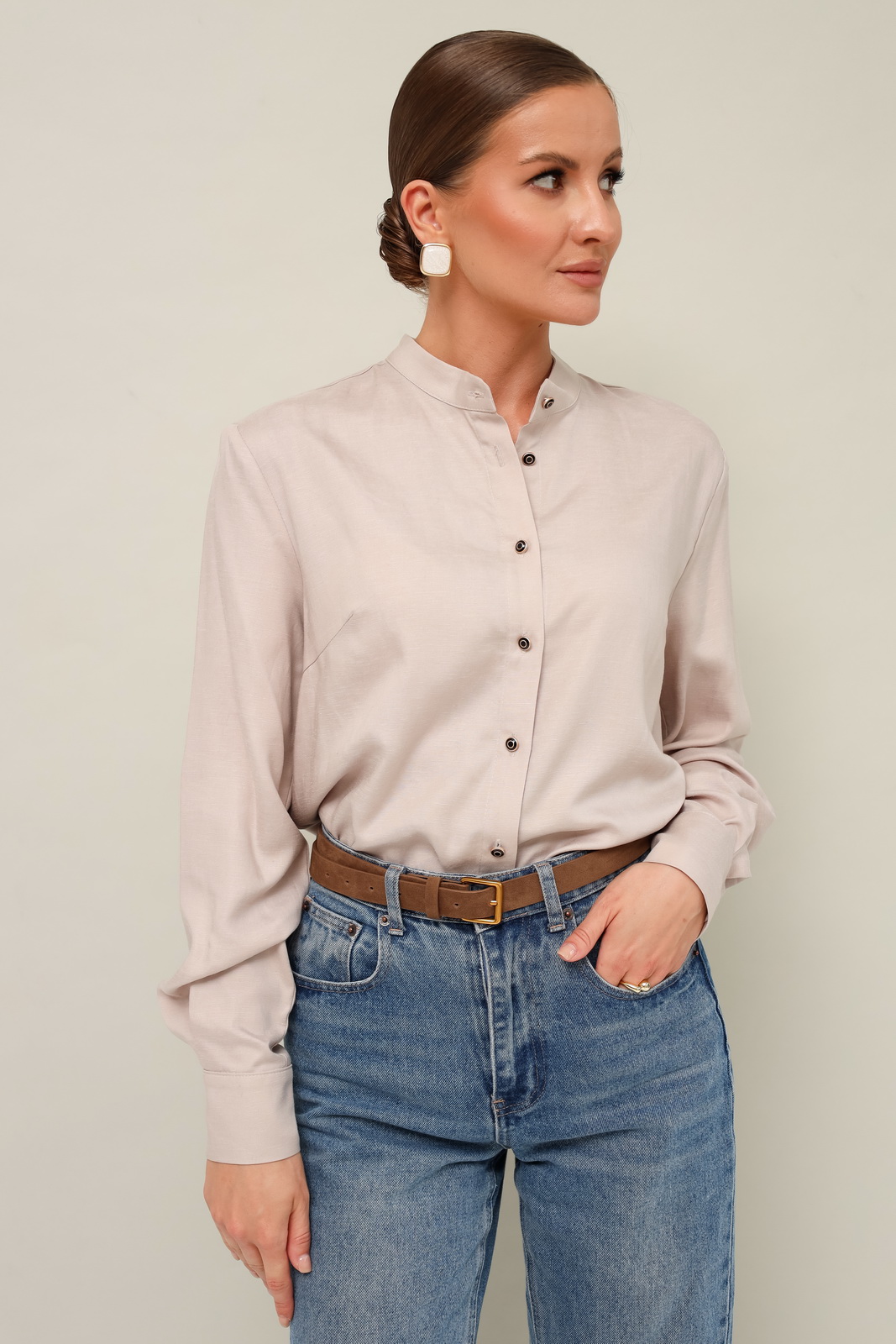Описание: Стильная и комфортная блузка, выполнена из натуральной вискозной ткани. Блузка прямого кроя, горловина со стойкой, центральная застежка на петли и пуговицы. Рукава втачные с манжетами с застежкой на пуговицы. В боковых швах обработаны высокие разрезы.