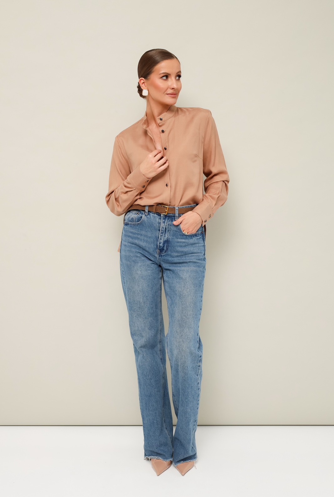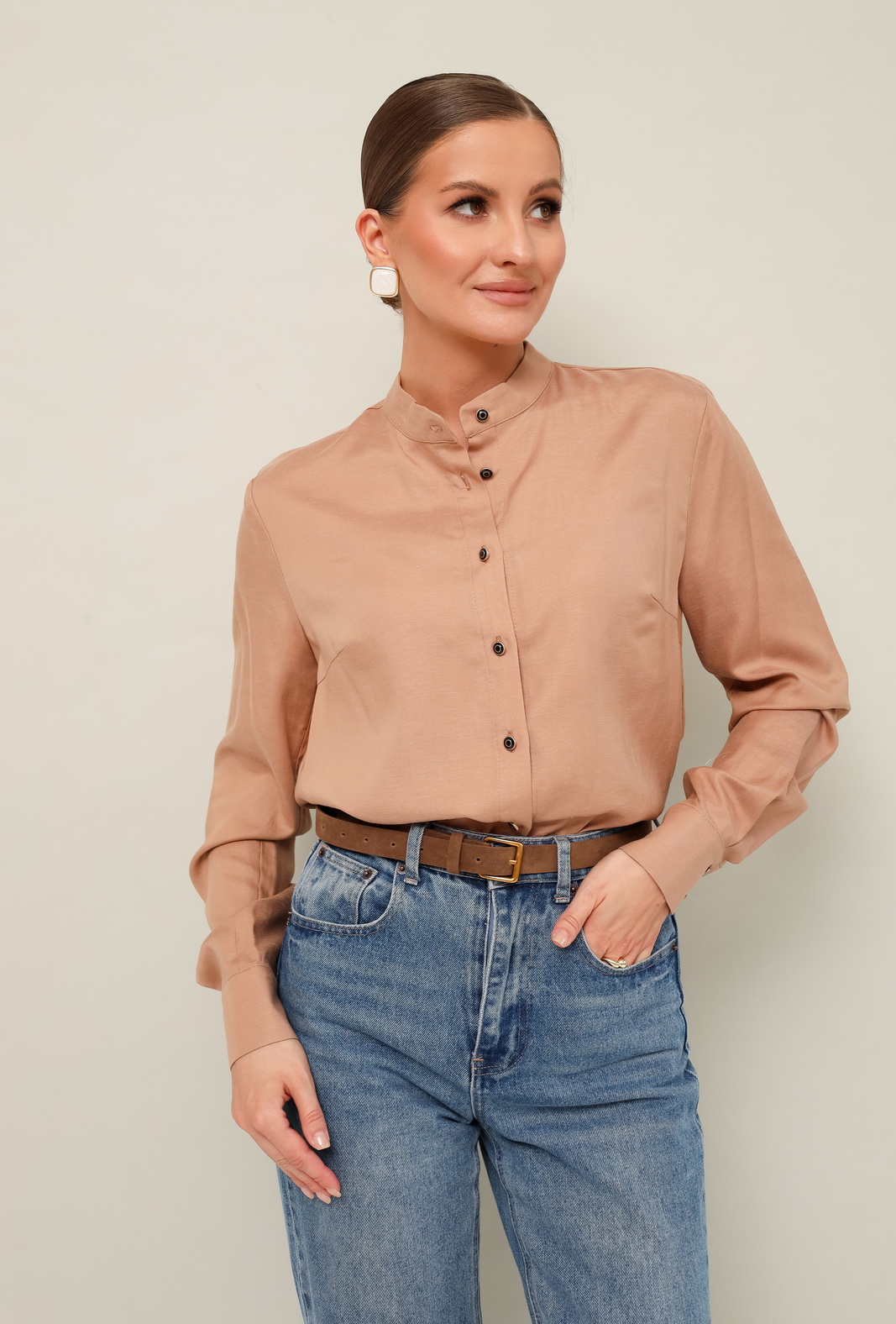 Описание: Стильная и комфортная блузка, выполнена из натуральной вискозной ткани. Блузка прямого кроя, горловина со стойкой, центральная застежка на петли и пуговицы. Рукава втачные с манжетами с застежкой на пуговицы. В боковых швах обработаны высокие разрезы.