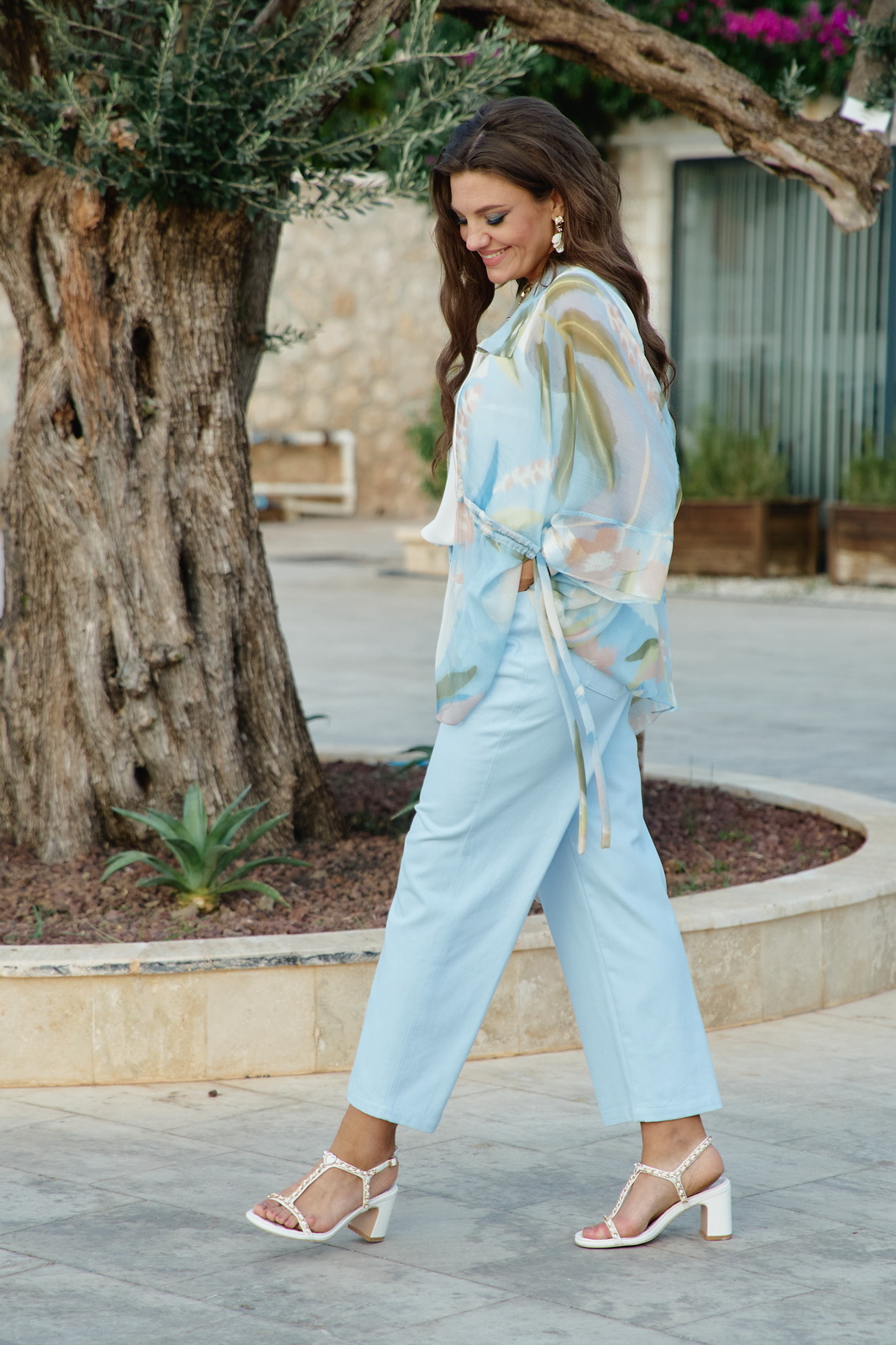 Описание: Комплект женский, двух предметный, состоящий из блузки и блузы. Этот комплект читает женственность спокойно — без пафоса. Он рассказывает о комфорте, о внимании к текстурам и о желании выглядеть легко, но продуманно. Вместе они создают образ, где современная минималистика встречается с женственной романтикой: практично, но вдохновляюще. Главный акцент комплекта – это невесомая шифоновая блузка с абстрактным цветочным принтом в пастельных тонах, создающая ощущение воздушности и легкости. Ее свободный крой и завязки на талии позволяют регулировать силуэт, добавляя динамичности. Его дополняет базовая белая блуза, которая служит чистым холстом для более яркого элемента. Блузка свободного силуэта, с центральной застёжкой на тесьму молнию по переду; воротник в блузке отложной, ассиметричный. В качестве отделочного элемента по переду блузки – кулиса со шнуром из основной ткани. Рукав цельнокроеный, длиной 7/8, с притачной манжетой. По спинке отрезная кокетка. Низ в блузке ассиметричный. Блуза прямого силуэта с округлой формой горловины и нагрудными вытачками по полочке. Спинка без особенностей. Данный комплект имеет множество вариантов стилизации. Можно неебрежно заправить переднюю часть блузы в джинсы — блузка свободно расправится сверху. Застегнуть молнию наполовину, чтобы создать V-образный переход между шифоном и топом. Длина верхней блузы по центру спинки 75,5 см (р 52-56), 76 см (р 58-62). Длина рукава верхней блузы 56 см (р 52-56), 57 см (р 58-62).