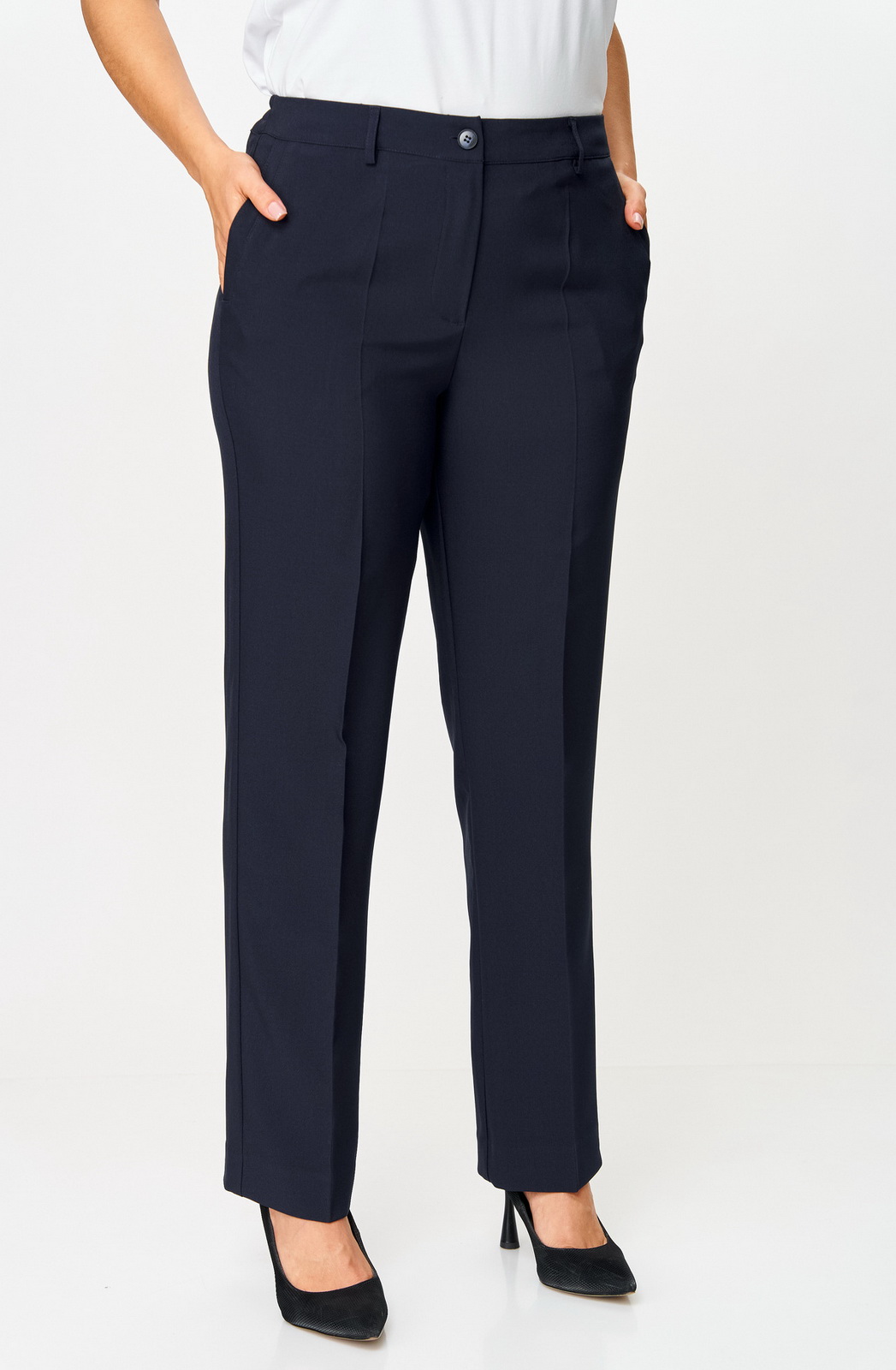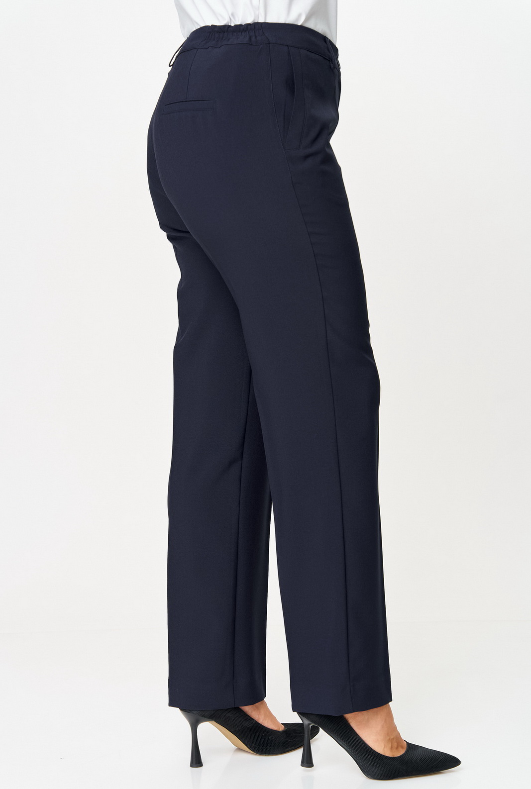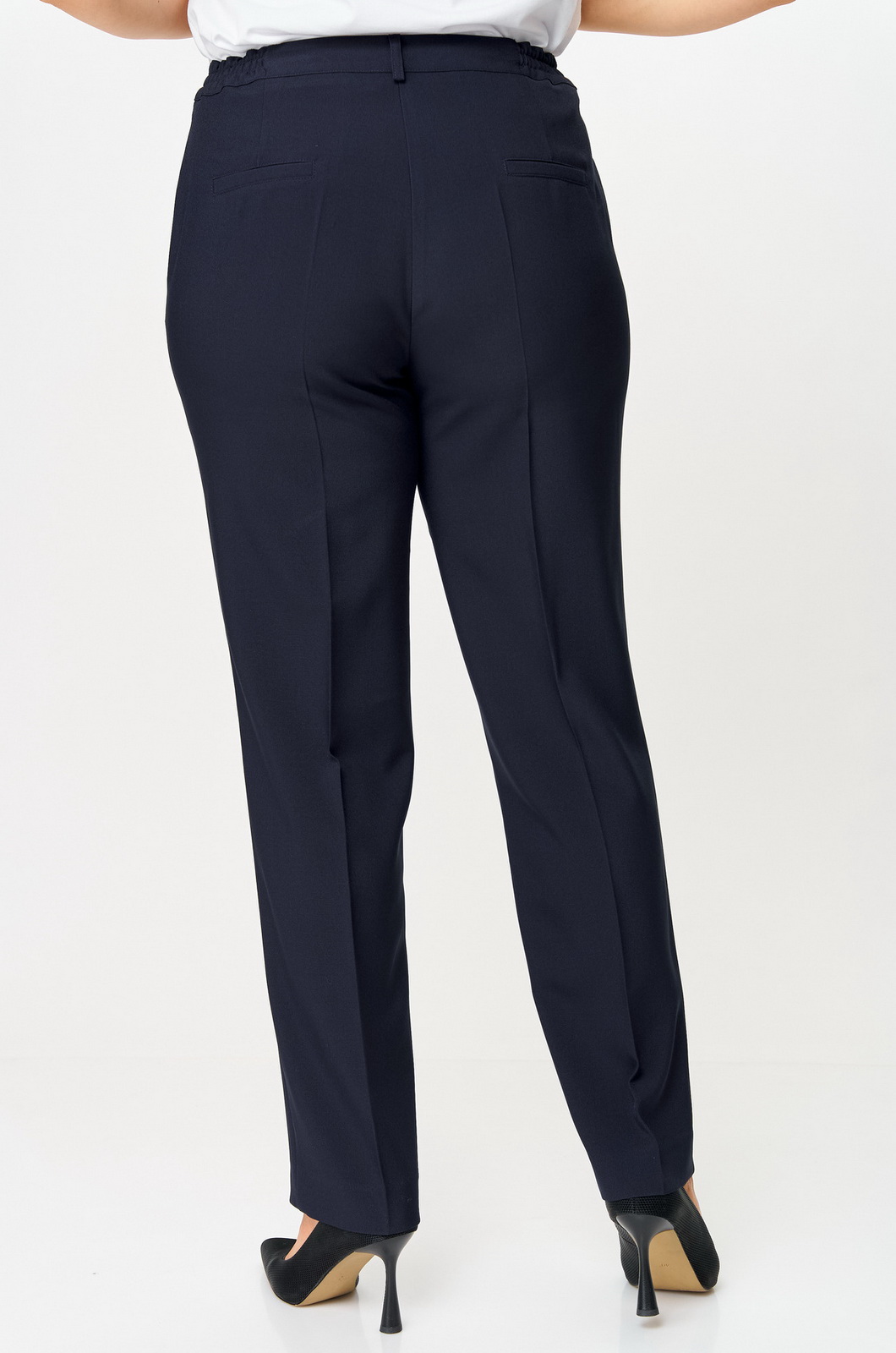 Описание: Брюки прямые, классические, с заутюженными стрелками, по переду обработаны карманы с отрезным бочком, застежка на тесьму-молнию и 1 пуговицу. На задних половинках обработаны вытачки и имитация карманов с листочкой, пояс в брюках притачной, сбоку на резинке. Длина брюк от талии по боковому шву 103 см.