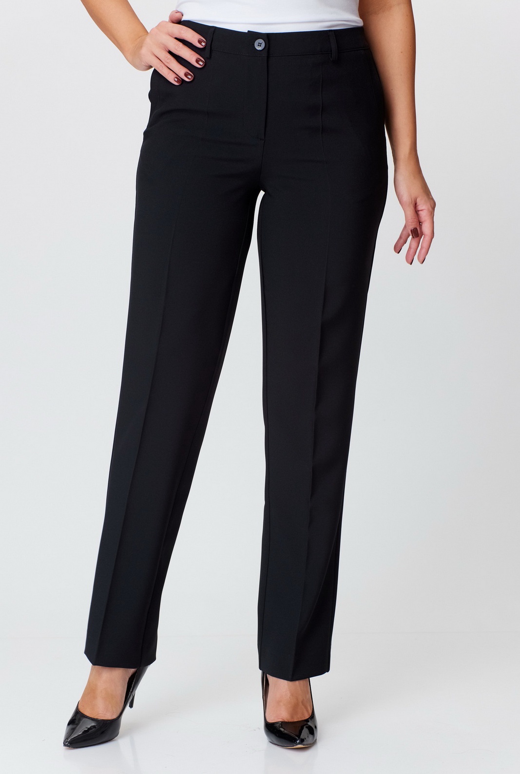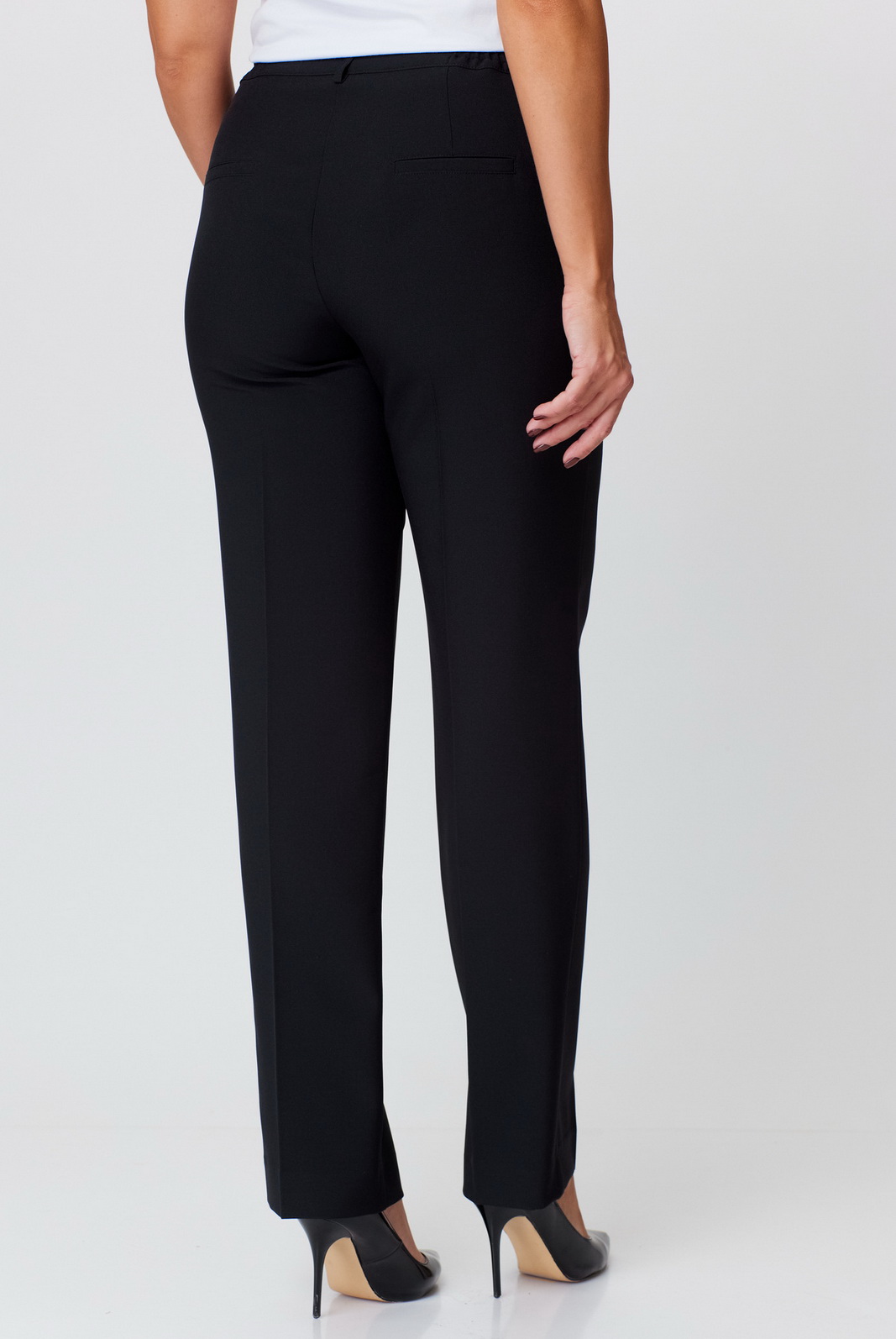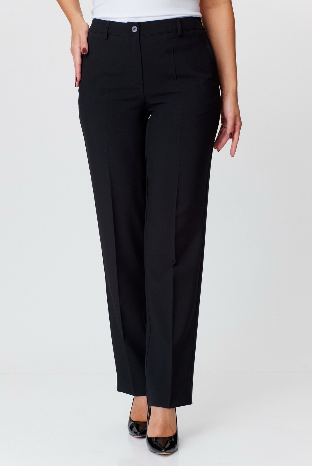 Описание: Брюки прямые, классические, с заутюженными стрелками, по переду обработаны карманы с отрезным бочком, застежка на тесьму-молнию и 1 пуговицу. На задних половинках обработаны вытачки и имитация карманов с листочкой, пояс в брюках притачной, сбоку на резинке. Длина брюк от талии по боковому шву 103 см.