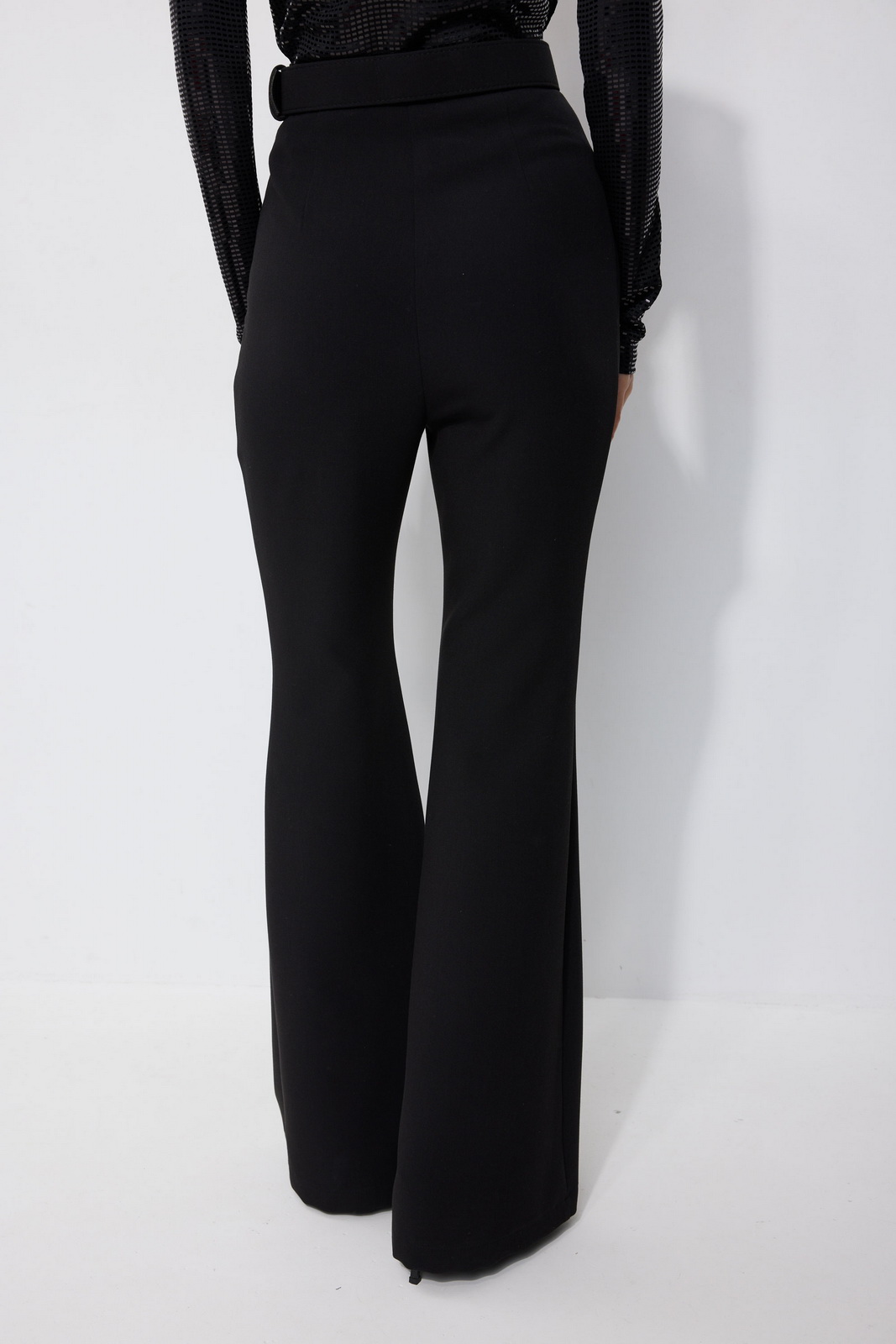 Описание: Брюки прилегающего силуэта расширенные книзу из костюмной ткани. По верху притачной пояс с застежкой на петлю и пуговицу и шлевками для ремня. На передних половинках обработана застежка молния в среднем шве. В комплект входит съемный ремень. Обращаем ваше внимание, что фурнитура может отличаться от фото.