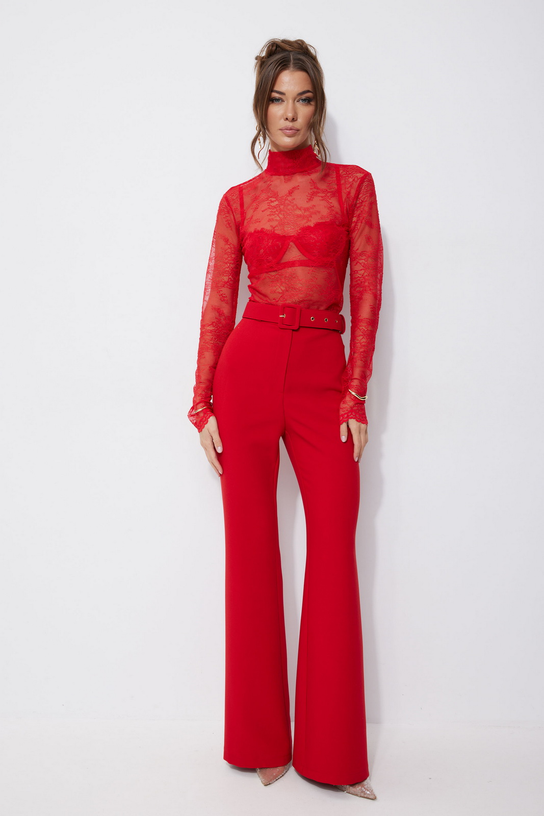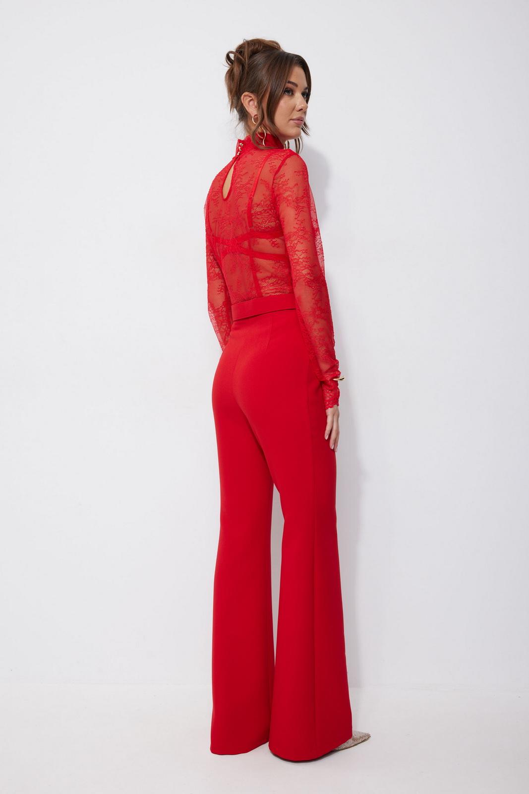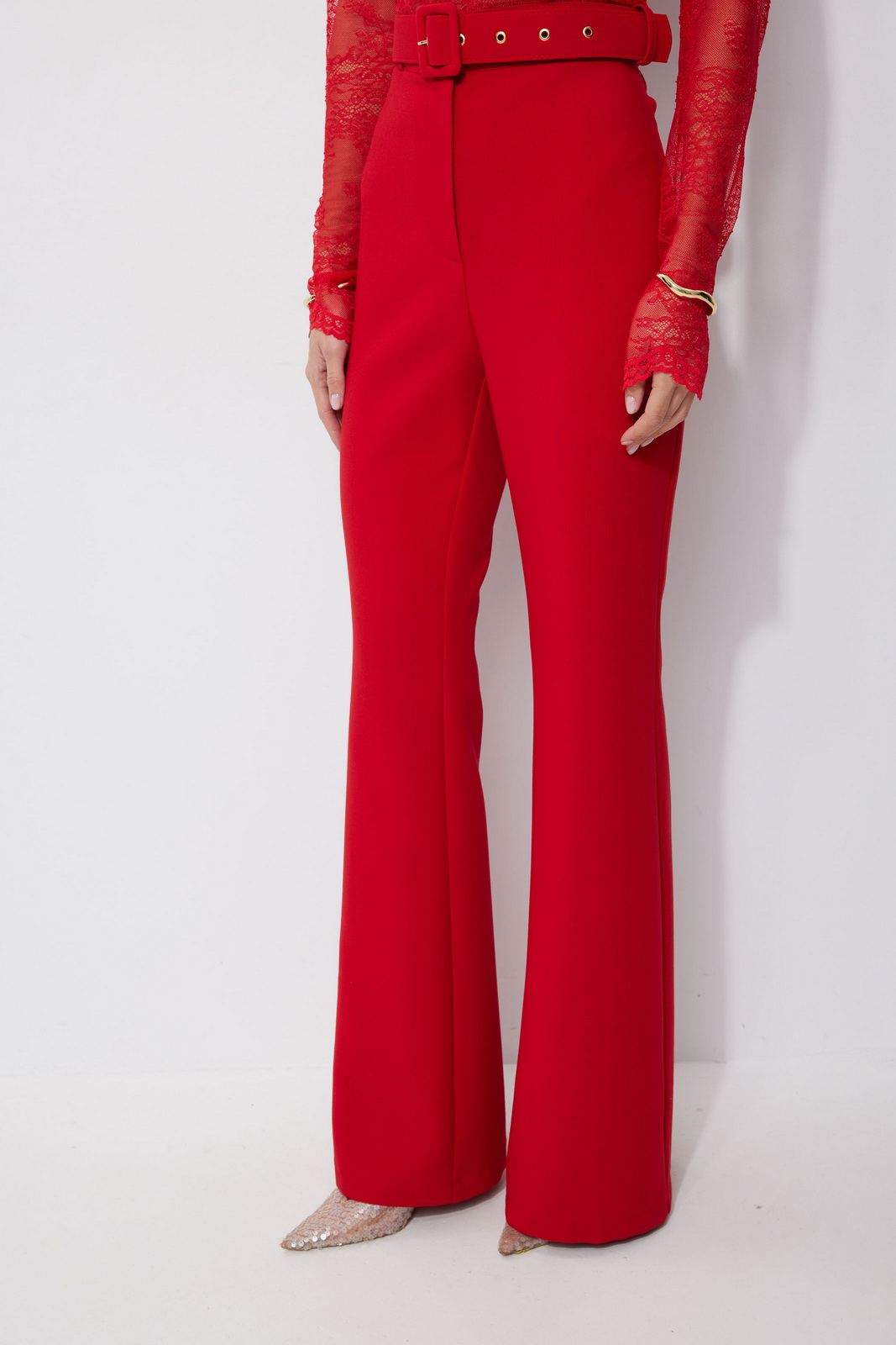 Описание: Брюки прилегающего силуэта расширенные книзу из костюмной ткани. По верху притачной пояс с застежкой на петлю и пуговицу и шлевками для ремня. На передних половинках обработана застежка молния в среднем шве. В комплект входит съемный ремень. Обращаем ваше внимание, что фурнитура может отличаться от фото.