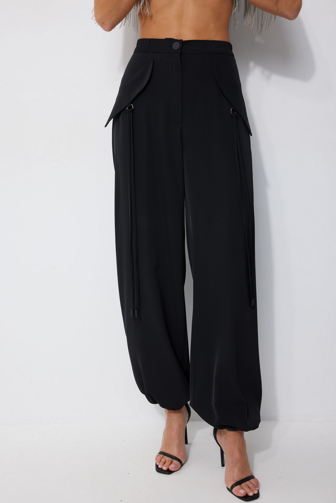 Описание: Брюки свободного силуэта из струящейся ткани. По верху брюк притачной пояс с застежкой на петлю и пуговицу. На передних половинках обработана застежка молния в среднем шве. На передних половинках декоративные клапаны. По поясу задних половинок брюк резинка и вытачки. Обращаем ваше внимание, что фурнитура может отличаться от фото.
