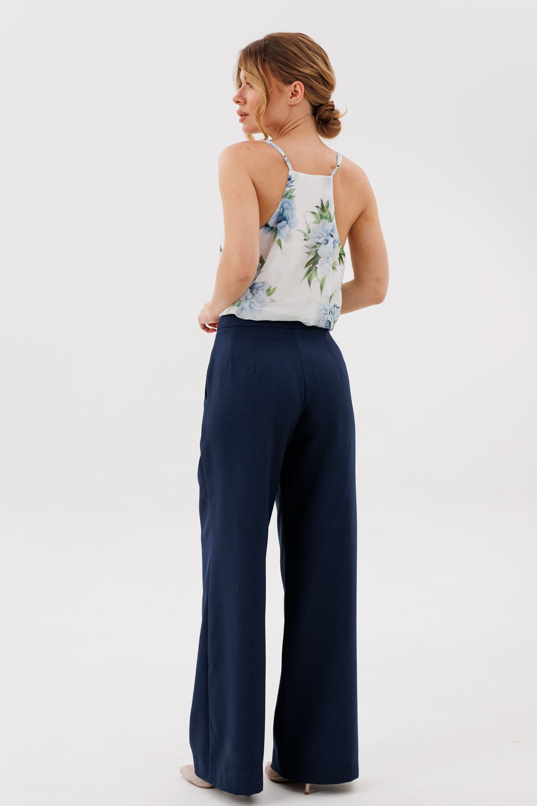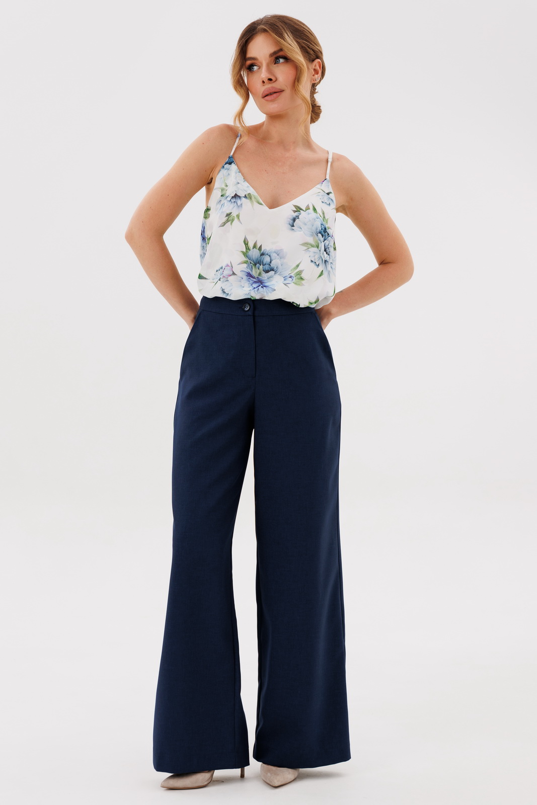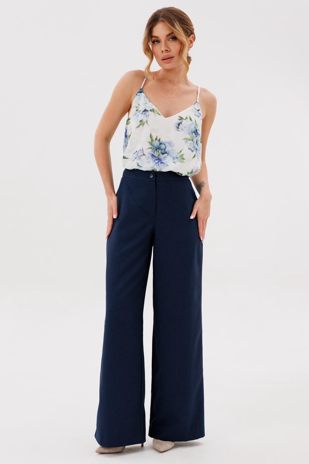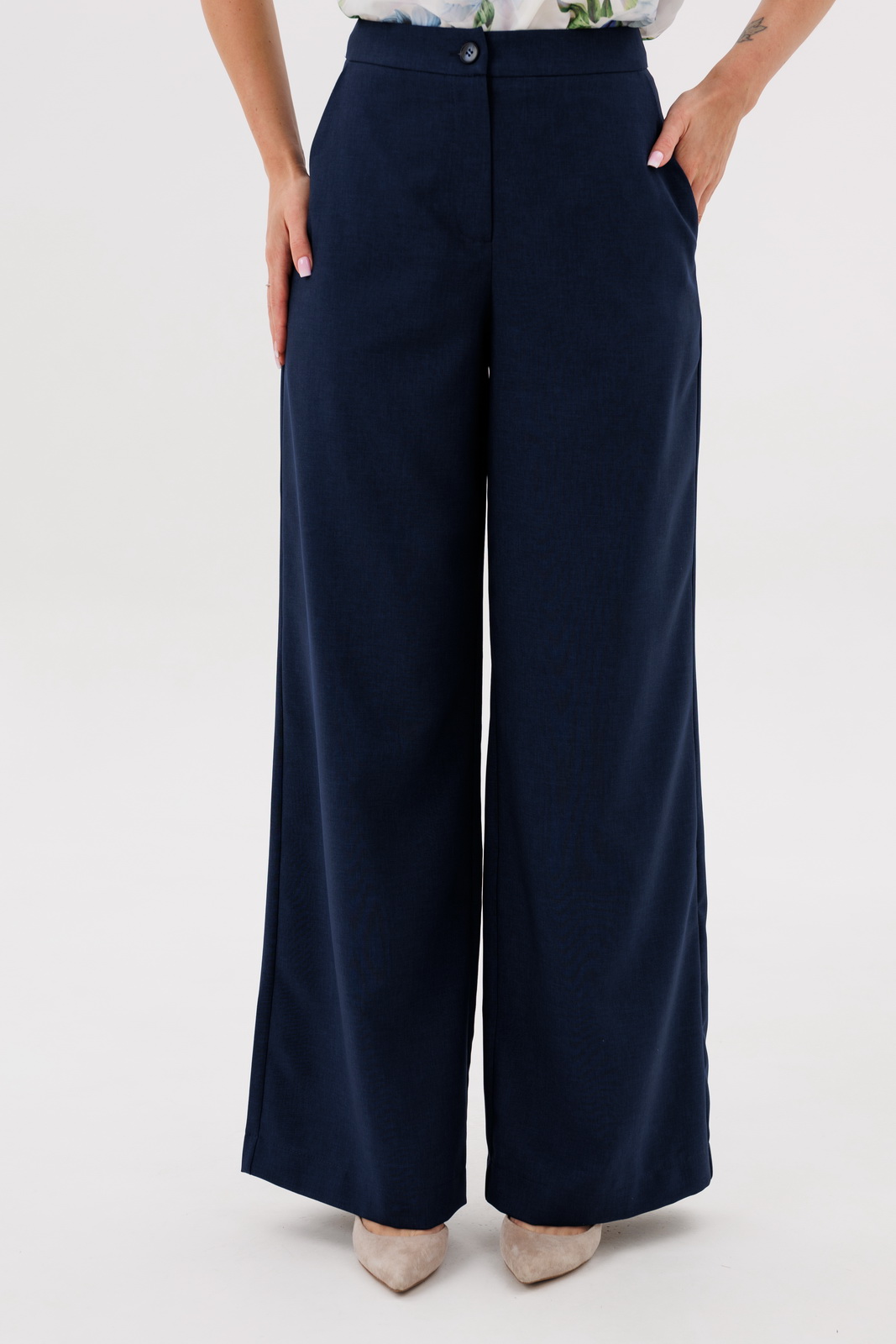 Описание: Брюки прямого силуэта на притачном поясе.По переду застежка на тесьму-молнию.По боковым действующие карманы