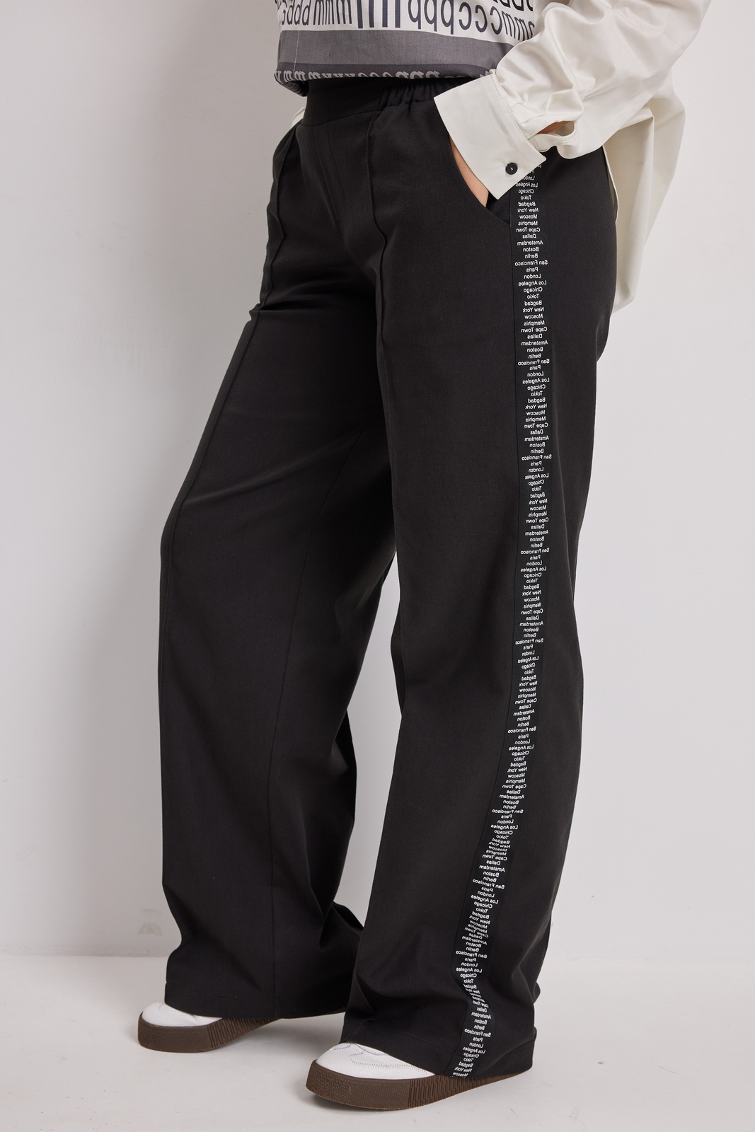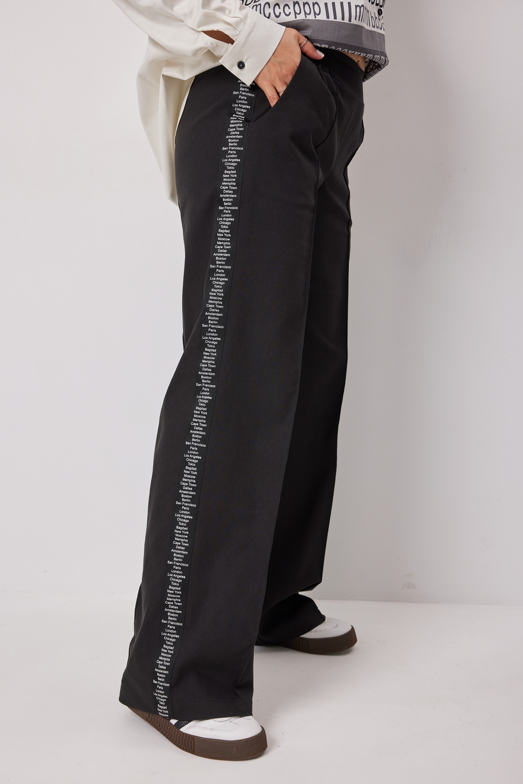 Описание: Брюки свободного кроя из тактильно приятной растяжимой джинсовой ткани – это модель которая необходима в гардеробе каждой модницы. Изюминка данной модели – настроченные декоративные ленты с текстовым принтом, что позволяет удлинить ножки благодаря акцентной вертикали в виде лент.