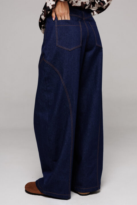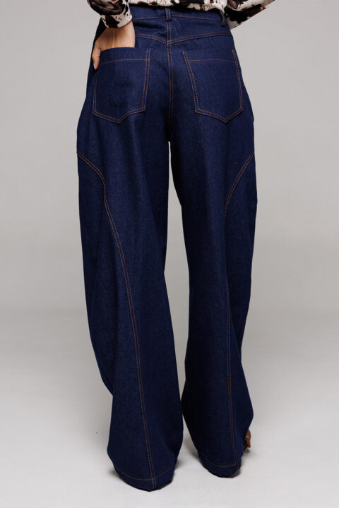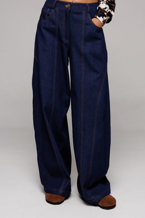 Описание: Брюки-джинсы немного заужены к низу. На притачном поясе со шлёвками, застежкой-гульфик. Пояс застегивается на петлю-пуговицу. По переду карманы и рельефы. По спинке кокетка, накладные карманы и рельефы.