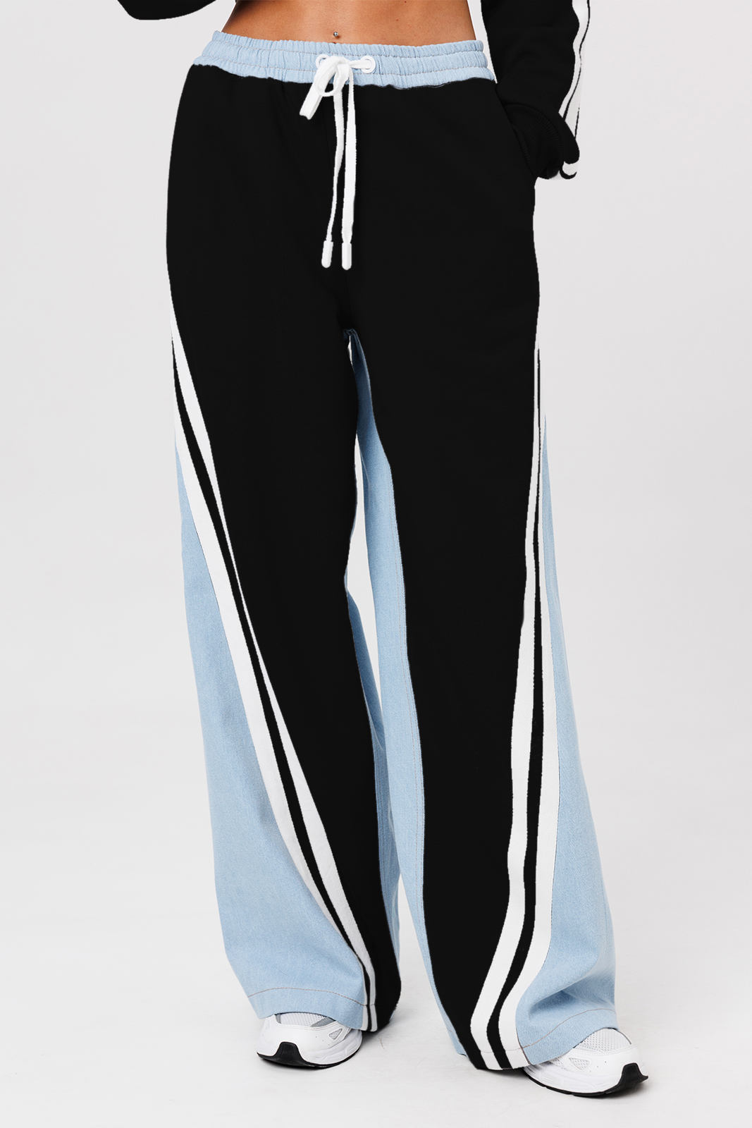 Описание: Брюки комбинированные (джинс + трикотаж), прямого силуэта на притачном отстроченном поясе на резинке и втянутым в него декоративным шнурком. По переду карманы в боковых швах с наклонным входом, диагональные рельефы и настрочены широкие лампасы вдоль рельефа. Спинка с накладными карманами.