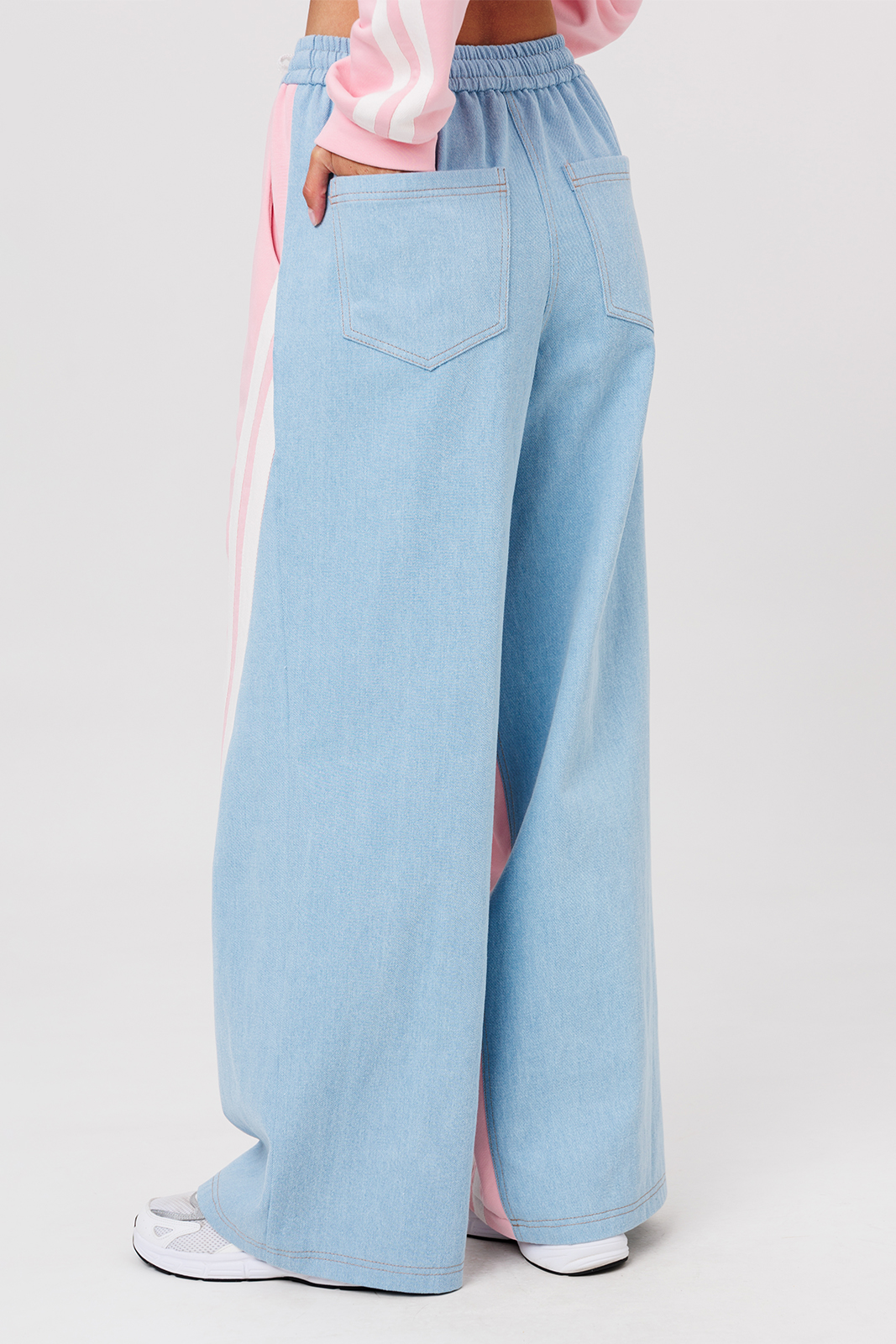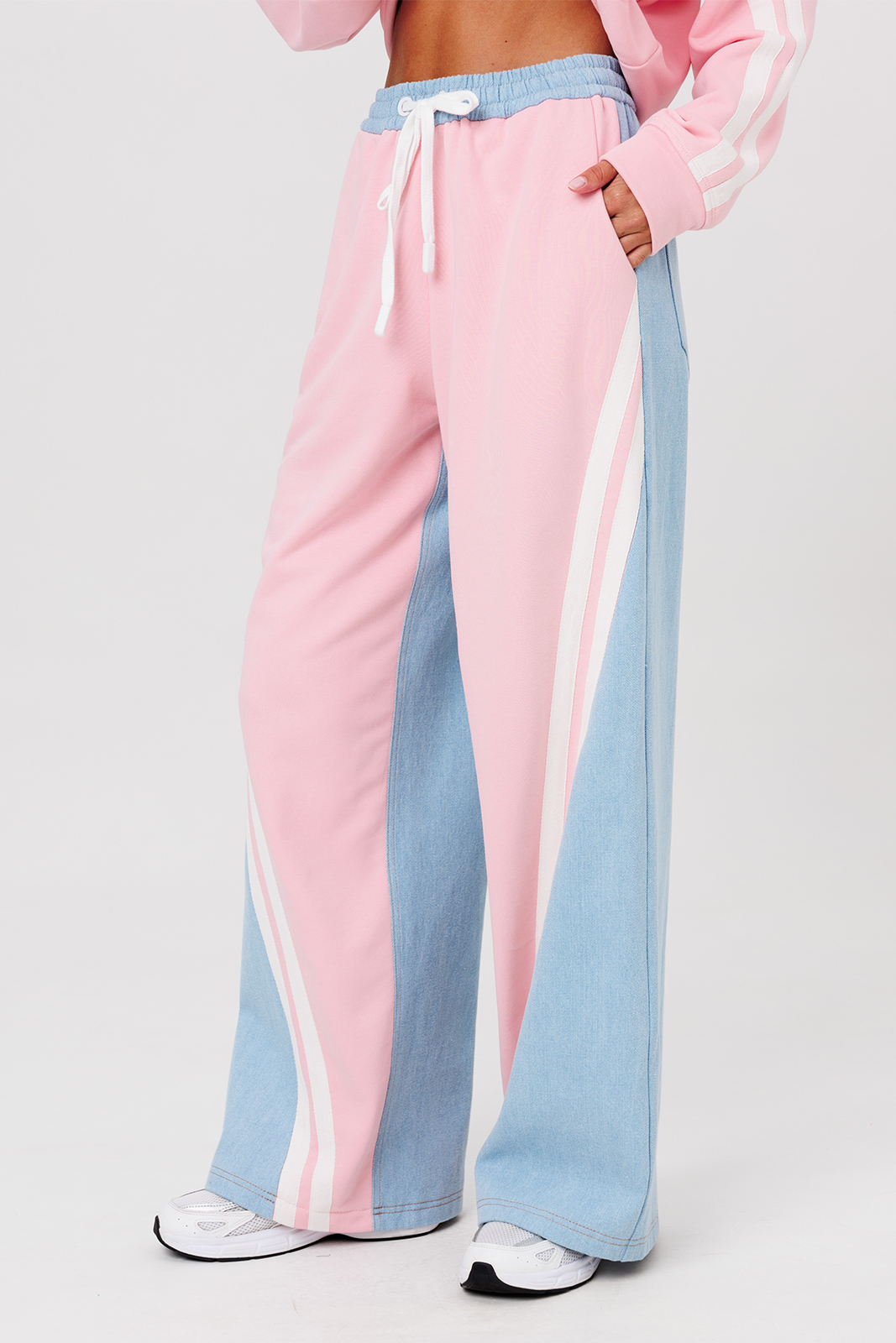 Описание: Брюки комбинированные (джинс + трикотаж), прямого силуэта на притачном отстроченном поясе на резинке и втянутым в него декоративным шнурком. По переду карманы в боковых швах с наклонным входом, диагональные рельефы и настрочены широкие лампасы вдоль рельефа. Спинка с накладными карманами.
