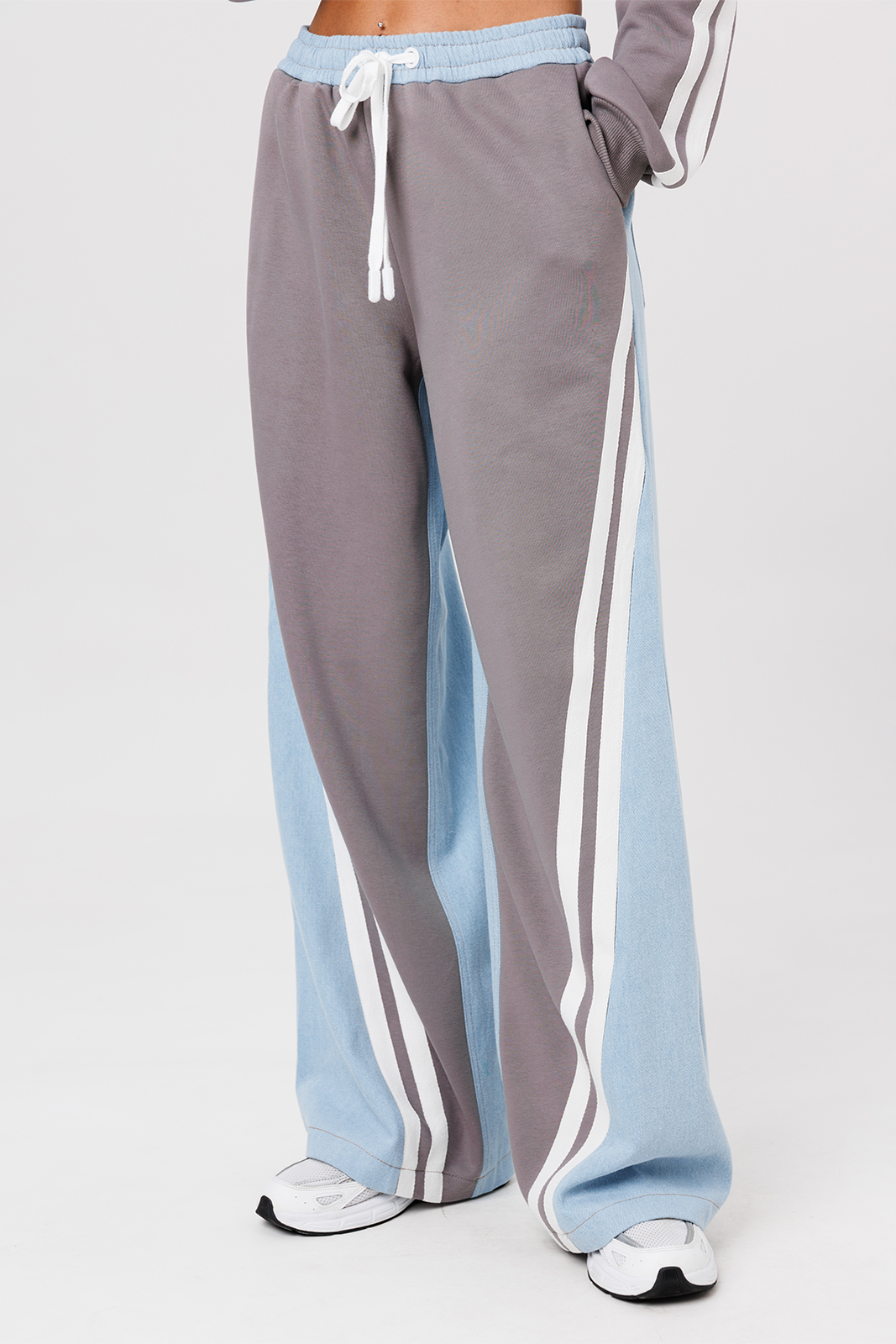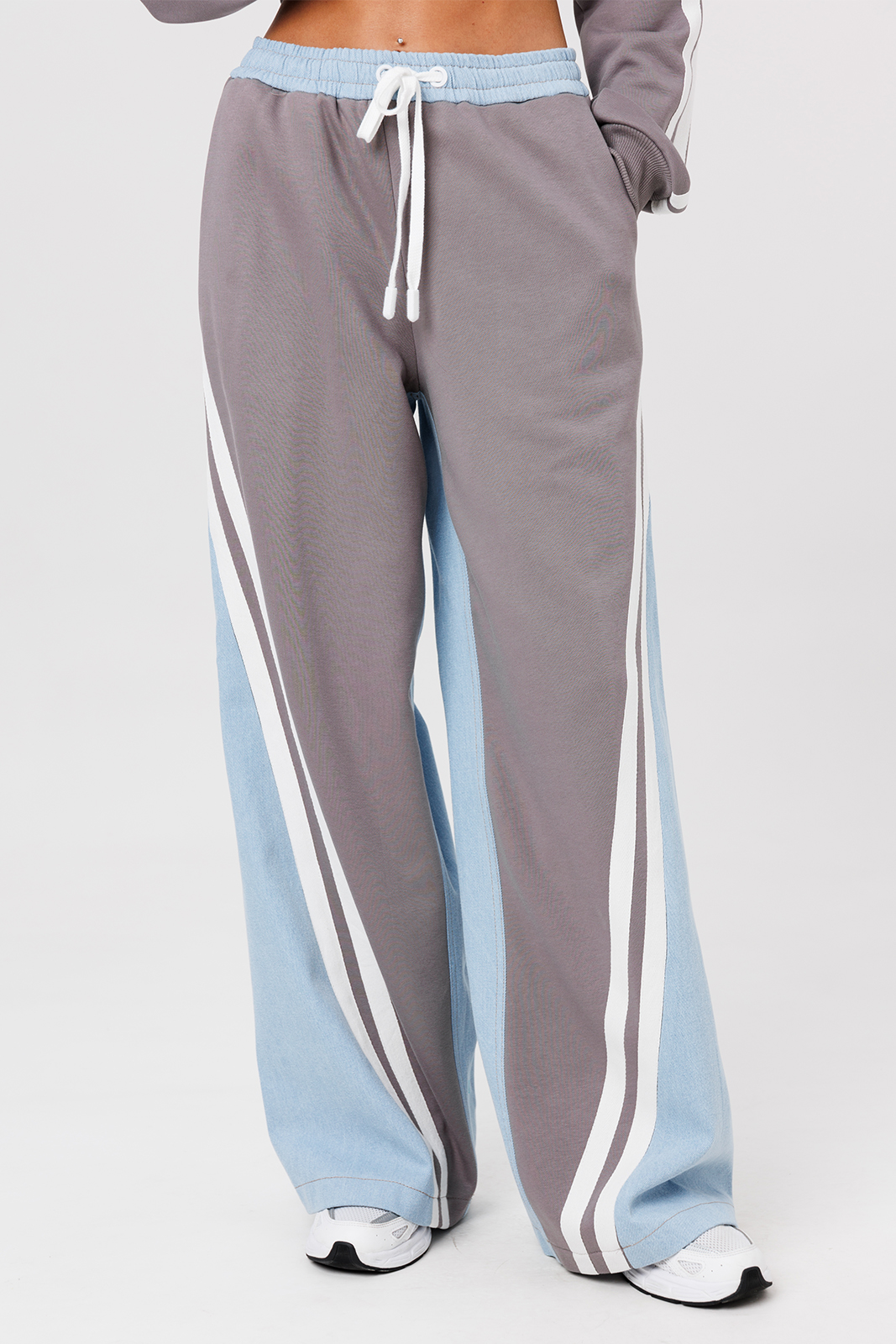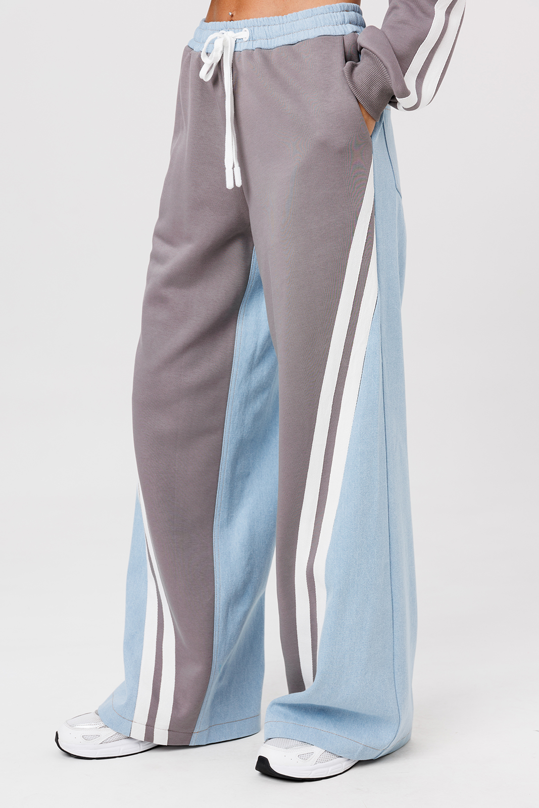 Описание: Брюки комбинированные (джинс + трикотаж), прямого силуэта на притачном отстроченном поясе на резинке и втянутым в него декоративным шнурком. По переду карманы в боковых швах с наклонным входом, диагональные рельефы и настрочены широкие лампасы вдоль рельефа. Спинка с накладными карманами.
