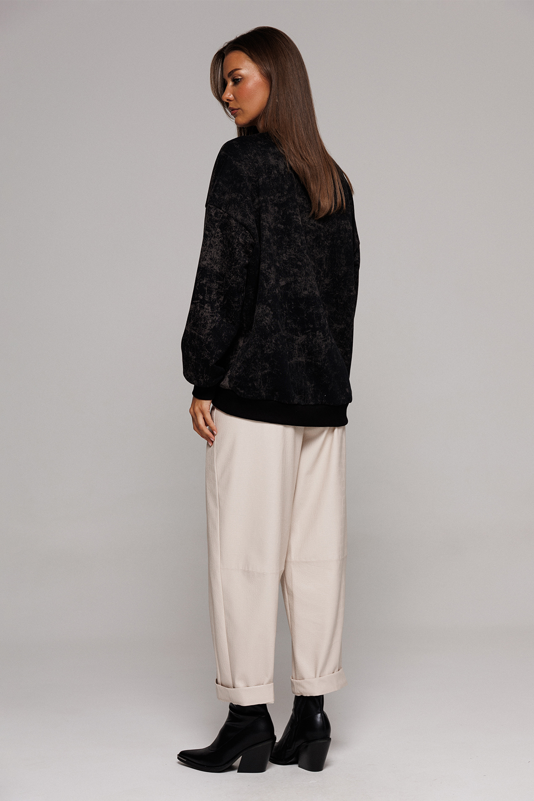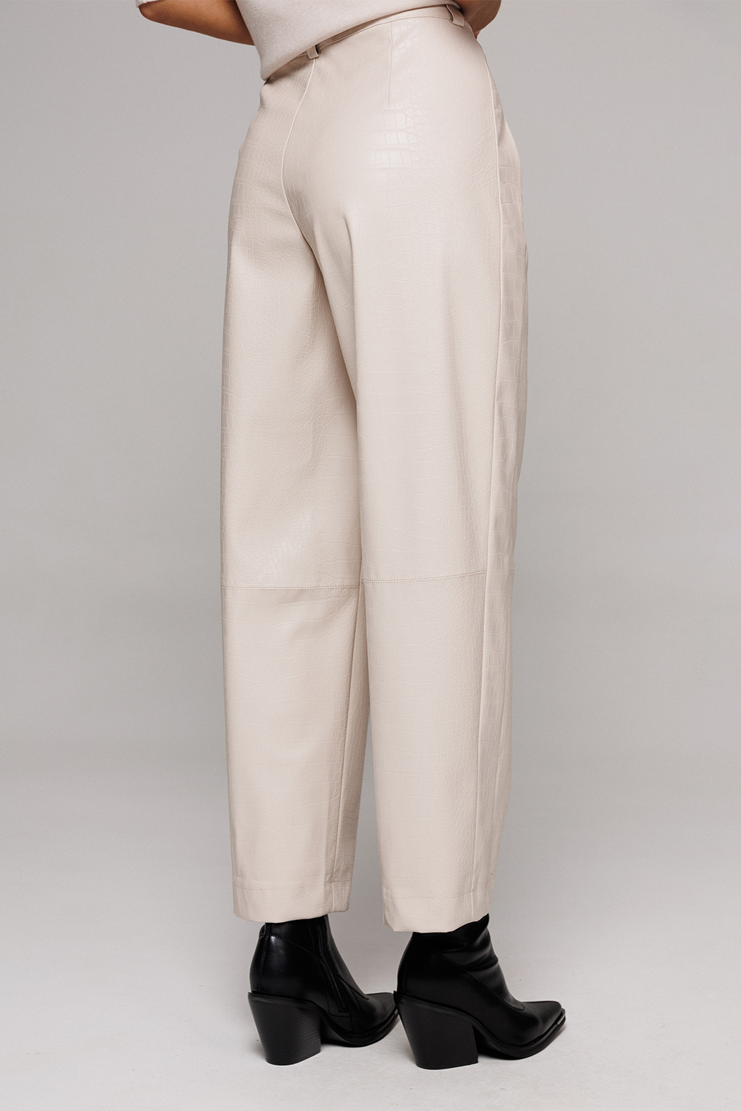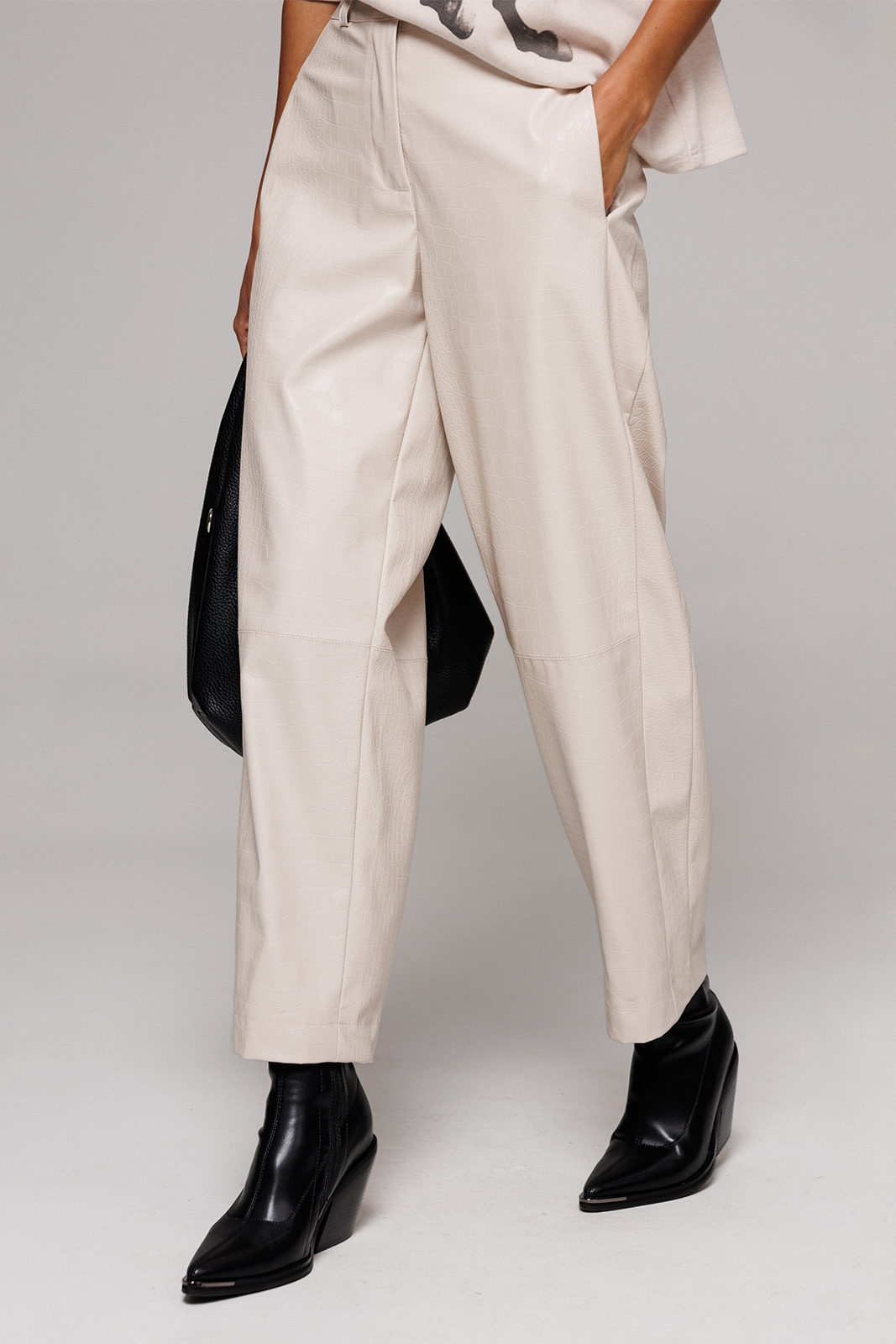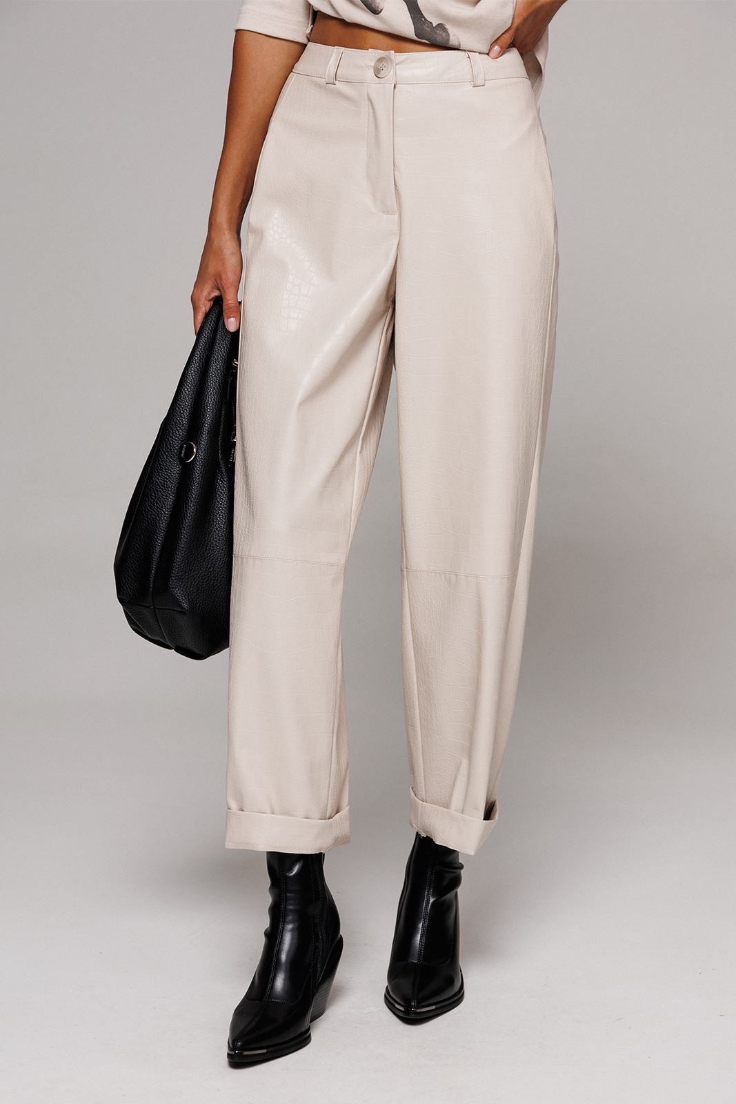 Описание: Брюки их эко-кожи немного заужены к низу. На притачном поясе со шлёвками, застежкой-гульфик. Пояс застегивается на петлю-пуговицу. По переду рельефы и карманами в них. По спинке вытачка от пояса. По переду и спинке брюки отрезные по лини колен.