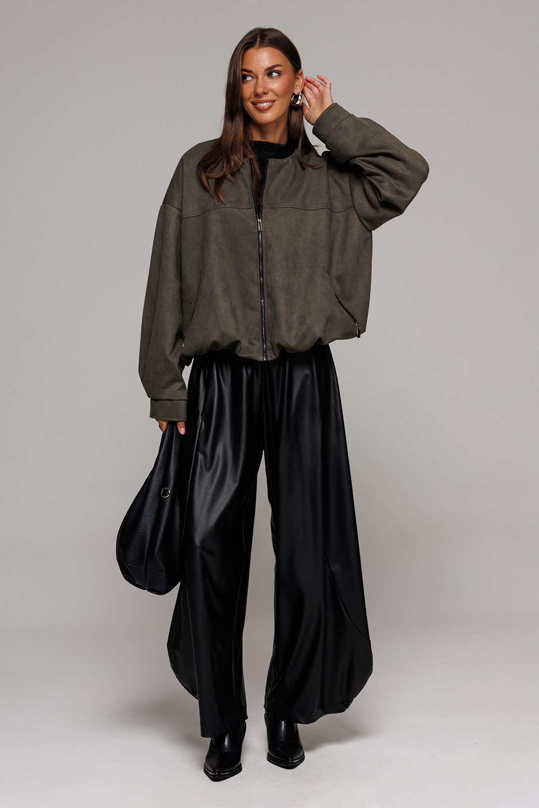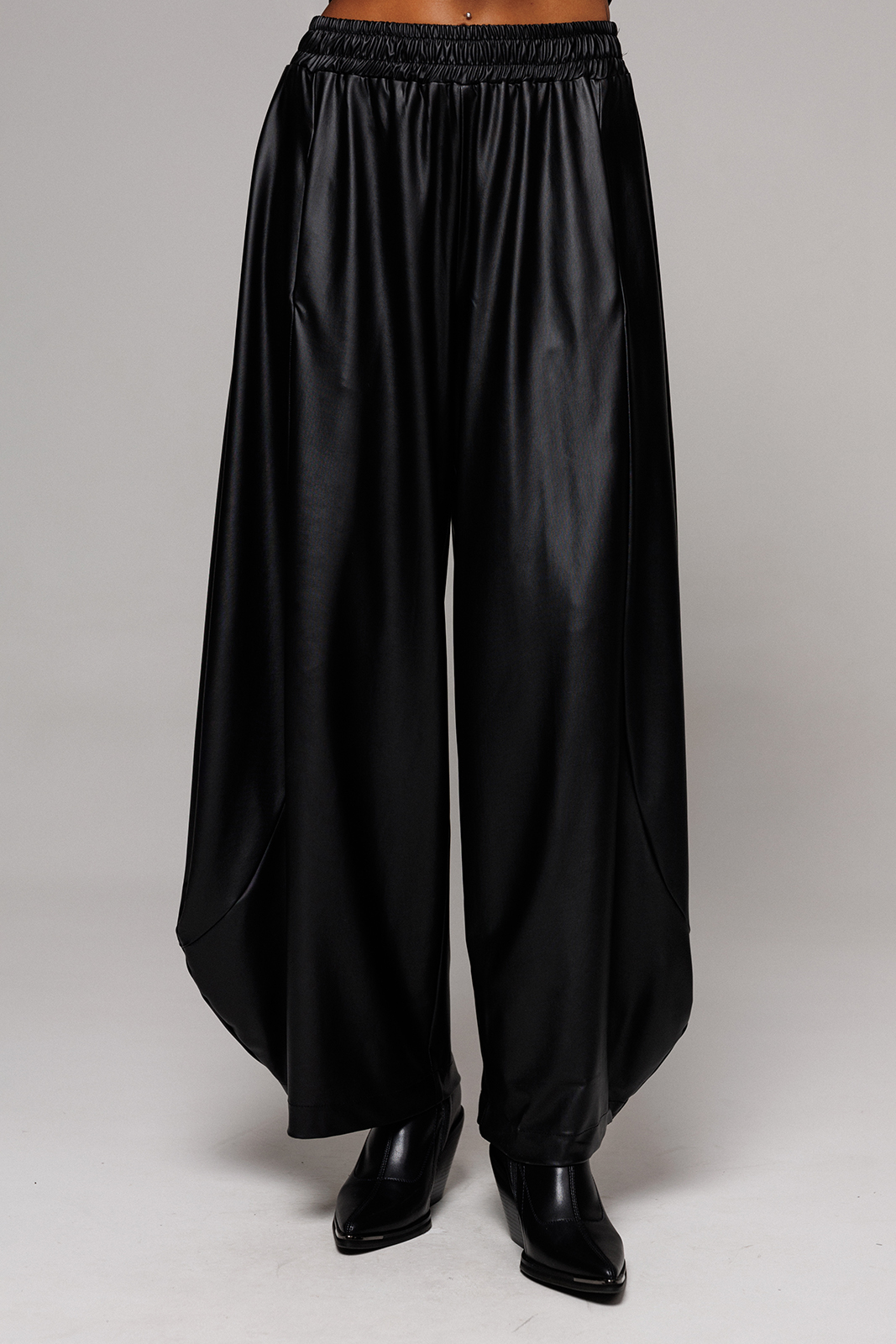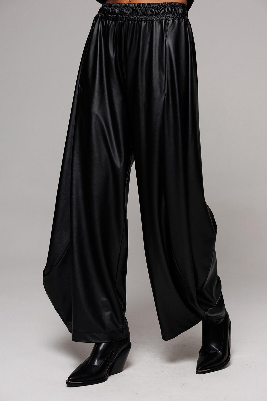 Описание: Брюки-шаровары из эко-кожи свободного силуэта, зауженные к низу, на притачном отсроченном поясе со вставленной в него резинкой. Полочка с карманом в рельефе. По переду и спинке фигурные рельефы.