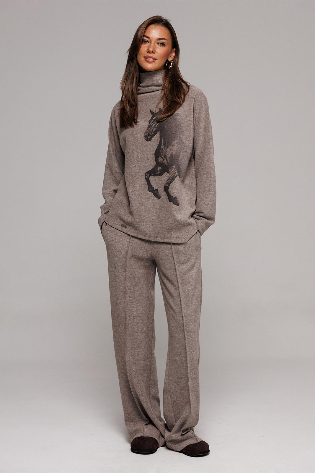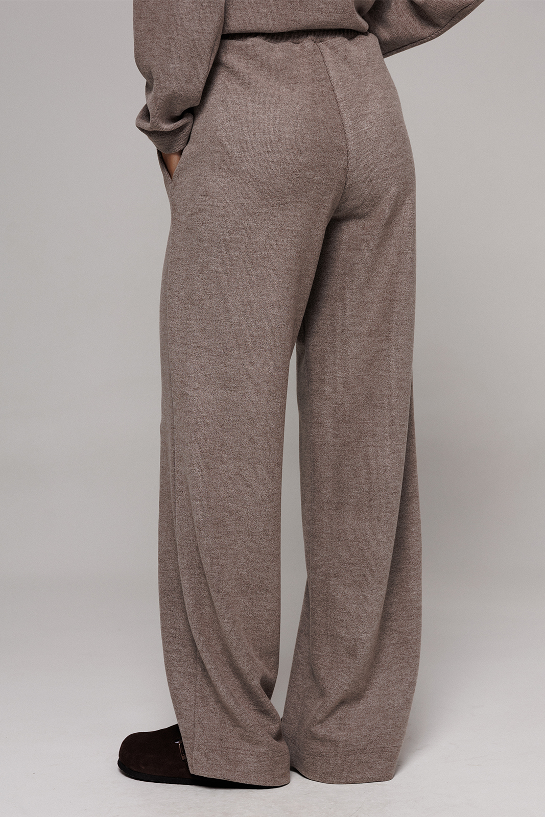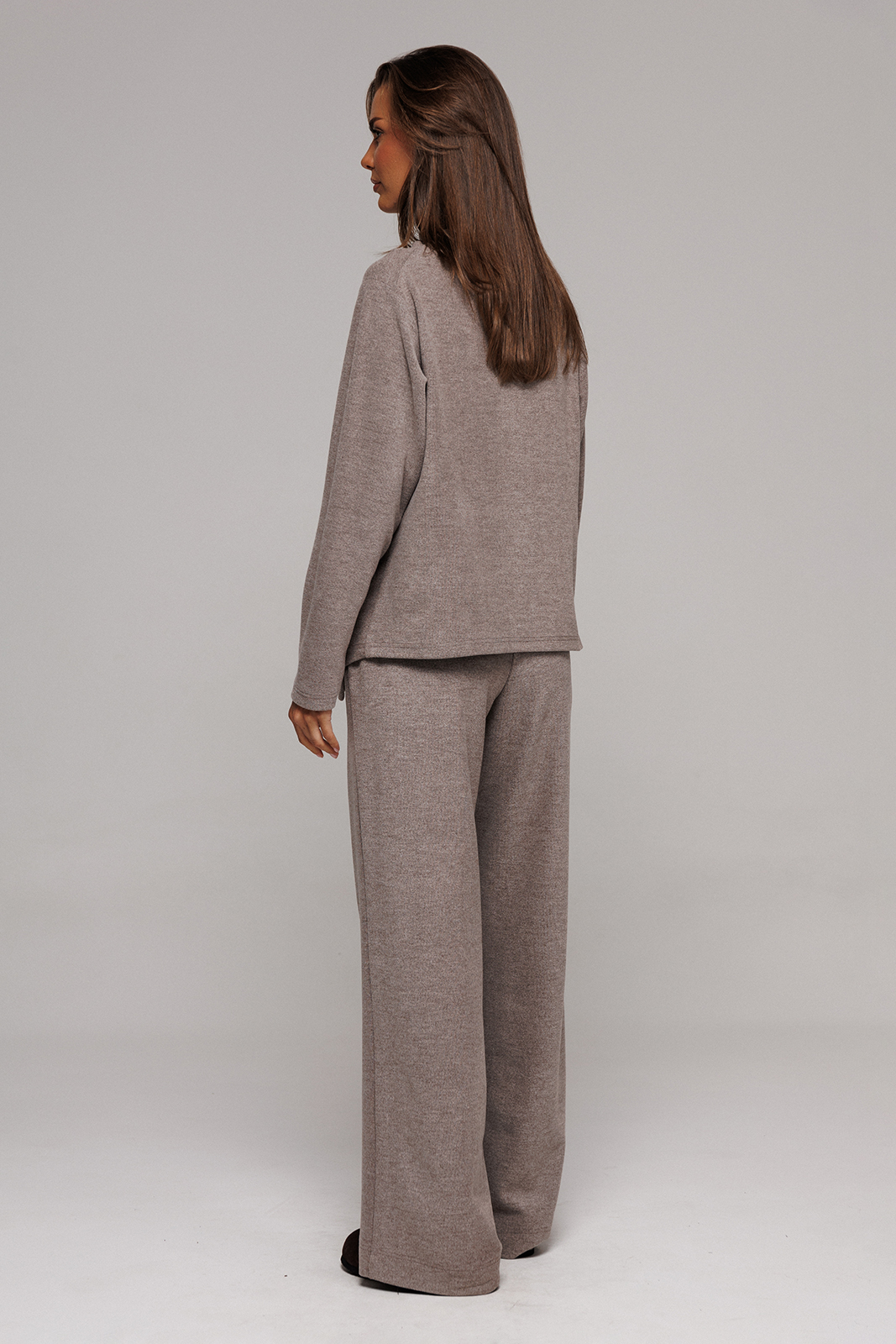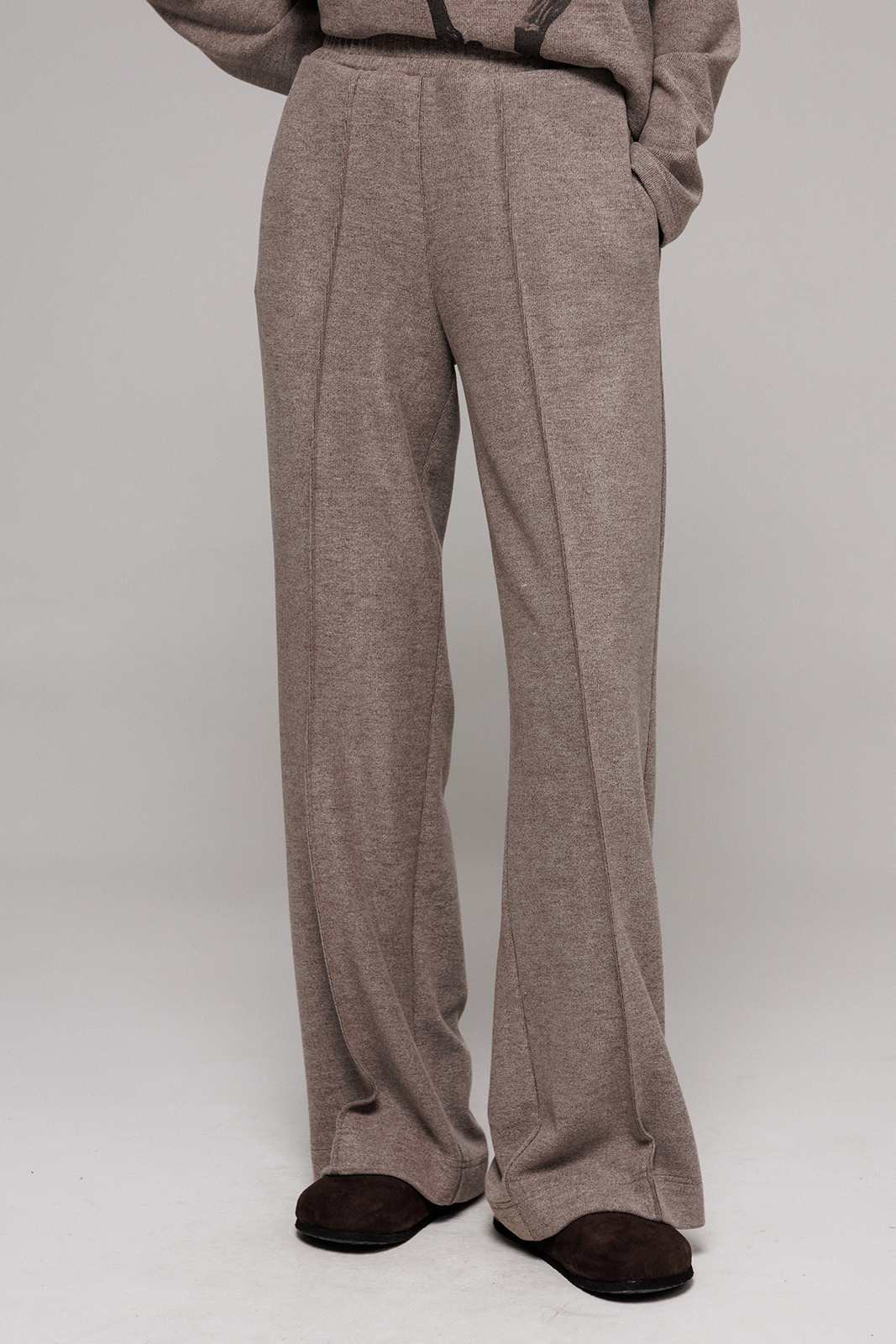 Описание: Брюки из трикотажного полотна с велюровым эффектом прямого силуэта на притачном, отстроченном поясе со вставленной в него резинкой. Полочка с защипами от пояса до низа брюк. Брюки с карманами в боковых швах.