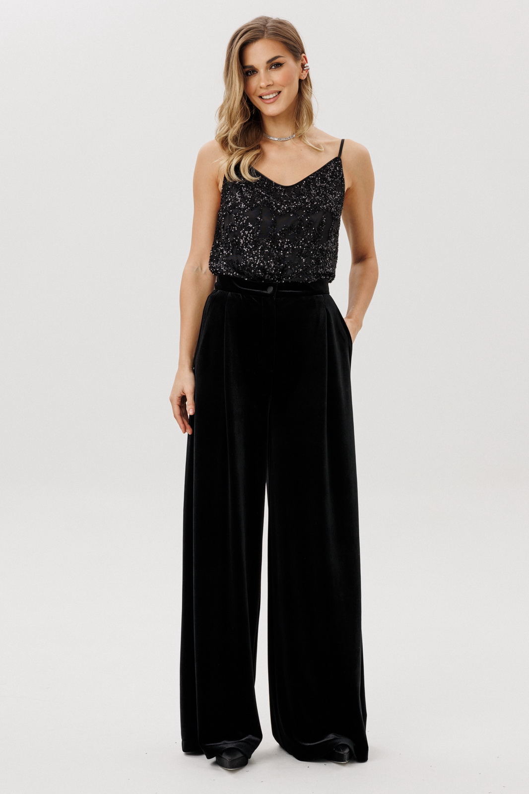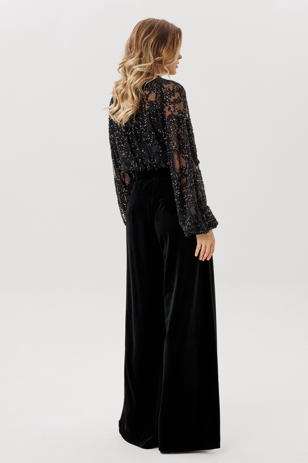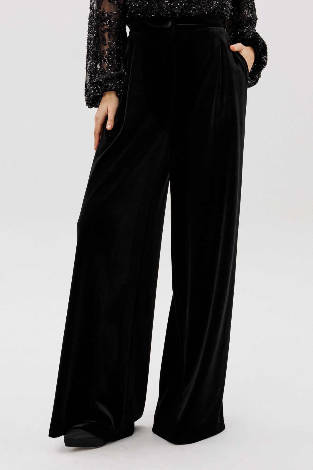 Описание: Брюки-палаццо выполнены из бархата. Брюки на притачном поясе, длиной в пол, расширенные к низу. Спереди складки и боковые карманы с наклонным входом. Застежка спереди на молнию с гульфиком и пуговицу. На задних частях обработаны талиевые вытачки.