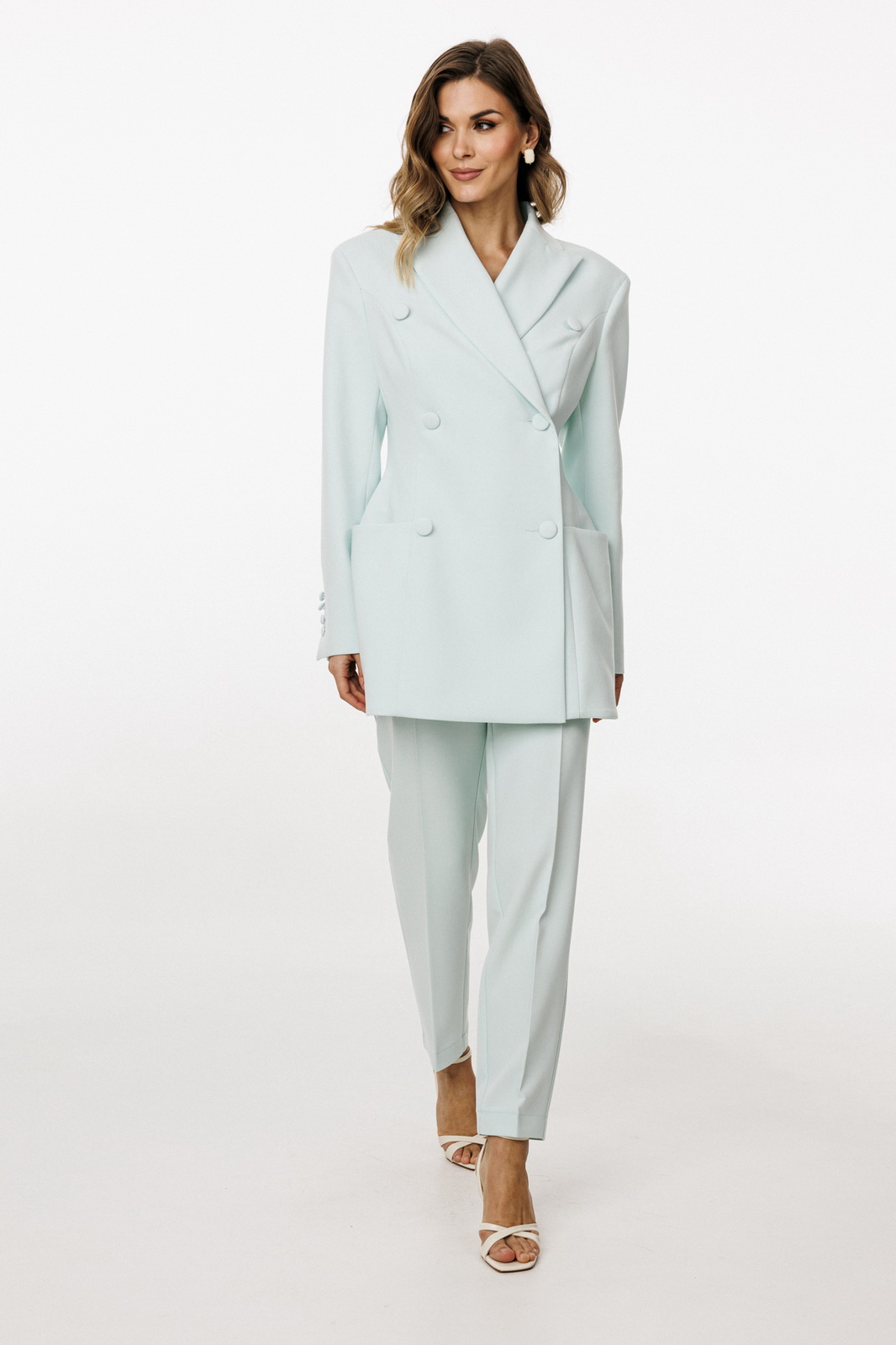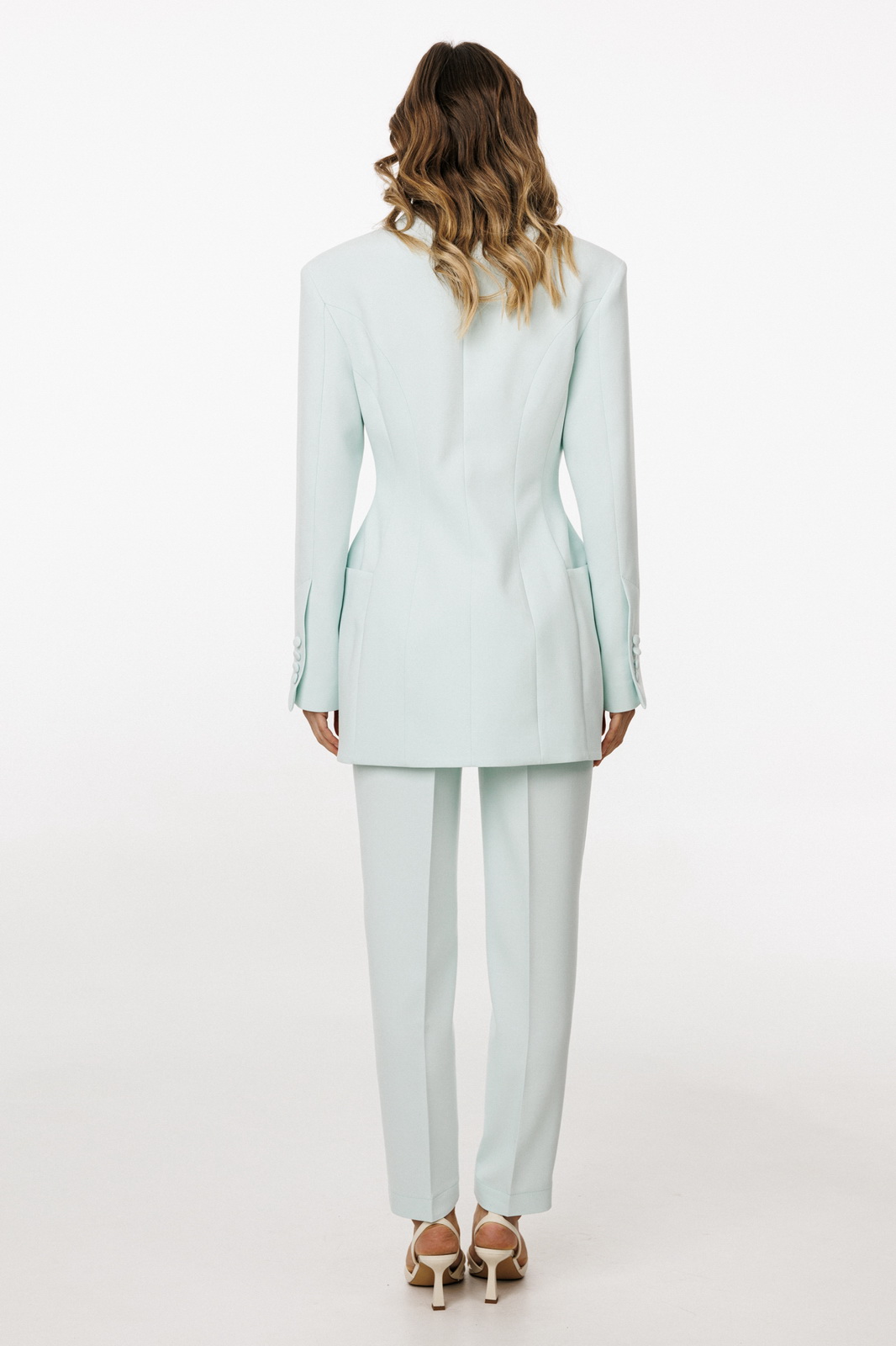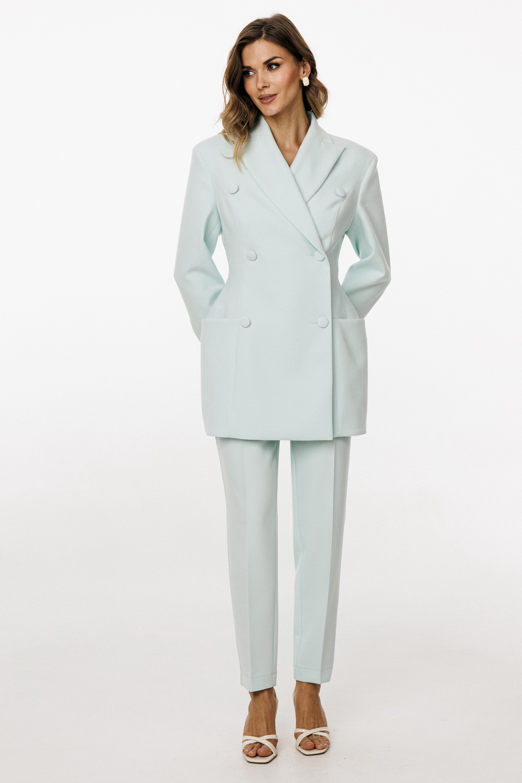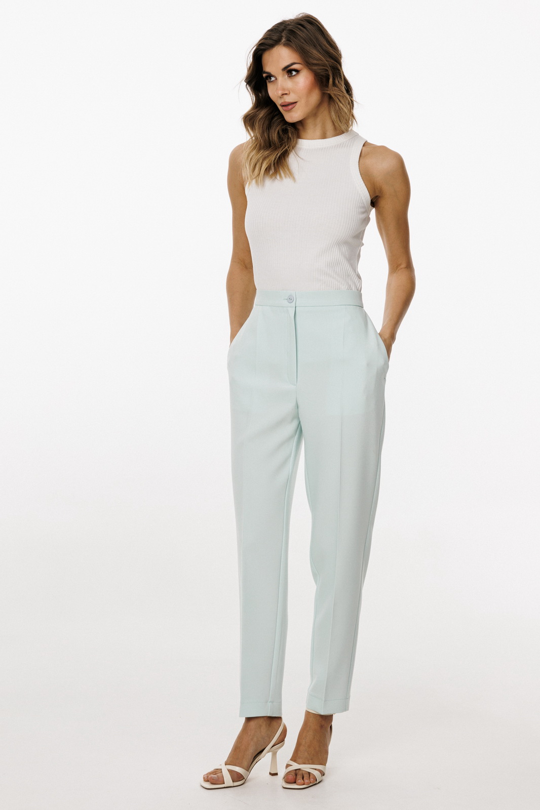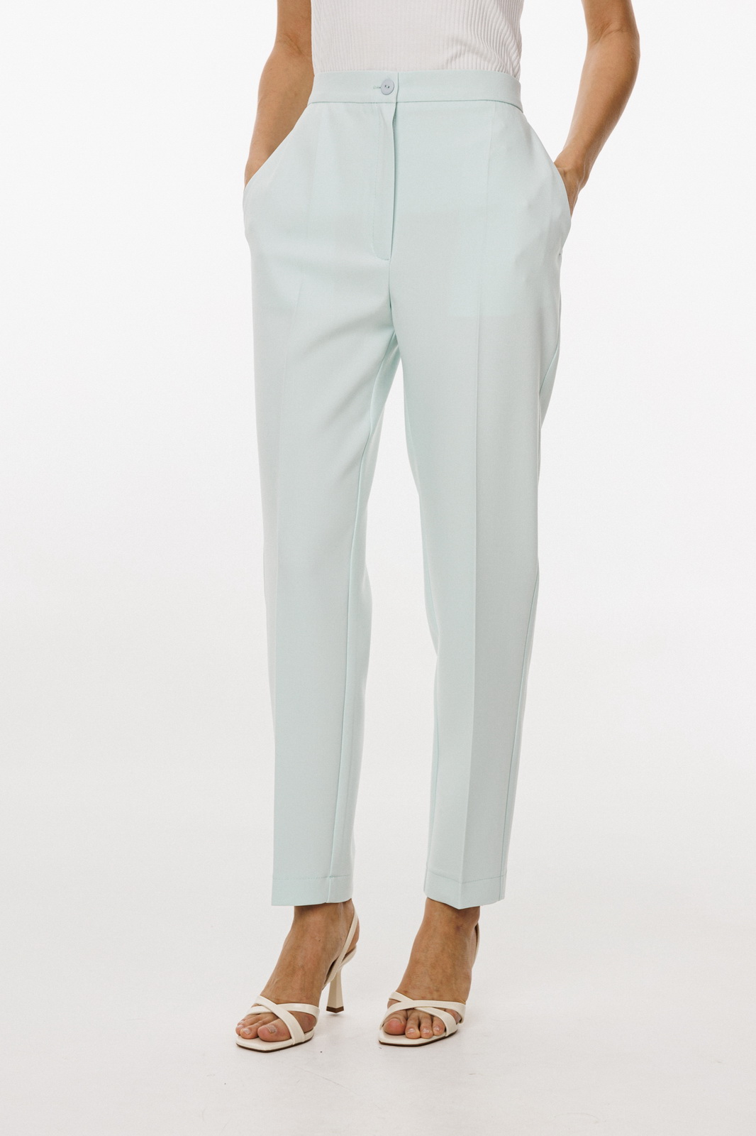 Описание: Брюки выполнены из костюмной ткани. Брюки зауженные к низу, длиной 7/8, на притачном поясе. Спереди боковые карманы с наклонным входом и застежка на молнию.