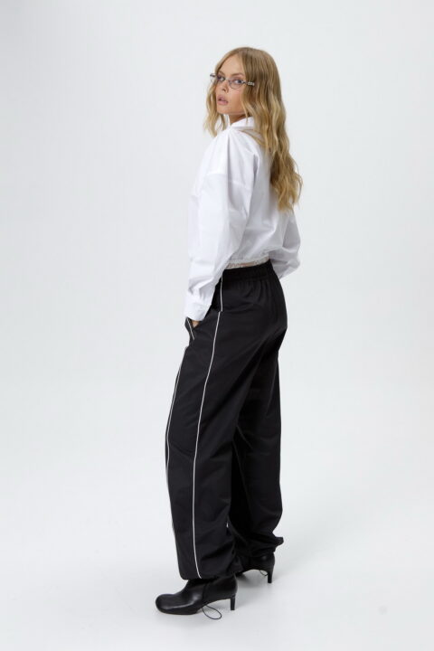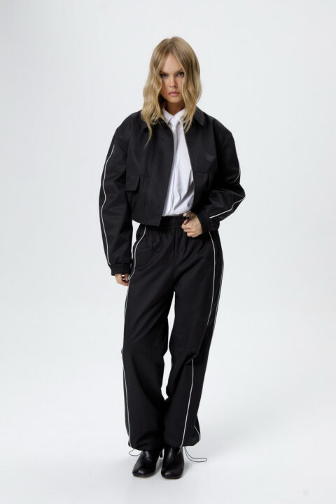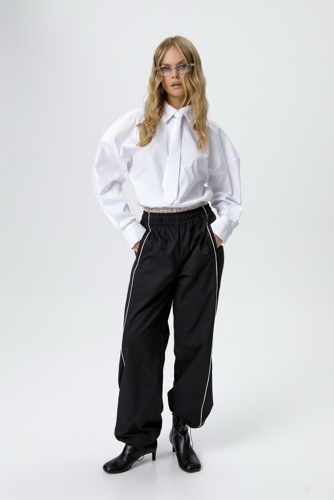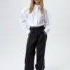 Детали: высокая посадка, функциональные карманы, пояс и низ брюк с резинкой и регулируемыми фиксаторами.