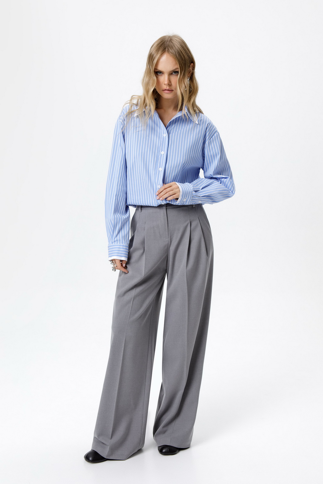 Детали: широкие брюки-палаццо с небольшими складками у пояса и заутюженными стрелками, притачной пояс со шлевками, застежка на молнию и пуговицу, боковые карманы. Задние части брюк с вытачками и имитацией карманов.