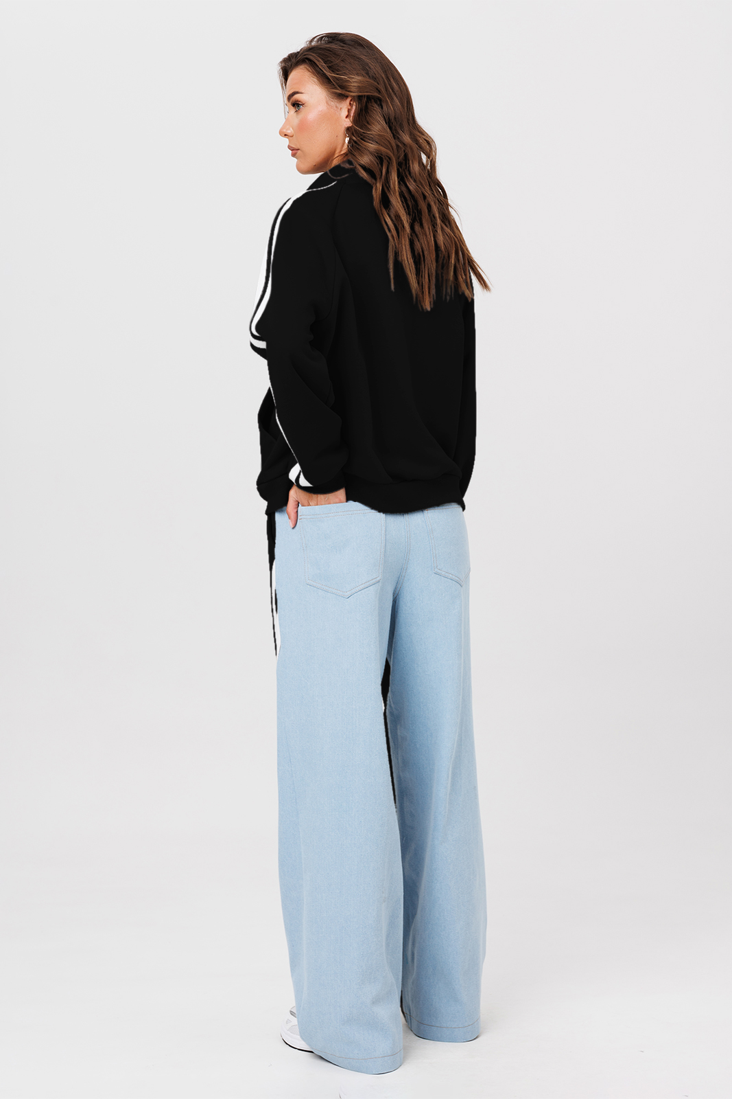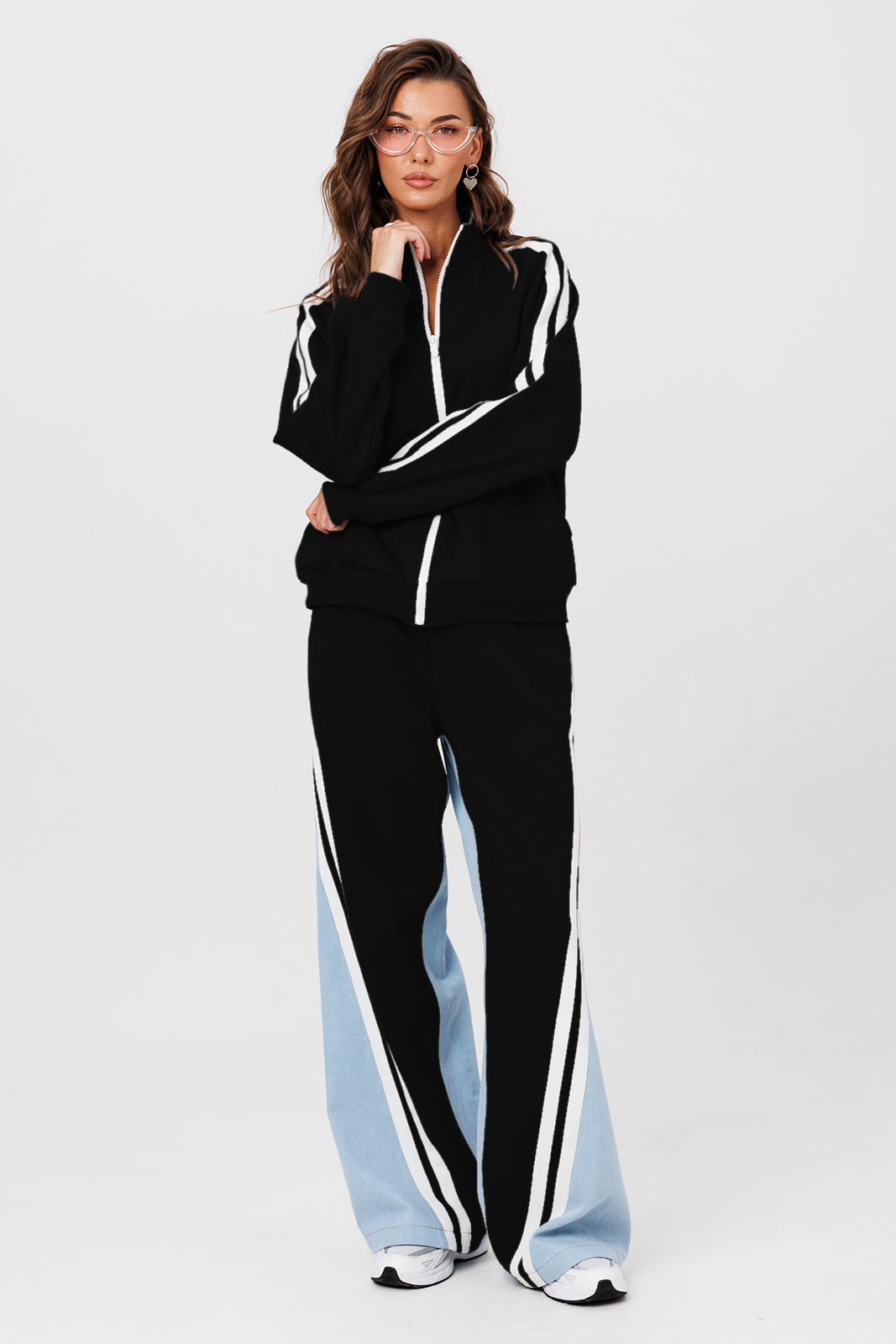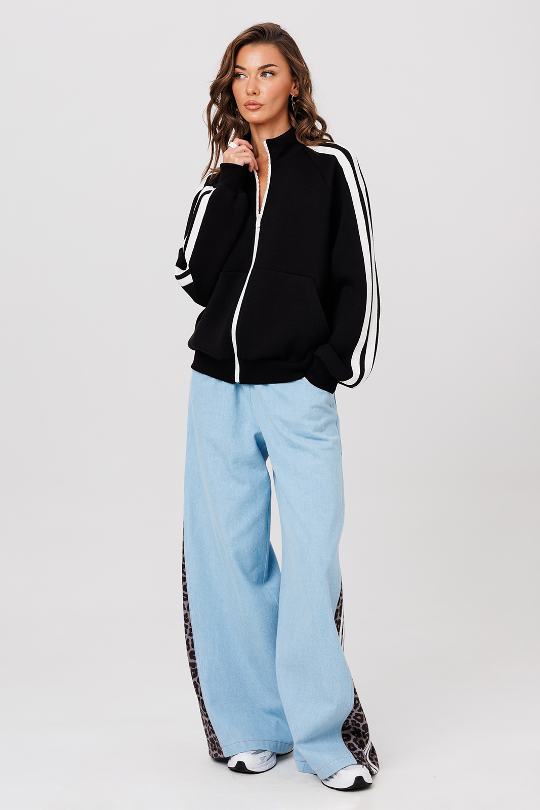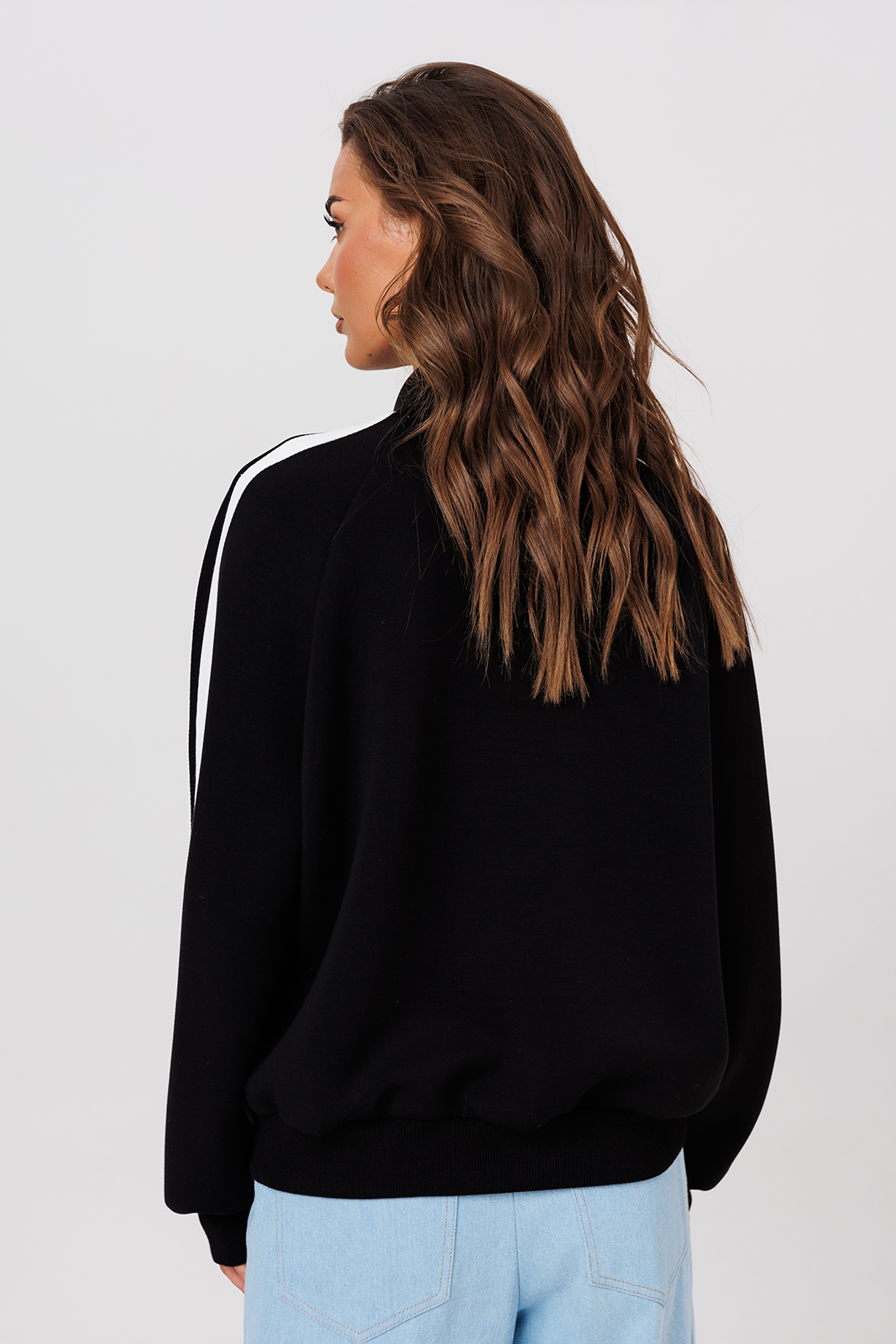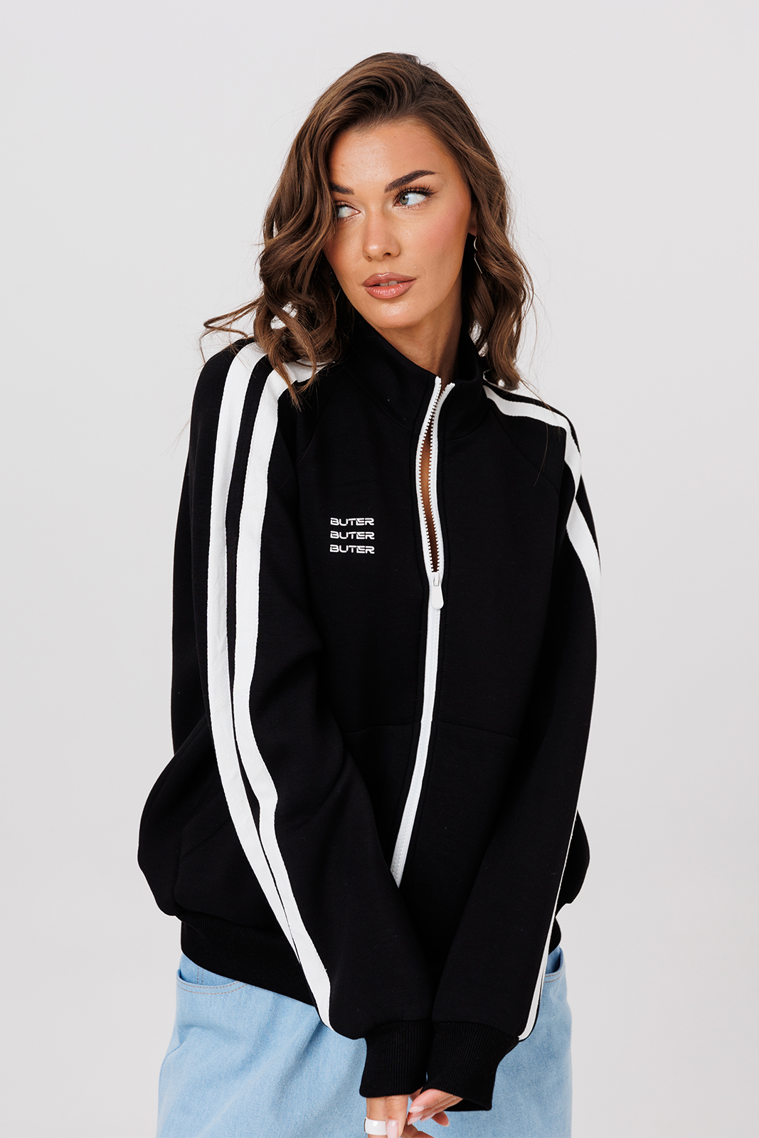 Описание: Джемпер трикотажный прямого силуэта с втачным длинным рукавом-реглан внизу на притачной манжете. Рукав с широкими настроченными лампасами. Полочка, с центральной застежкой на тесьму-молнию, карманом-кенгуру и печатью «BUTER». По низу джемпера притачная планка. Воротник-стойка. Джемпер без подкладки.