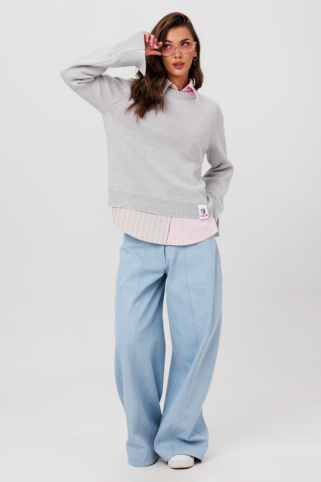 Описание: Джемпер трикотажный вязанный с длинным рукавом-реглан, по низу рукава планка с разрезом. На правом рукаве нашивка «ЛЮБОВЬ». По перу нашивка «BUTER». По горловине притачная планка из основного трикотажа, вырез горловины круглый.
