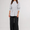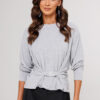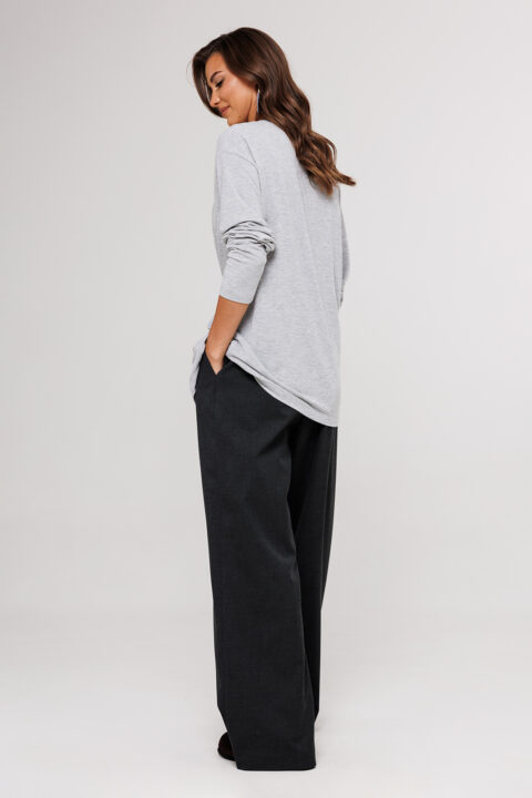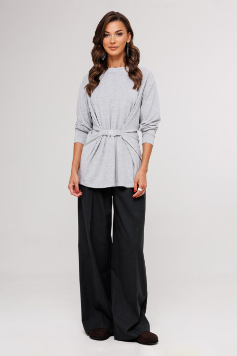 Описание: Джемпер трикотажный прямого силуэта со спущенной линией плеча и длинным рукавом. По переду отрезной бочек, в шов которого вставлен фастекс, благодаря чему у джемпера меняется силуэт и образуются дополнительные драпировки. По горловине притачная планка из основной ткани.