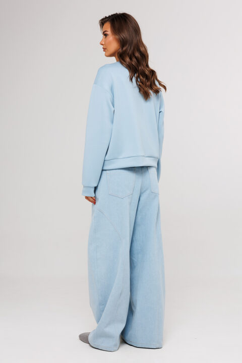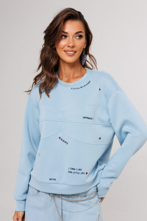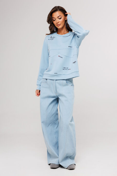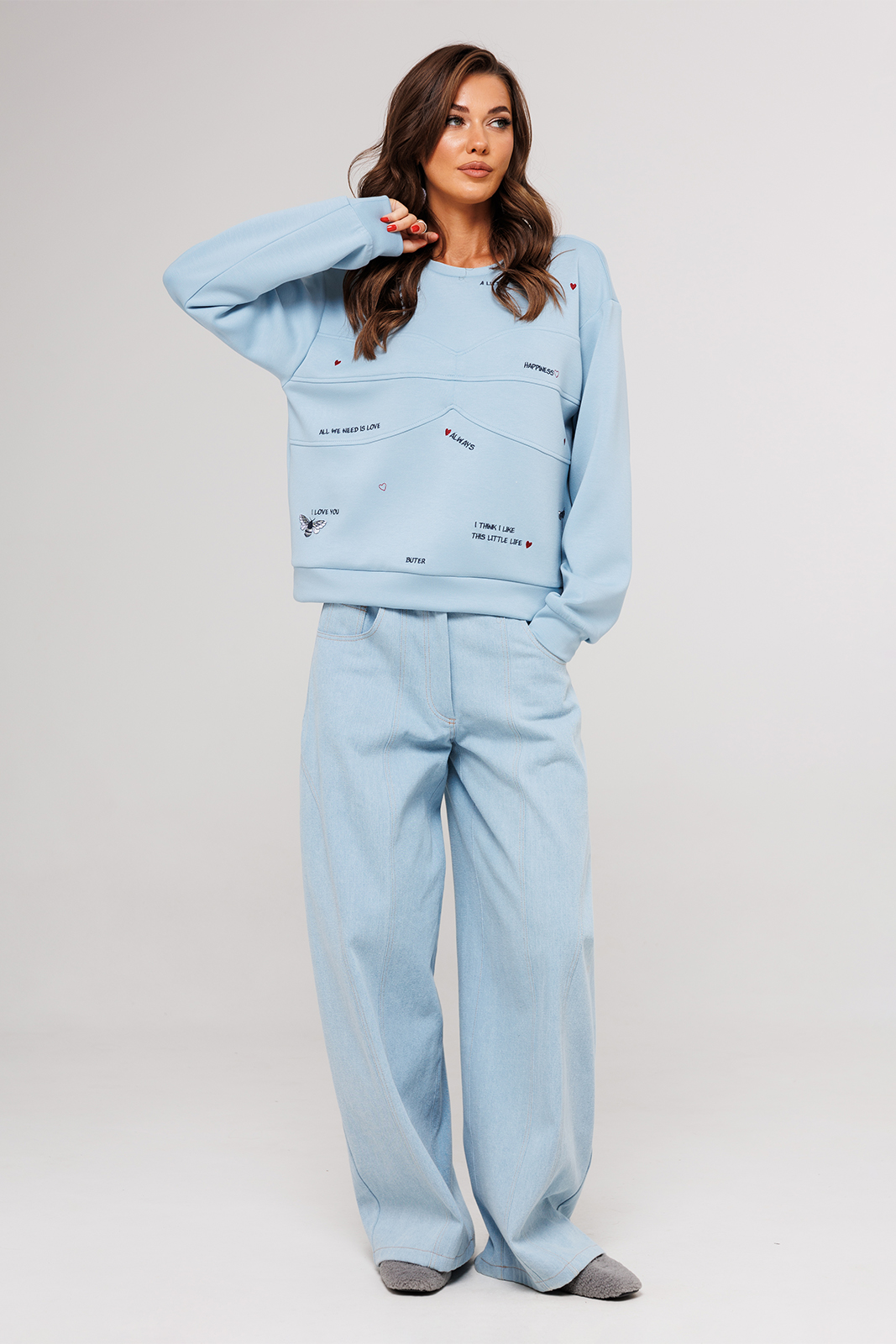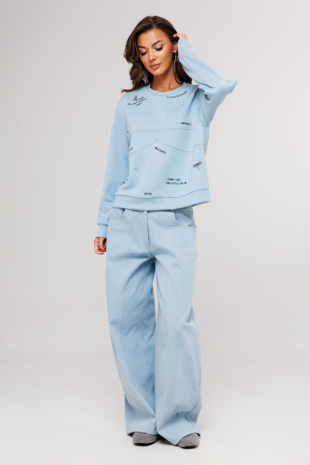 Описание: Джемпер из технологичного трикотажного полотна с эффектом peach. Прямого силуэта с втачным рукавом и спущенной линией плеча, с манжетой из основной ткани по низу рукава. Полочка с фигурными подрезами, имитирующими лиф и вышивкой. По горловине и низу изделия притачная планка из основной ткани.