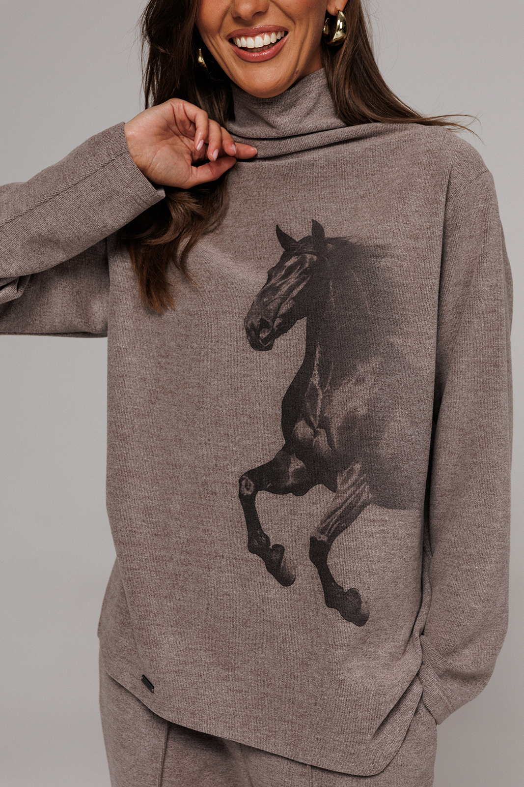 Описание: Джемпер из трикотажного полотна с велюровым эффектом прямого силуэта со спущенной линией плеча. Рукав втачной. По переду печать “Лошадь” и нашивка с гравировкой “BUTER”. Низ джемпера по переду фигурный ассиметричный. Внизу по правому боковому шву обработан разрез. Воротник-стойка цельнокроеный.