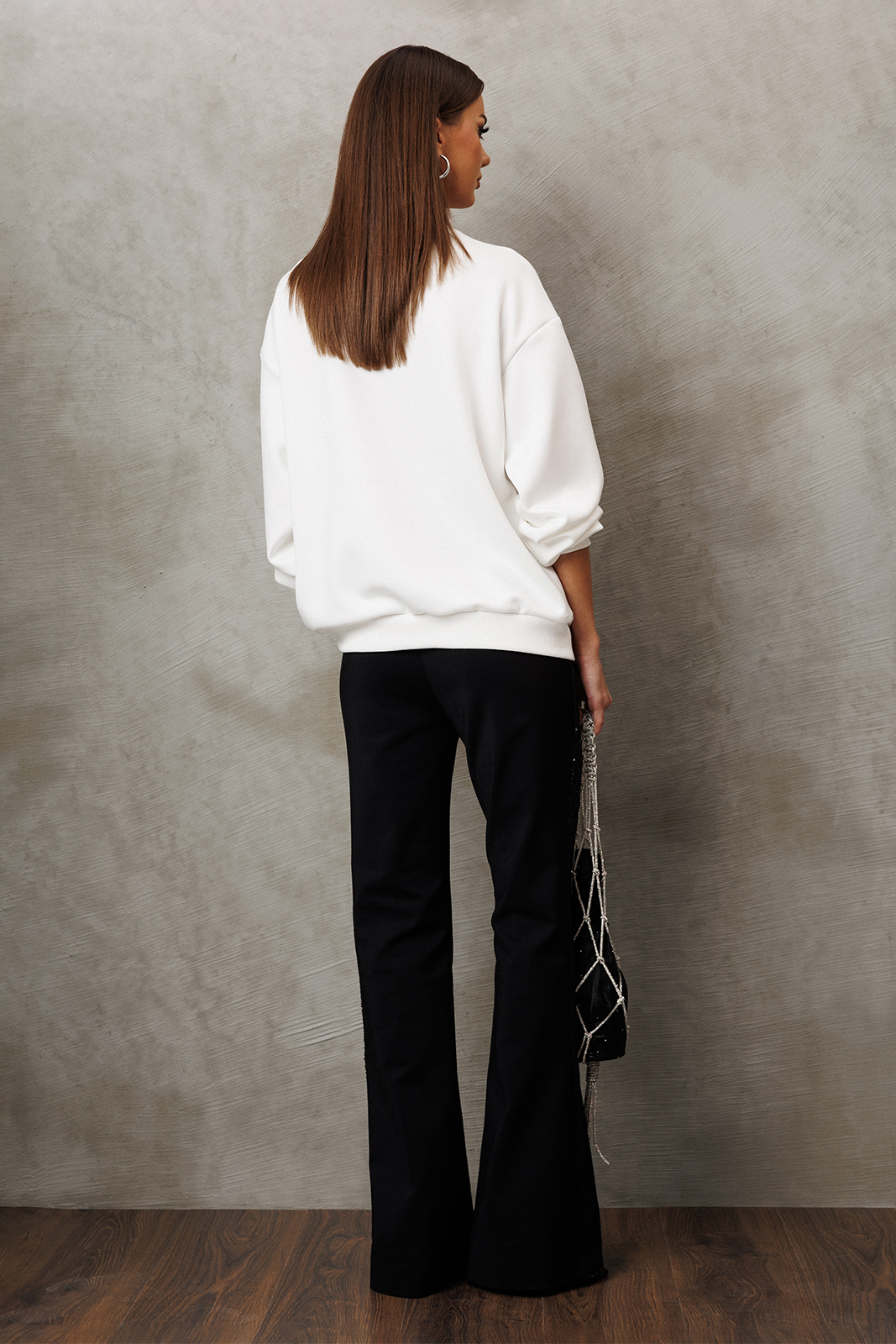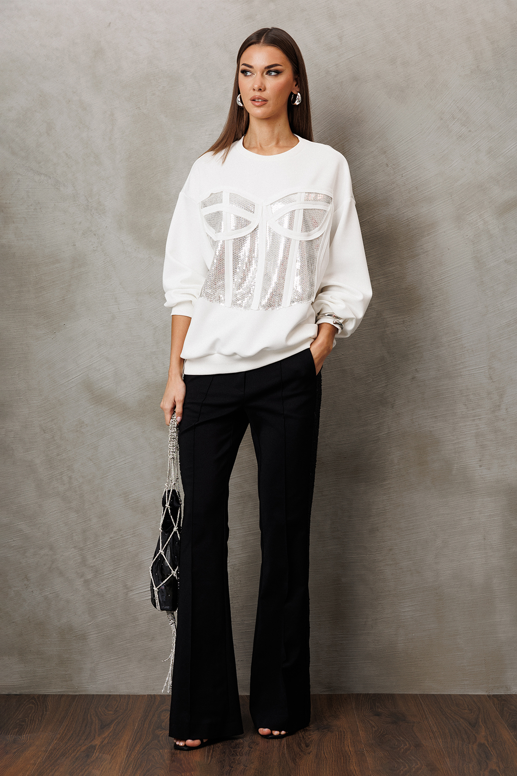 Описание: Джемпер из технологичного трикотажного полотна с эффектом peach. Прямого силуэта с втачным рукавом и спущенной линией плеча, с манжетой из отделочной ткани по низу рукава. По переду имитация корсета из пайеток. По горловине и низу изделия притачная планка из отделочной ткани.