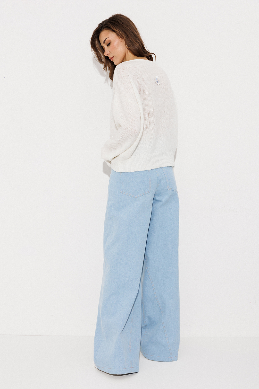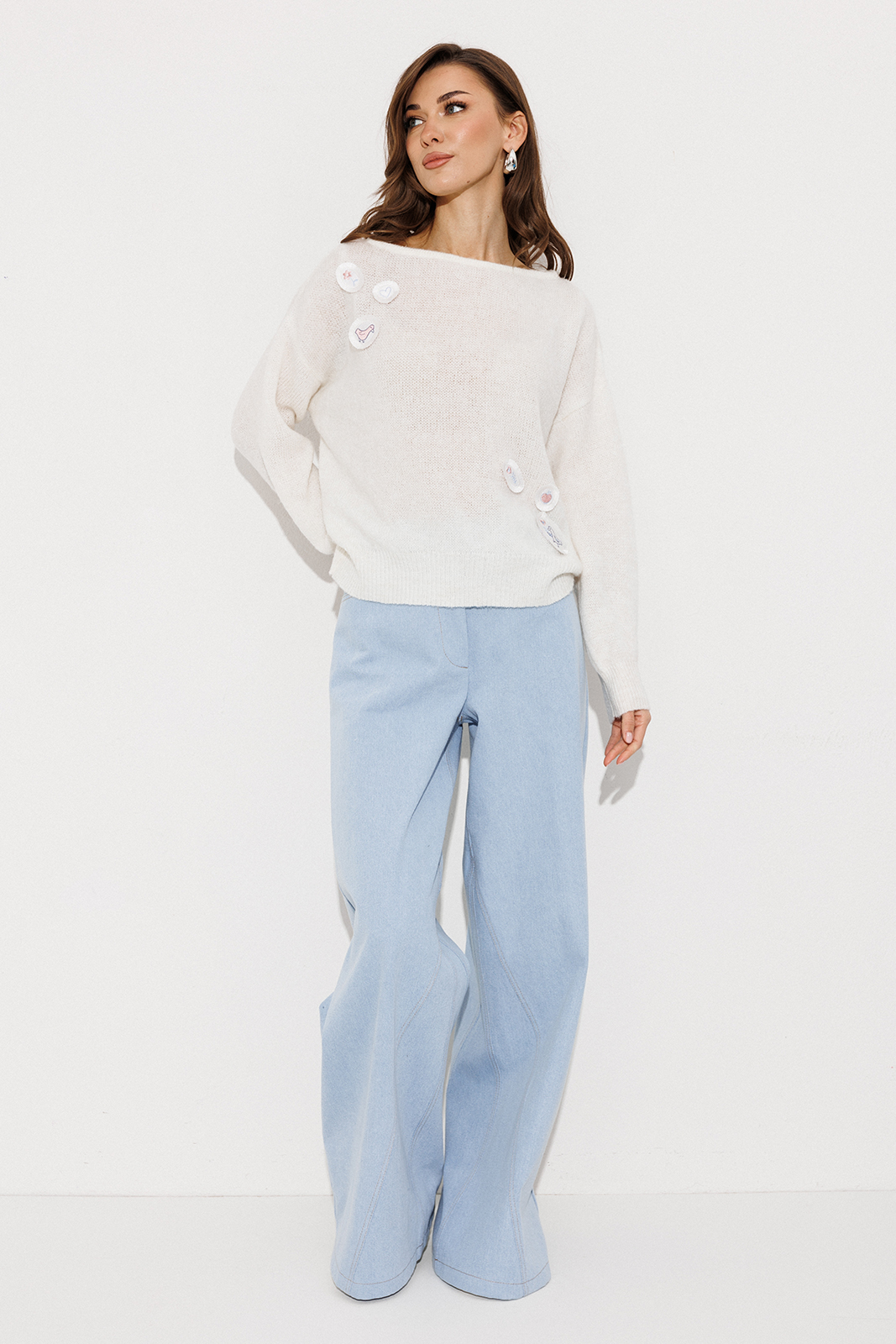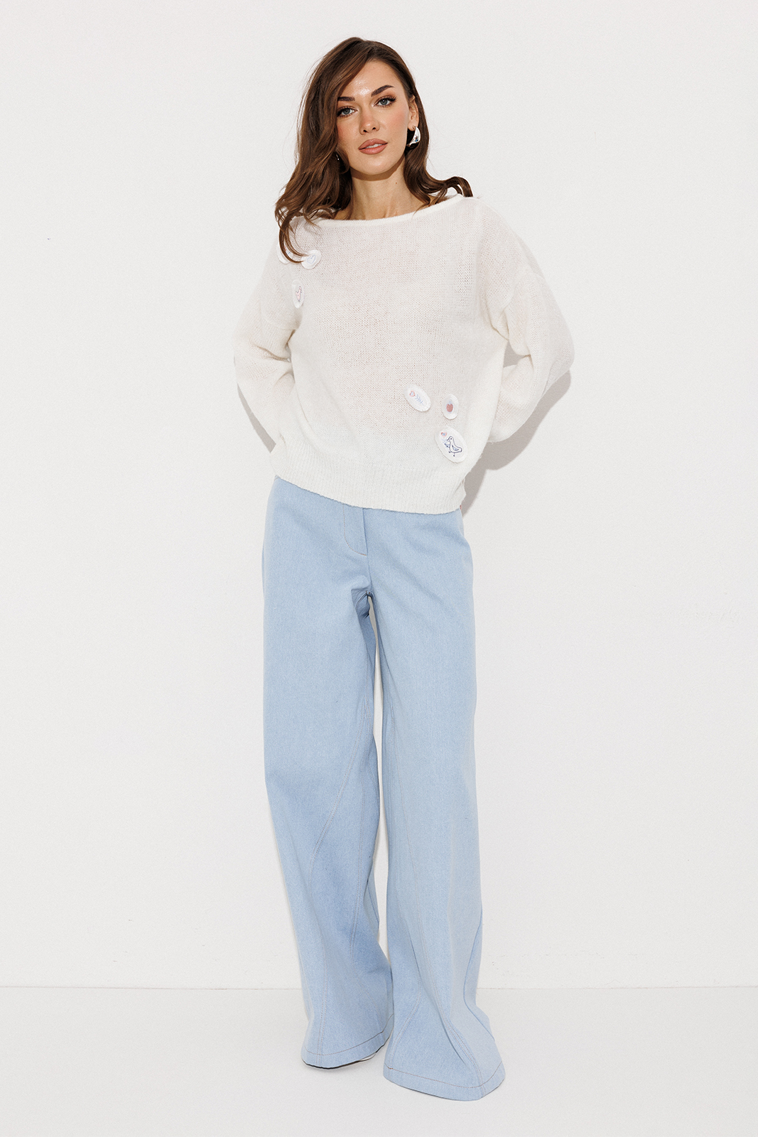 Описание: Джемпер трикотажный вязанный с втачным длинным рукавом и спущенной линией плеча. По переду и спинке нашивки. Вырез горловины круглый.