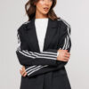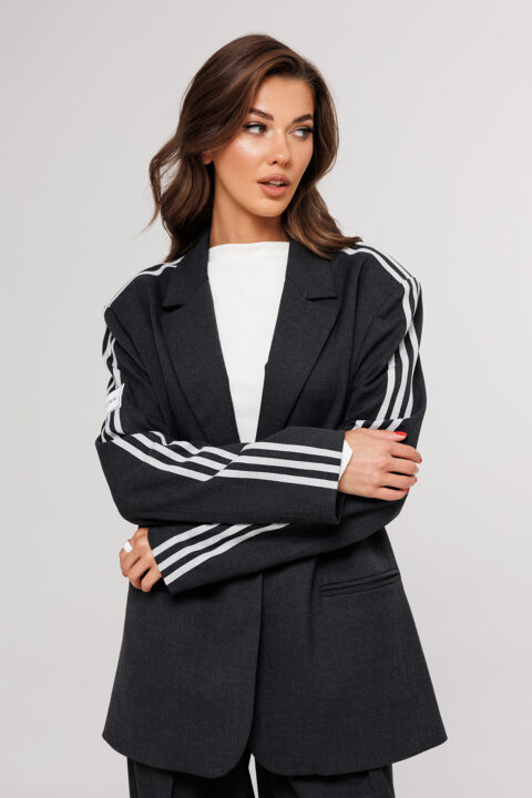 Описание: Жакет прямого силуэта, с однобортной застежкой на петлю-пуговицу, втачным двух шовным рукавом. Воротник отложной с лацканом. Полочка с отрезным бочком и талиевой вытачкой и карманом с клапанном и рамкой. Спинка со средним швом. Рукав и верх полочки и спинке (по плечу) с натрочными лампасами. На правом рукаве нашивка “BUTER”. Жакет на подкладке.