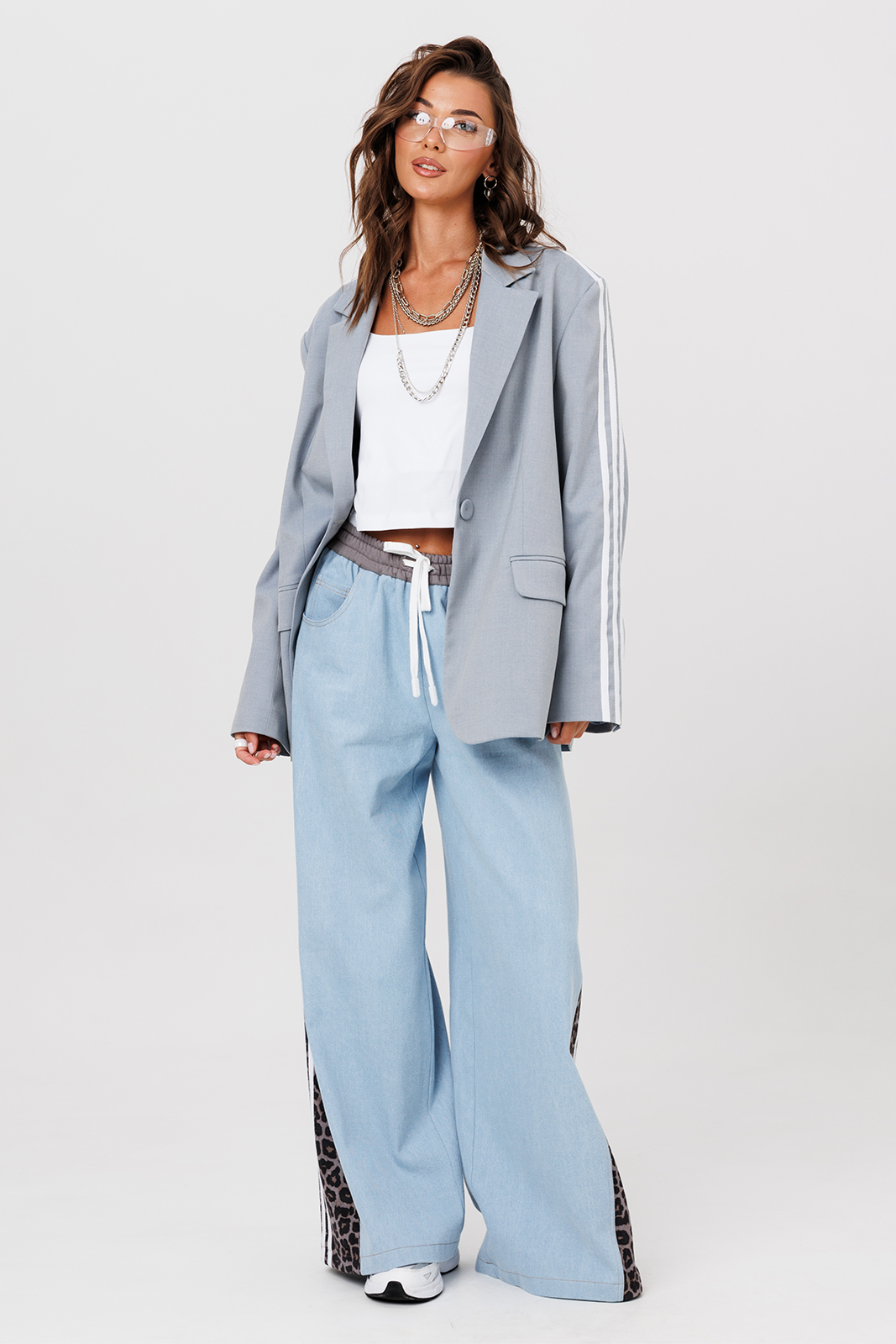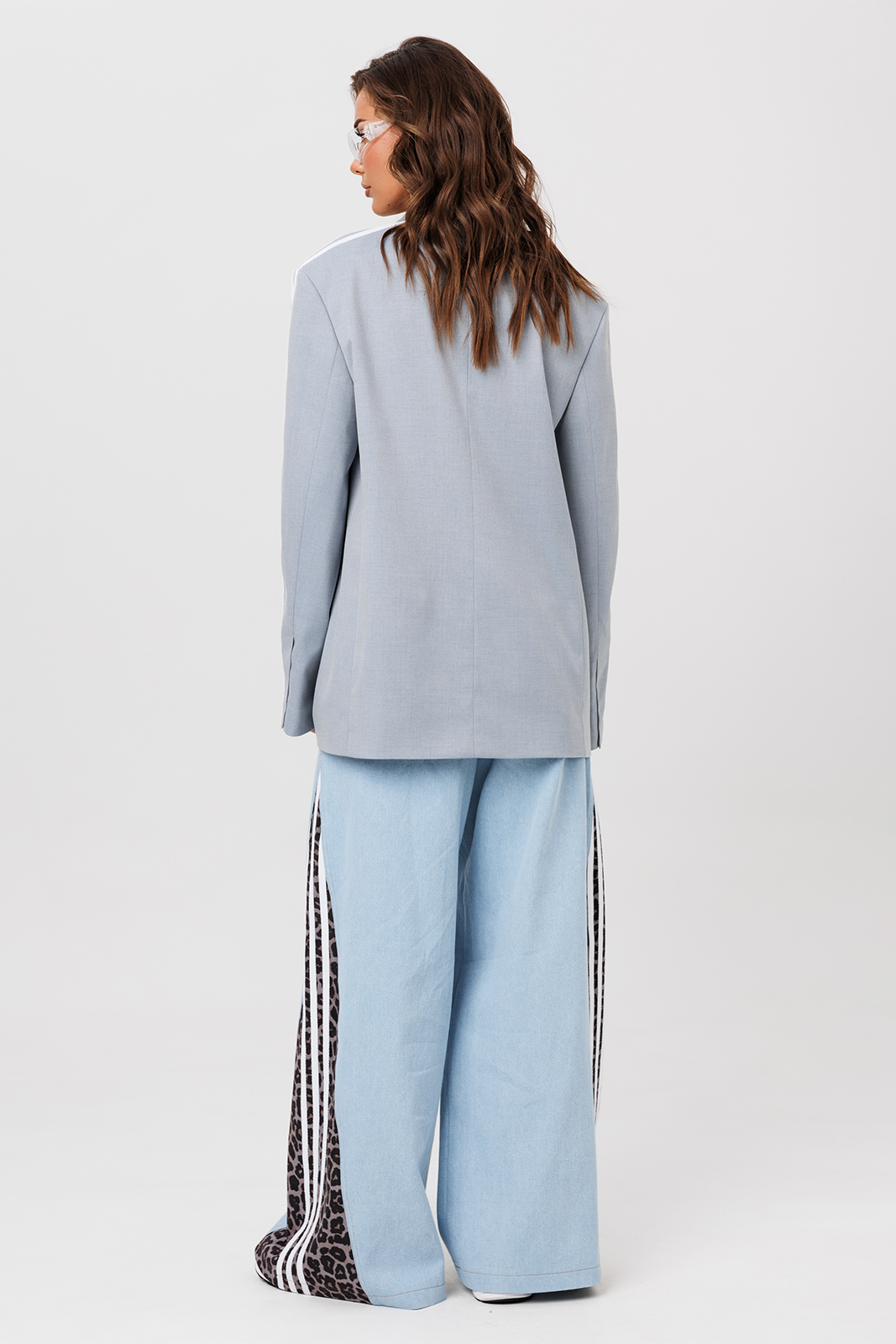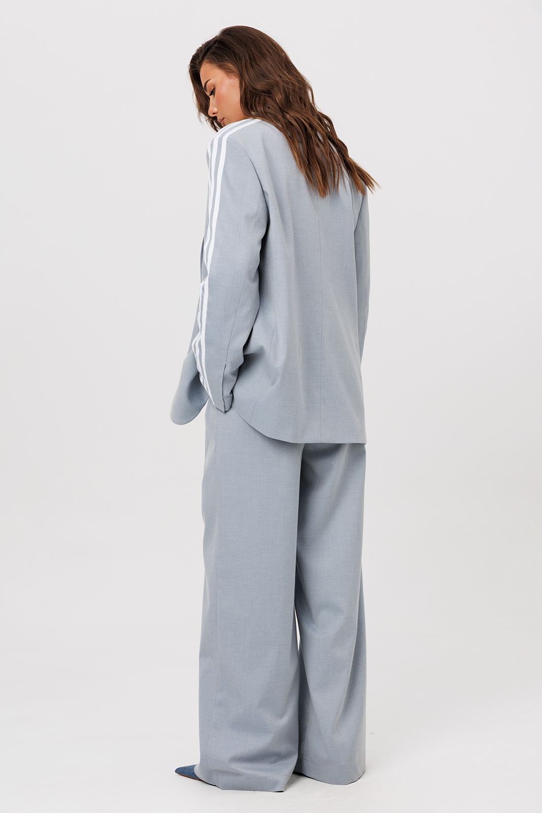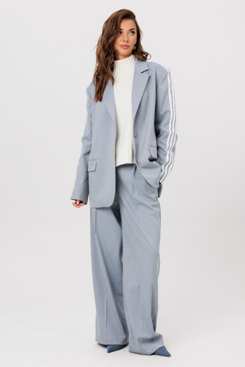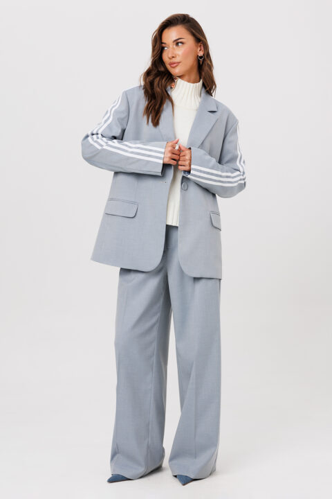 Описание: Жакет прямого силуэта, с однобортной застежкой на петлю-пуговицу, втачным двух шовным рукавом. Воротник отложной с лацканом. Полочка с отрезным бочком и талиевой вытачкой и карманом с клапанном и рамкой. Спинка со средним швом. Рукав и верх полочки и спинке (по плечу) с натрочными лампасами. Жакет на подкладке.