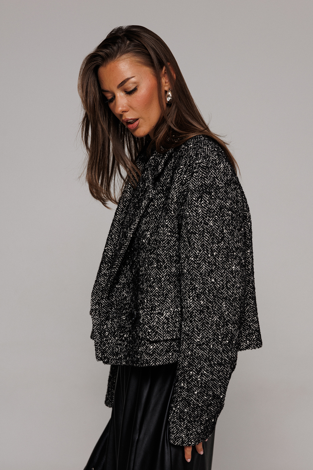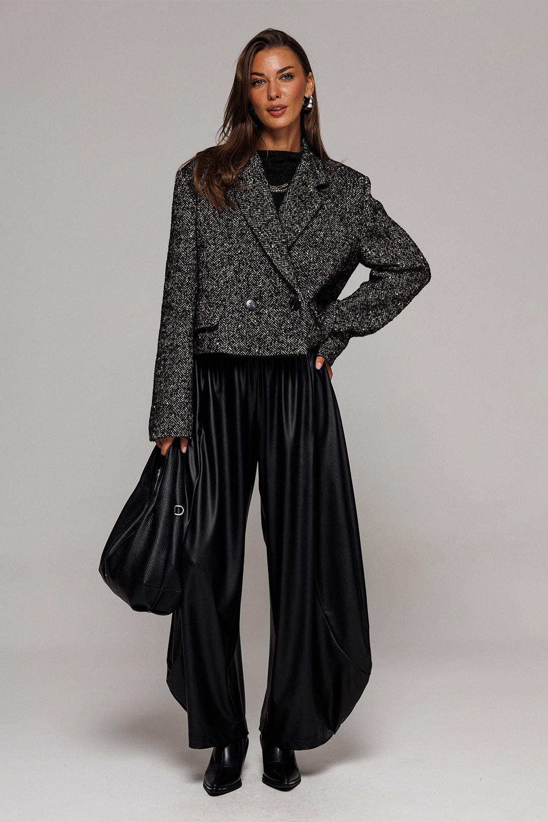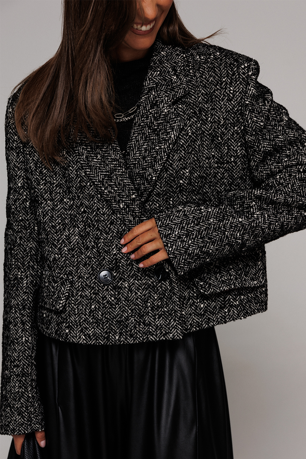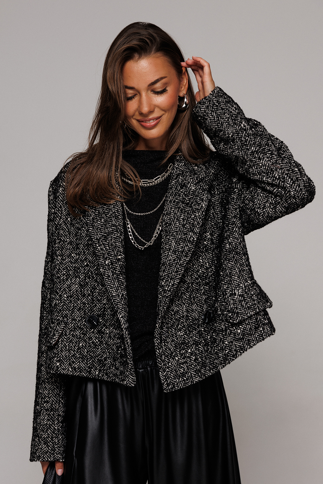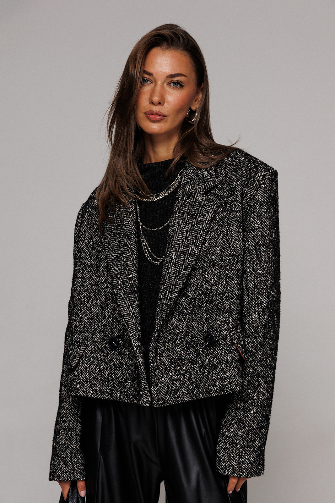 Описание: Жакет укороченный прямого силуэта, двубортный с втачным двухшовным рукавом. Полочка с застежкой на петлю-пуговицу и имитацией кармана с клапаном и отрезным бочком. Спинка с отрезным бочком и центральным швом. Воротник пиджачного типа с отрезной стойкой. Жакет на подкладке.