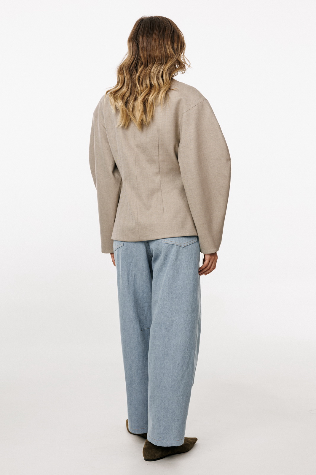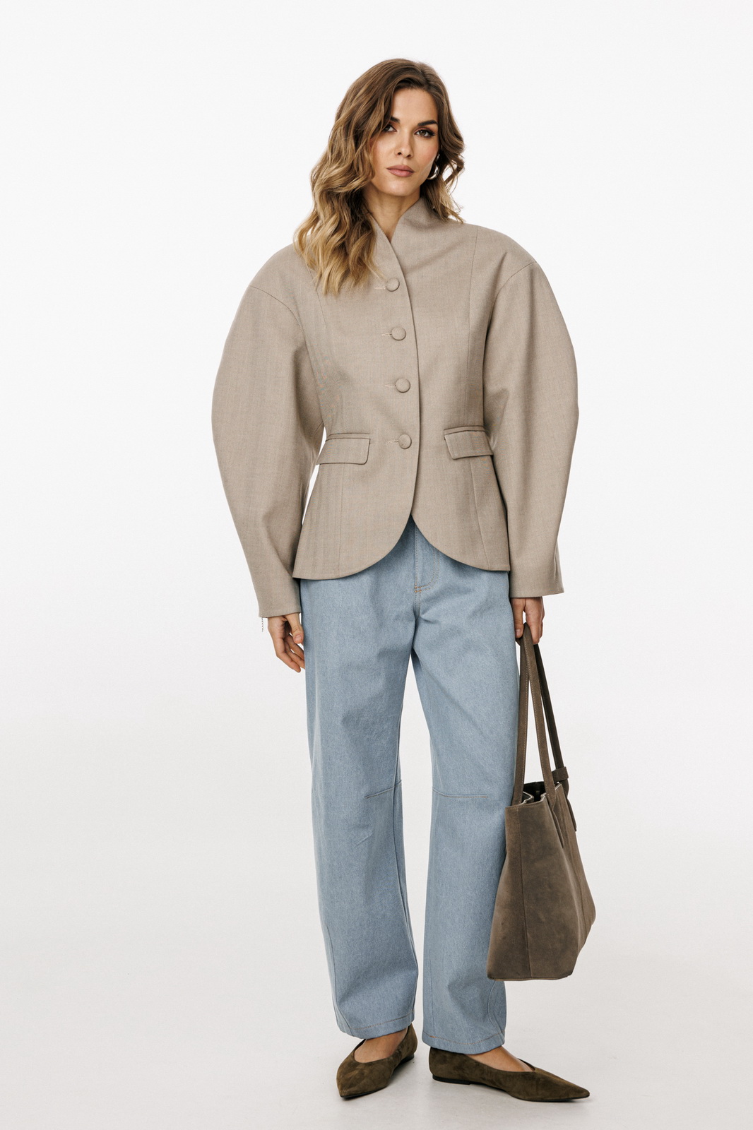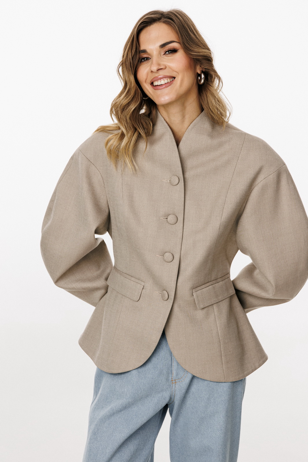 Описание: Жакет выполнен из костюмной ткани. Жакет О-образного силуэта, длиной до линии бедер. По переду обработаны рельефы от плечевого шва до низа, прорезные карманы с клапанами, и центральная бортовая застежка на 4 петли и пуговицы. Низ борта округлой формы. На спинке обработаны два рельефа от горловины до низа и средний шов. Горловина округлой формы, обработана цельнокроеным воротником-стойкой. Плечевой шов удлинен. Рукав фигурной формы, двухшовный, заужен к низу. Жакет с плечевыми накладками.