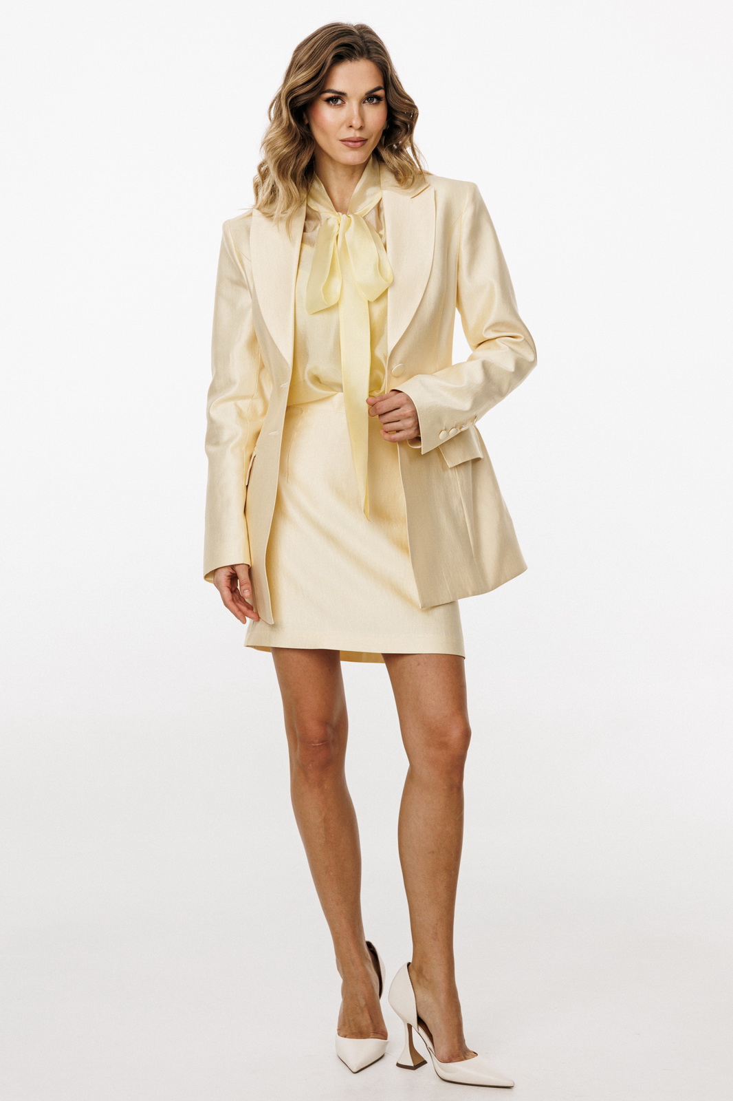 Описание: Жакет выполнен из костюмной ткани. Жакет Х-образного силуэта, длиной ниже линии бедер. Спереди рельефы от проймы до низа, прорезные карманы с клапанами и центральная бортовая застежка на пуговицы. Воротник пиджачного типа. На спинке средний шов. Плечевой шов удлинен. Жакет с плечевыми накладками. Рукав втачной, двухшовный, по низу заднего шва шлица с застежкой на пуговицы. Жакет на притачной по низу подкладке.