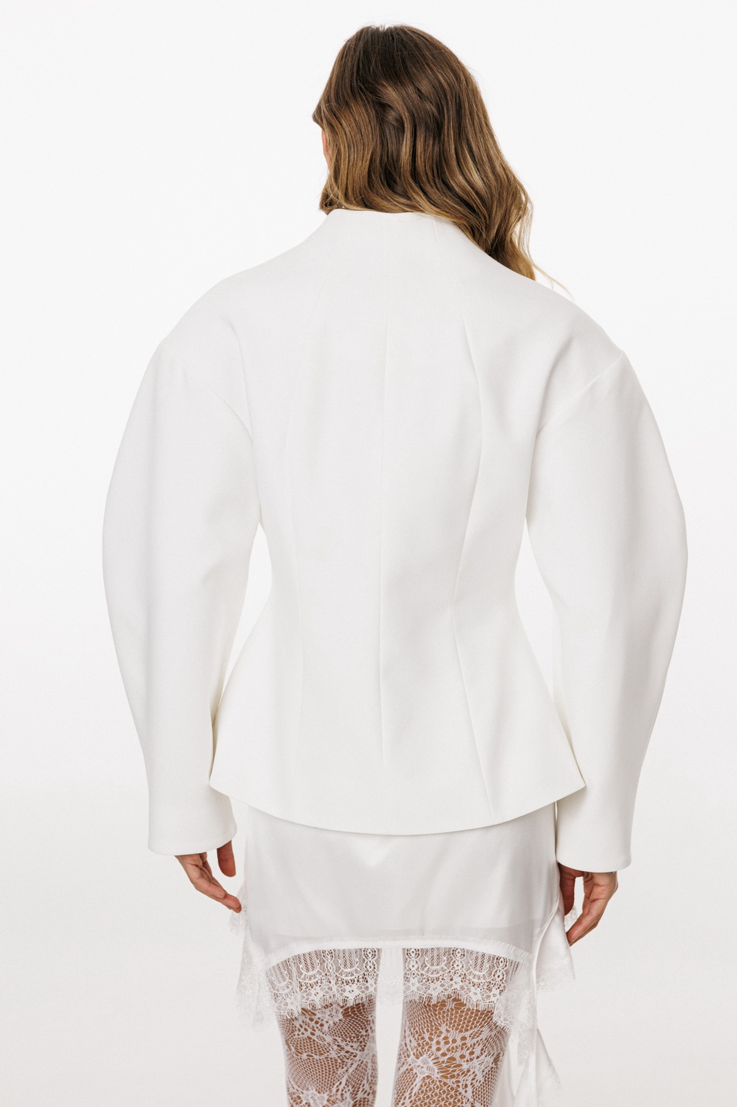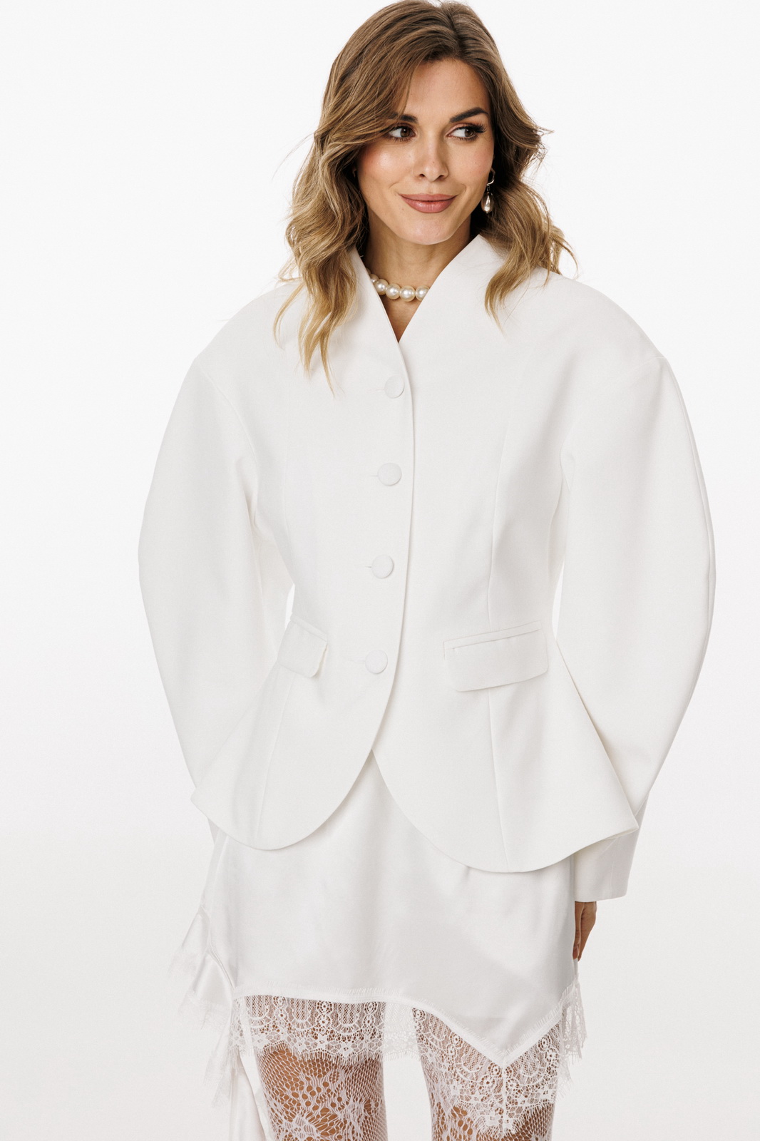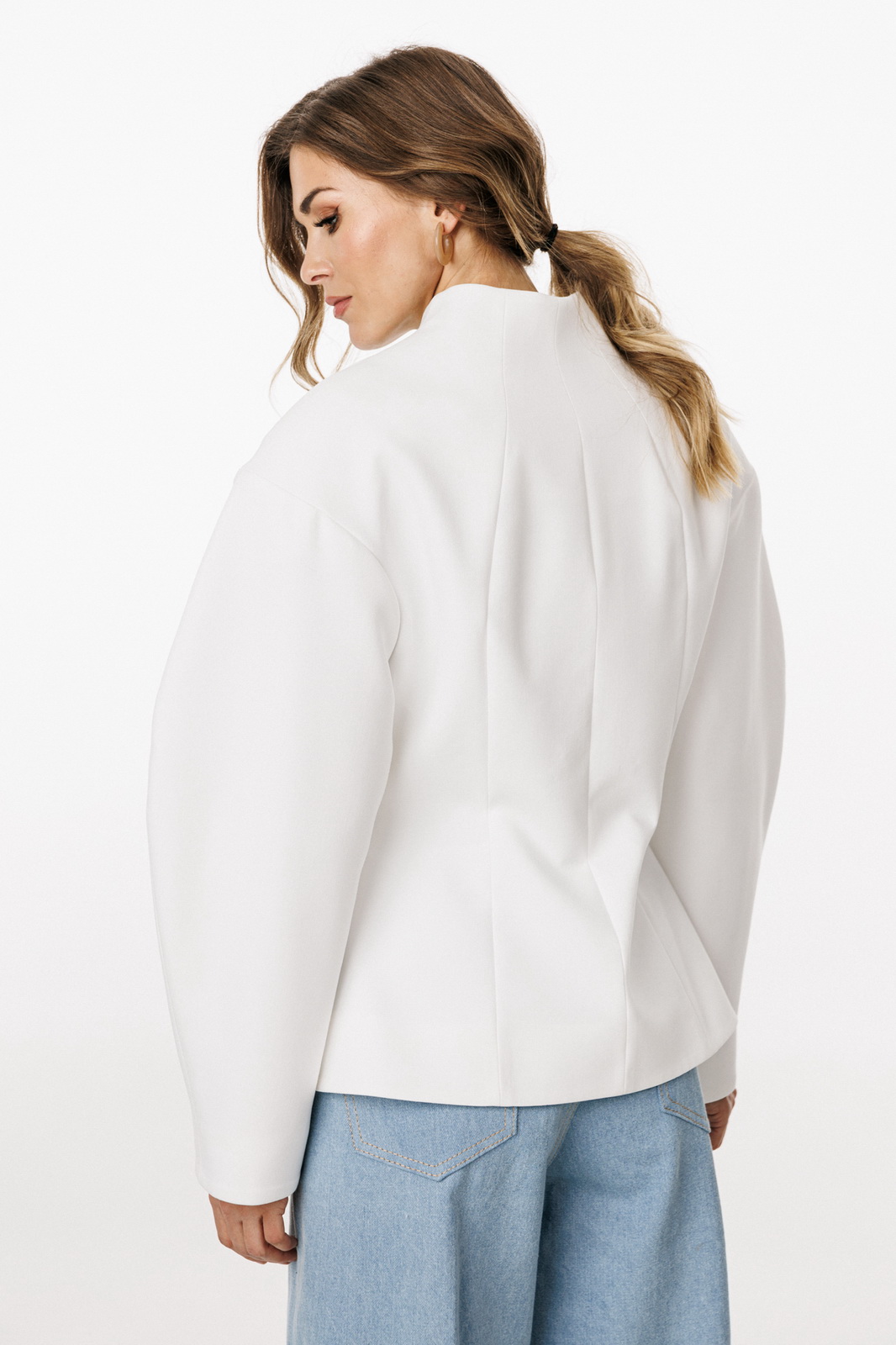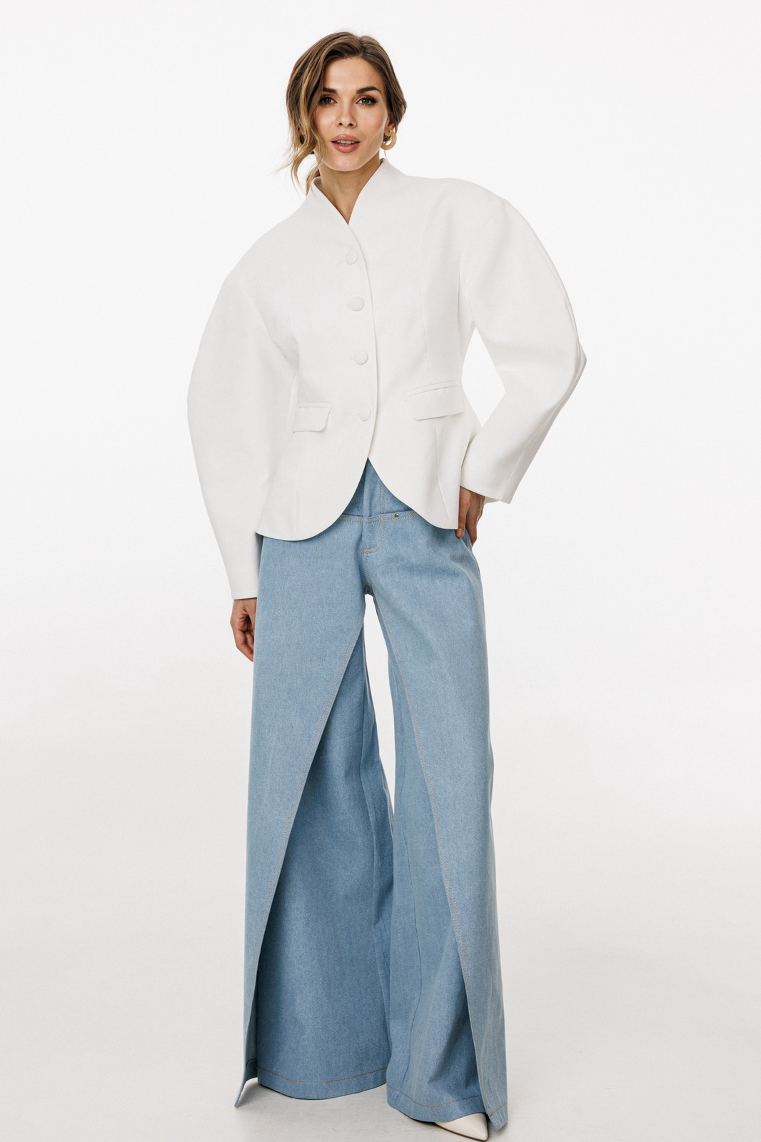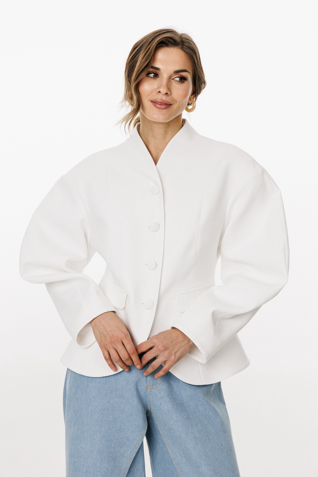 Описание: Жакет выполнен из костюмной ткани. Жакет О-образного силуэта, длиной до линии бедер. По переду обработаны рельефы от плечевого шва до низа, прорезные карманы с клапанами, и центральная бортовая застежка на 4 петли и пуговицы. Низ борта округлой формы. На спинке обработаны два рельефа от горловины до низа и средний шов. Горловина округлой формы, обработана цельнокроеным воротником-стойкой. Плечевой шов удлинен. Рукав фигурной формы, двухшовный, заужен к низу. Жакет с плечевыми накладками.